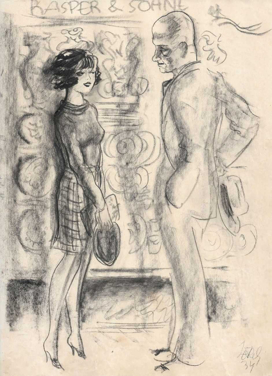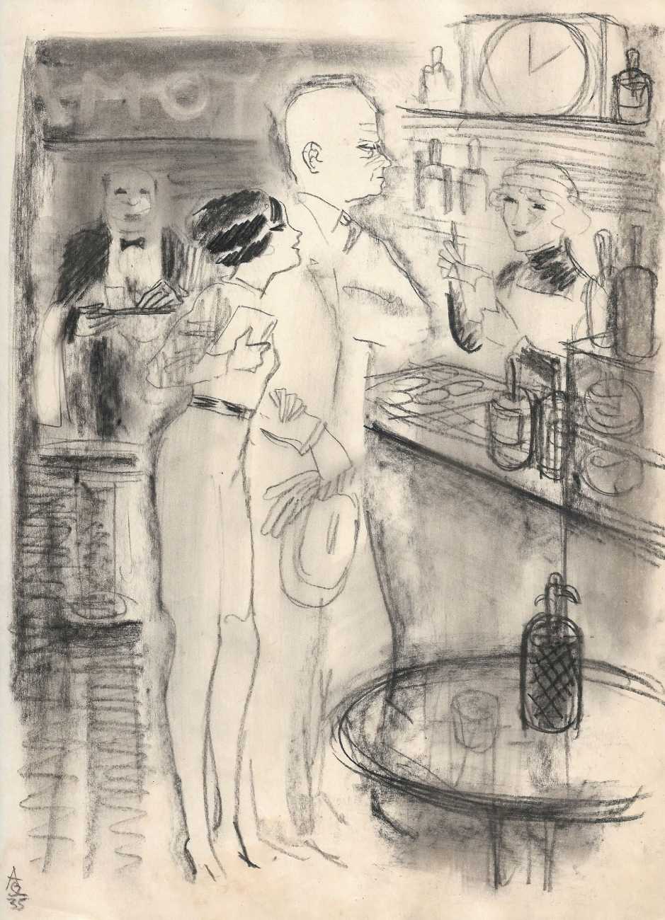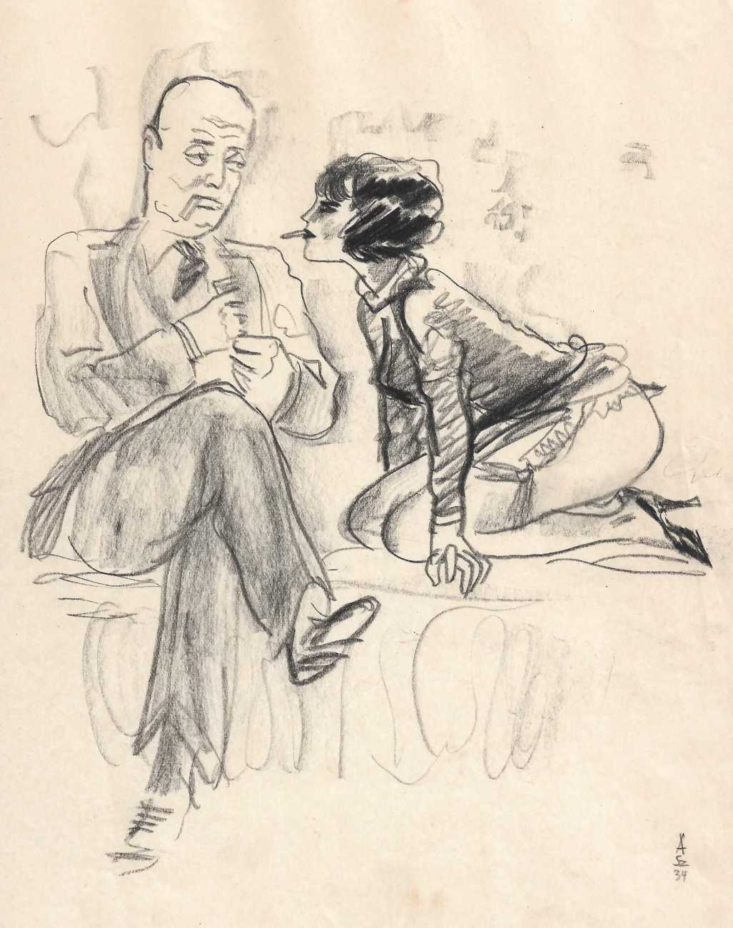 Alexander Székely was born and grew up in Budapest, and started his artistic life as a street artist in Vienna, selling rapidly-drawn portraits and caricatures to make a living. This skill was noticed in the early 1930s by directors at the city’s many cabarets; between 1931 and 1933 he was working with Stella Kadmon at Der Liebe Augustin, and between 1934 and 1937 with Hans Margulies at the ABC. His ‘portraits in minutes’ became an integral part of the cabaret experience for many of their clientele.
