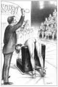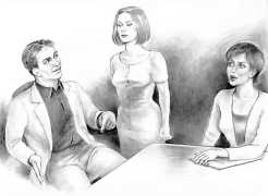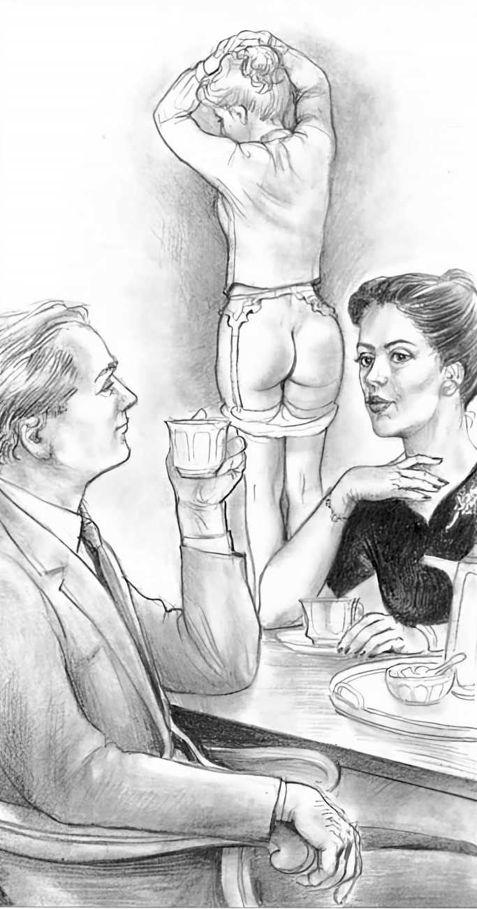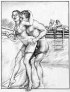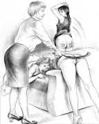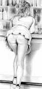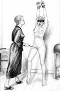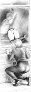 Russell’s drawing style is realistic, carefully-drawn detailed drawings in pencil and ink. In her coloured works she uses crayons and occasionally pastels, as in a series of fantastic body landscapes (‘bodyscapes’), probably her most ambitious works, in which female bodies are seen as part of landscapes. In her drawings she often appears as self-portraits, and some of her picture stories have an autobiographical background. In How I discovered CP she describes how she first encountered the world of the BDSM in the style of The Story of O, and a similar scenario appears in Sophisticated Ladies.
