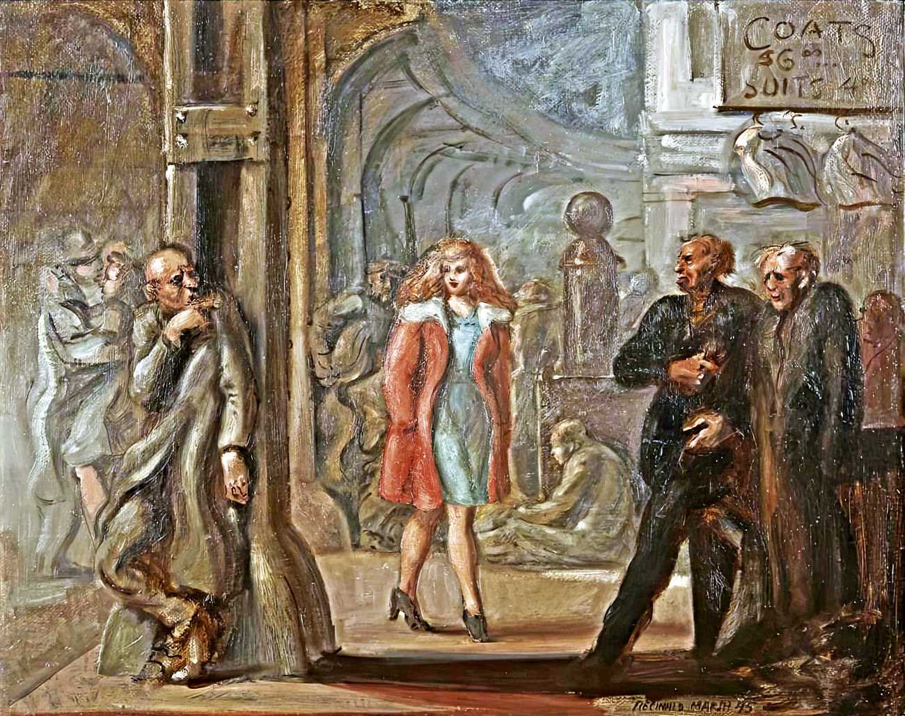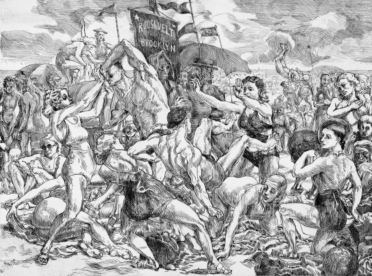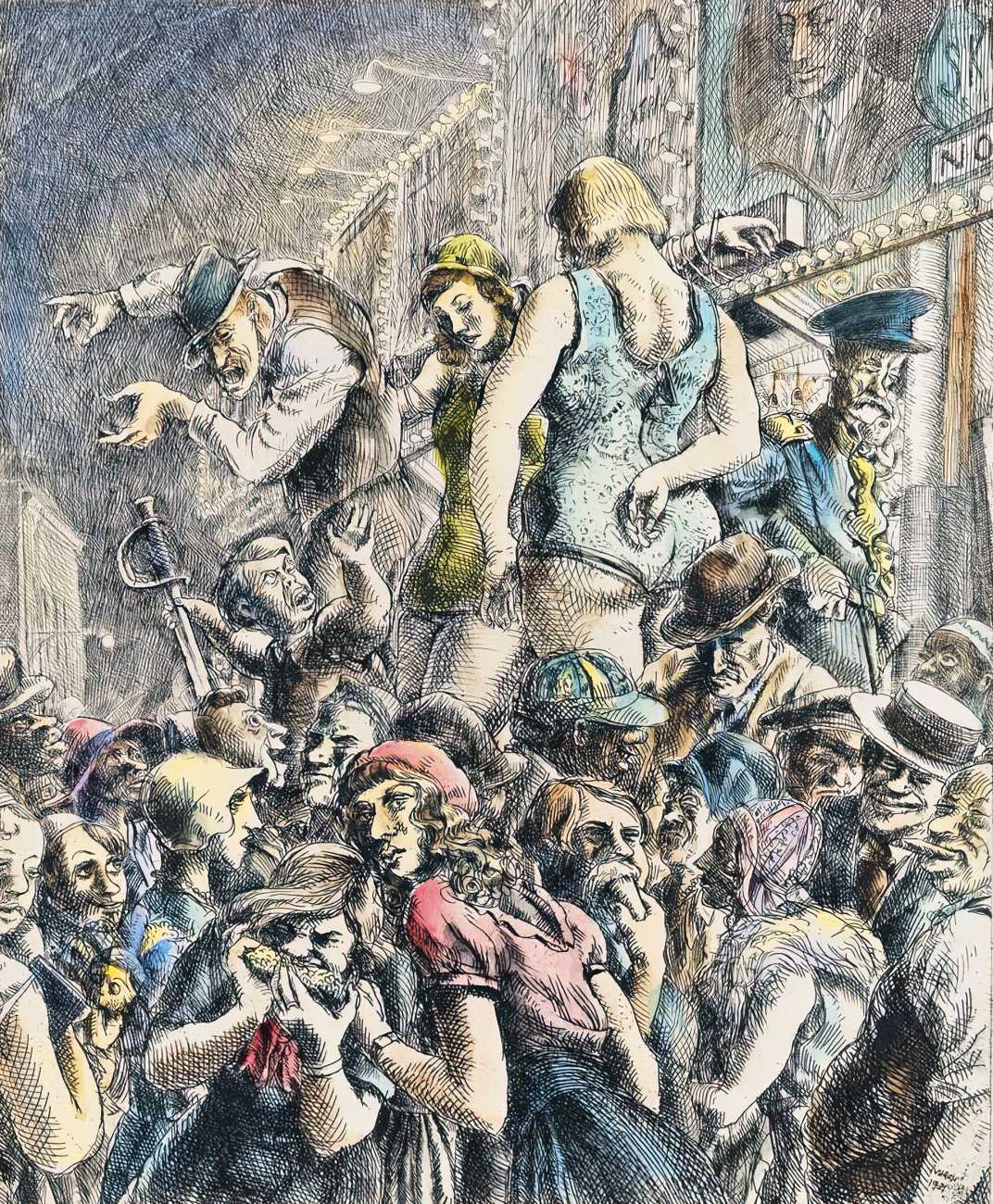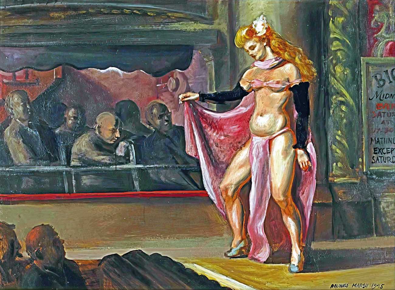 Reginald Marsh rejected modern art, which he found sterile. His work depicted the Great Depression and a range of social classes whose division was accentuated by the economic crash. His main attractions were the burlesque stage, the hobos on the Bowery, crowds on city streets and at Coney Island, and women.