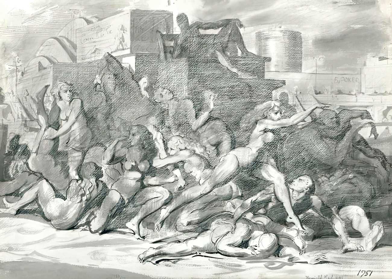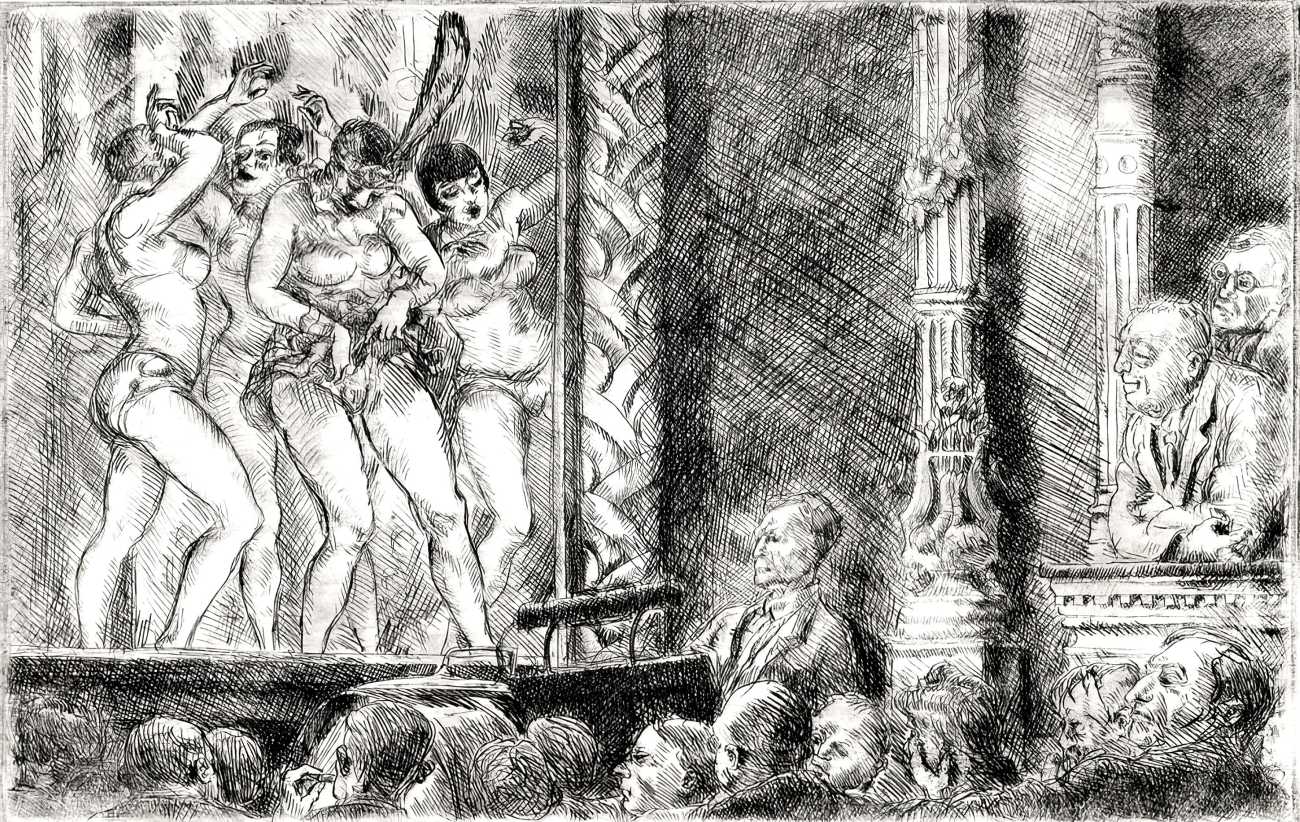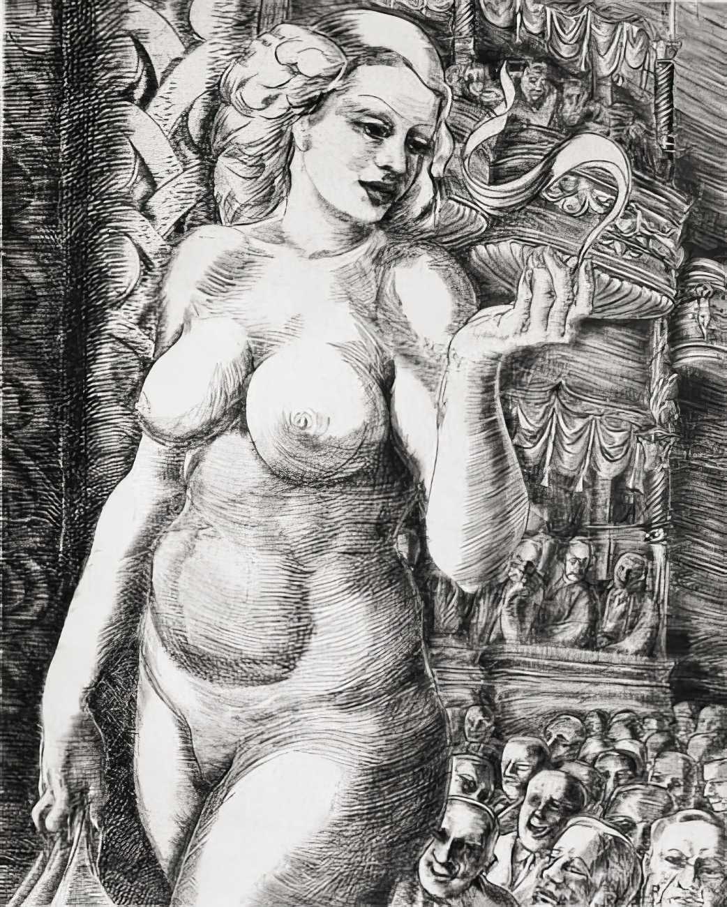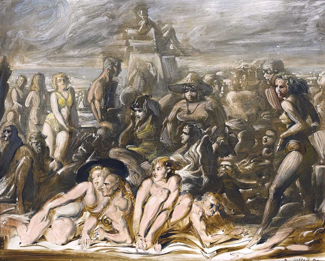 Reginald Marsh rejected modern art, which he found sterile. His work depicted the Great Depression and a range of social classes whose division was accentuated by the economic crash. His main attractions were the burlesque stage, the hobos on the Bowery, crowds on city streets and at Coney Island, and women.