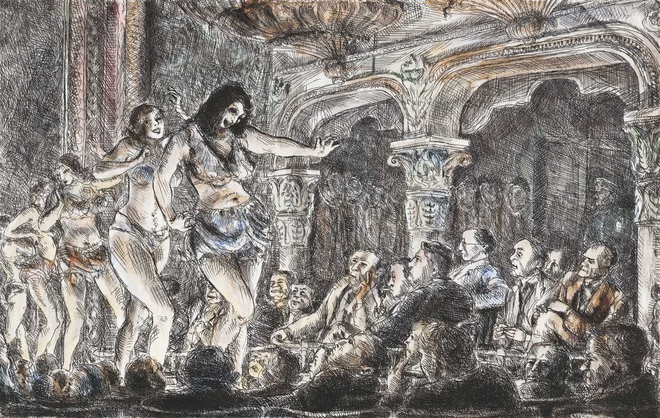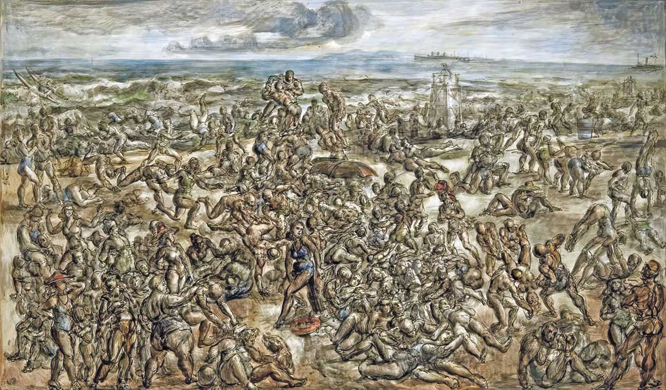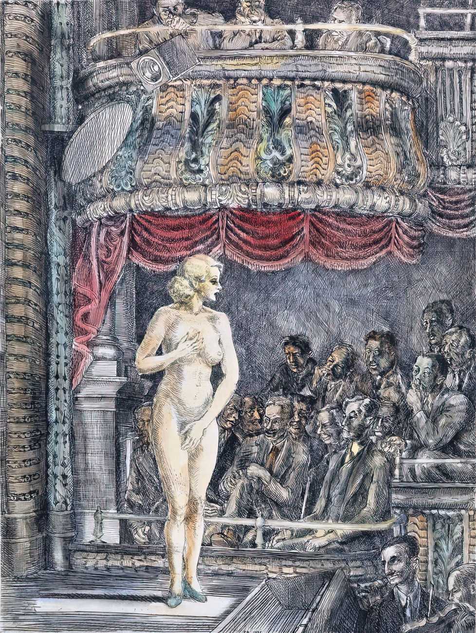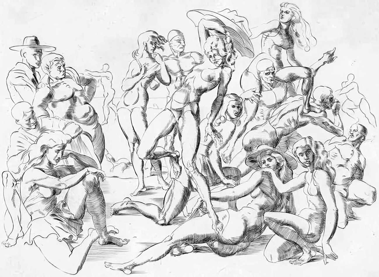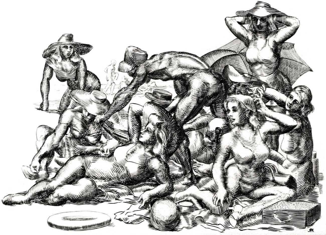 Reginald Marsh rejected modern art, which he found sterile. His work depicted the Great Depression and a range of social classes whose division was accentuated by the economic crash. His main attractions were the burlesque stage, the hobos on the Bowery, crowds on city streets and at Coney Island, and women.
