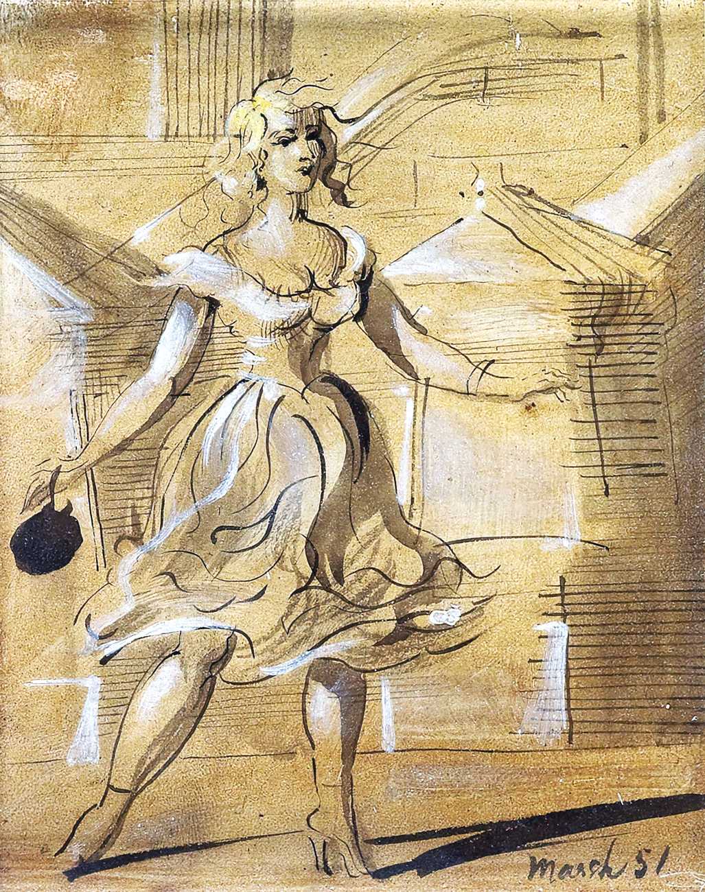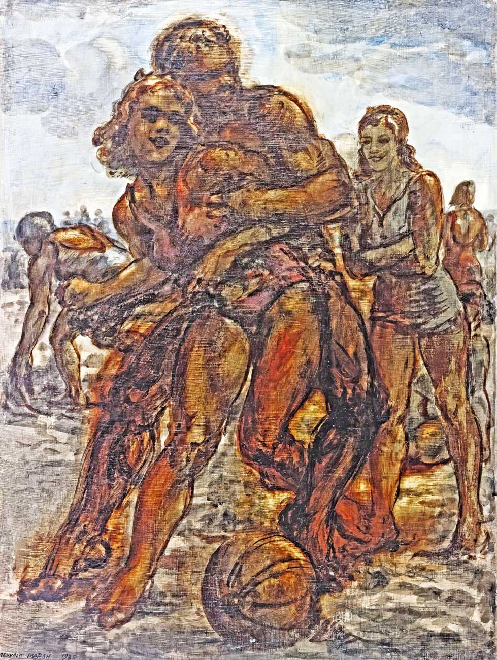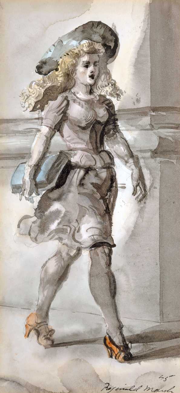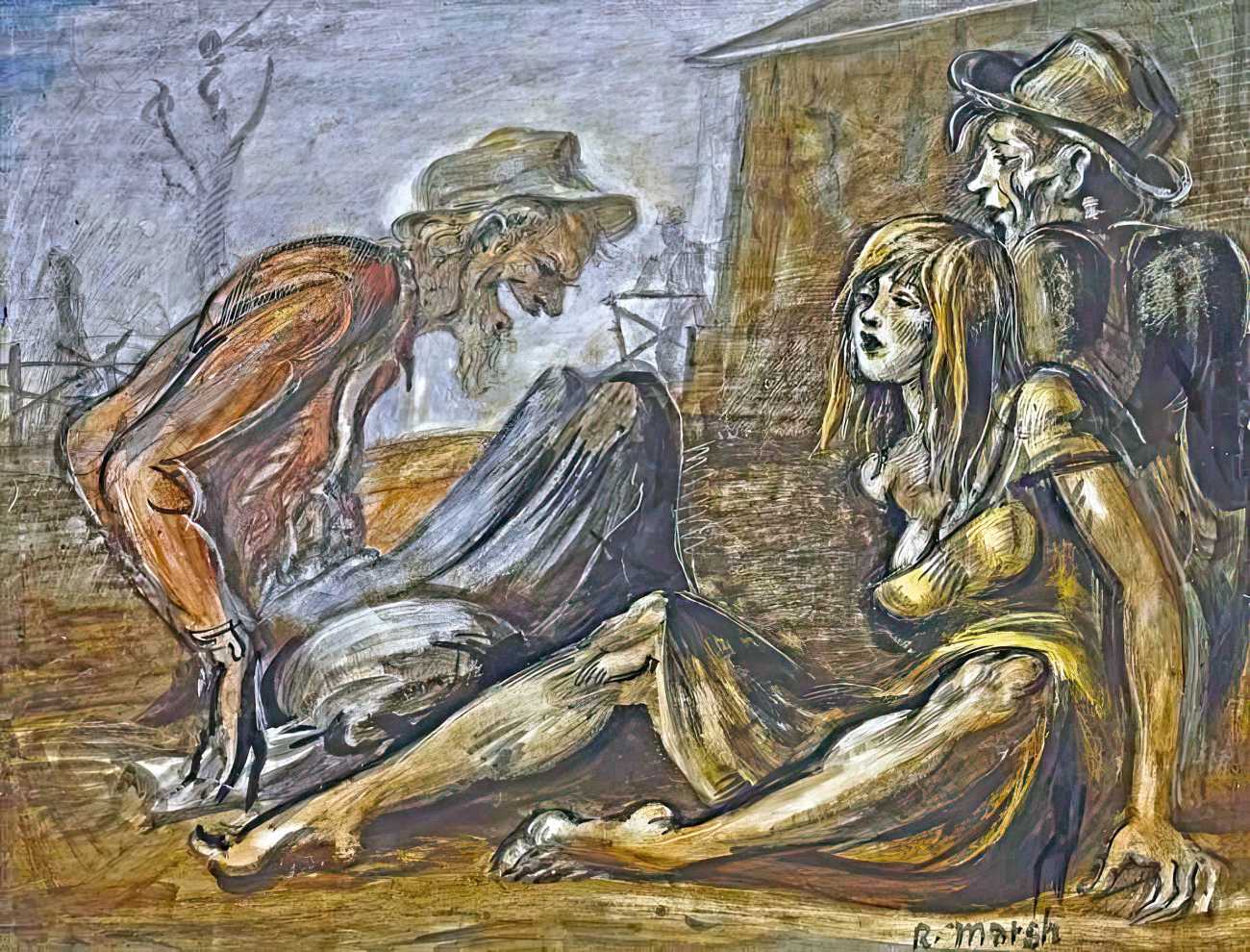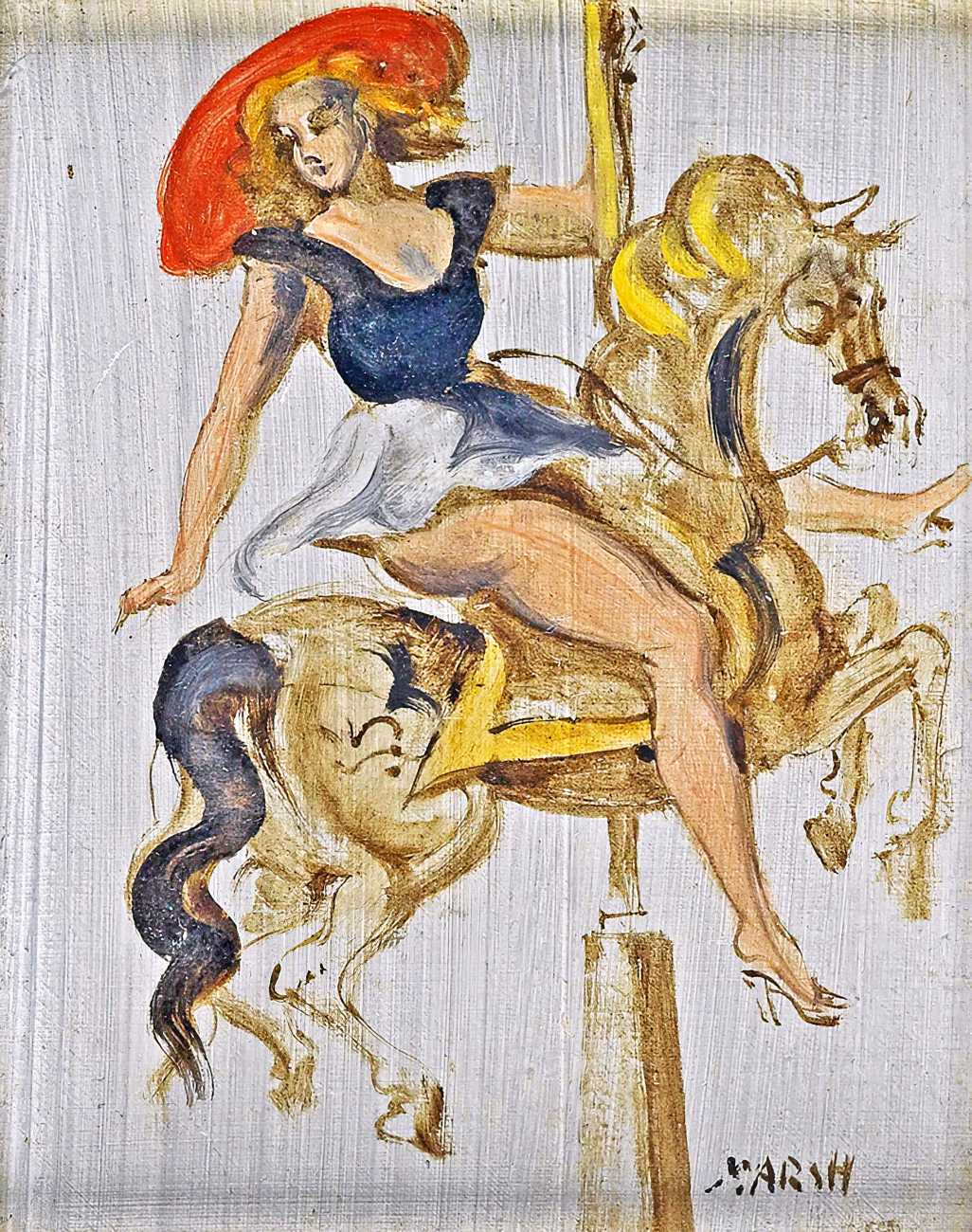 Marsh then studied under Kenneth Hayes Miller at the Art Students League of New York, who looked at Marsh’s early, awkward burlesque sketches and at his more conventional landscape watercolours, and told him ‘These awkward things are your work. These are real. Stick to them and don’t let anyone dissuade you!’