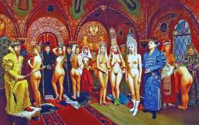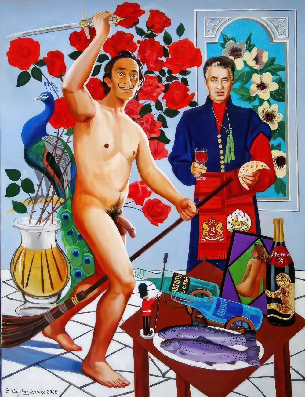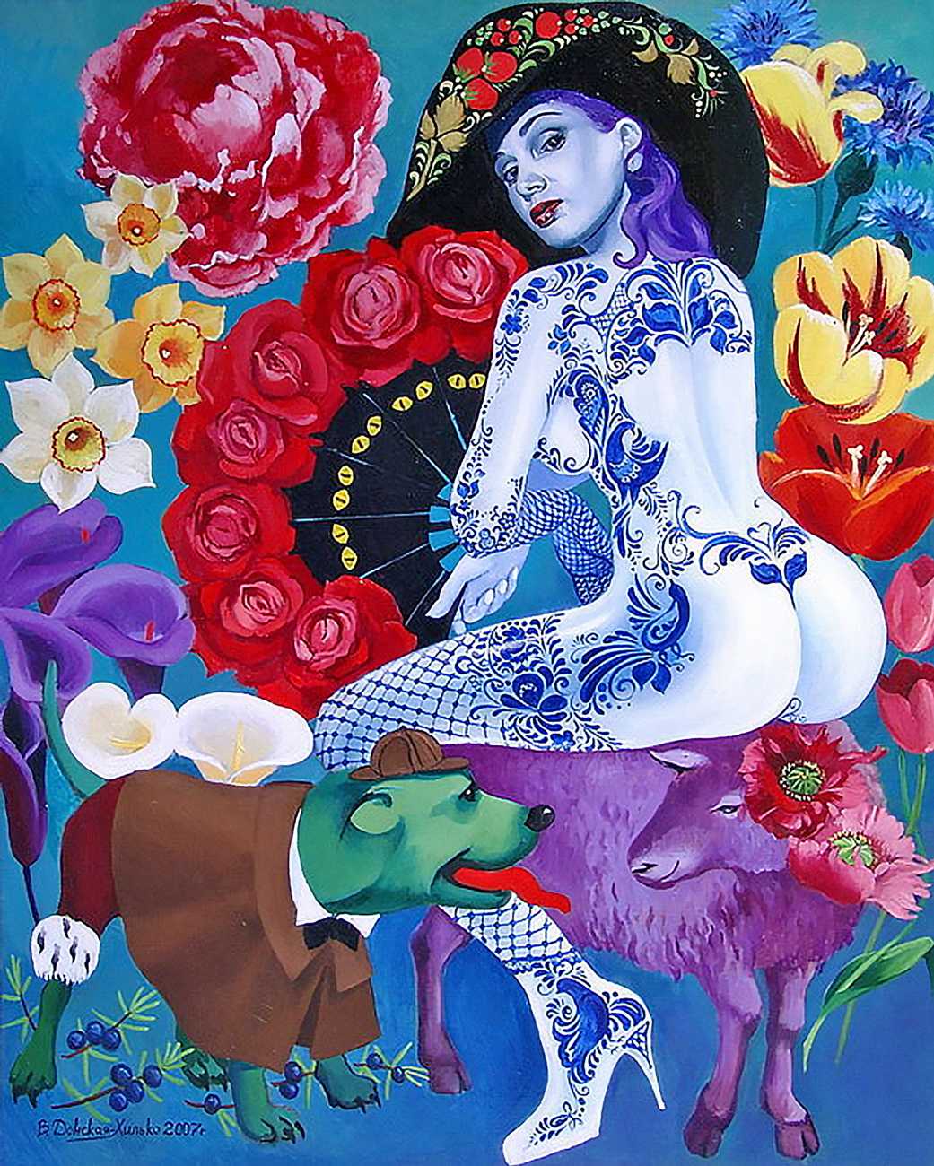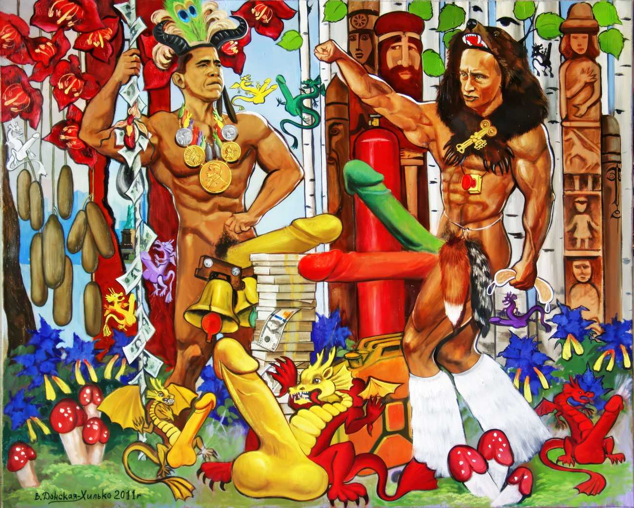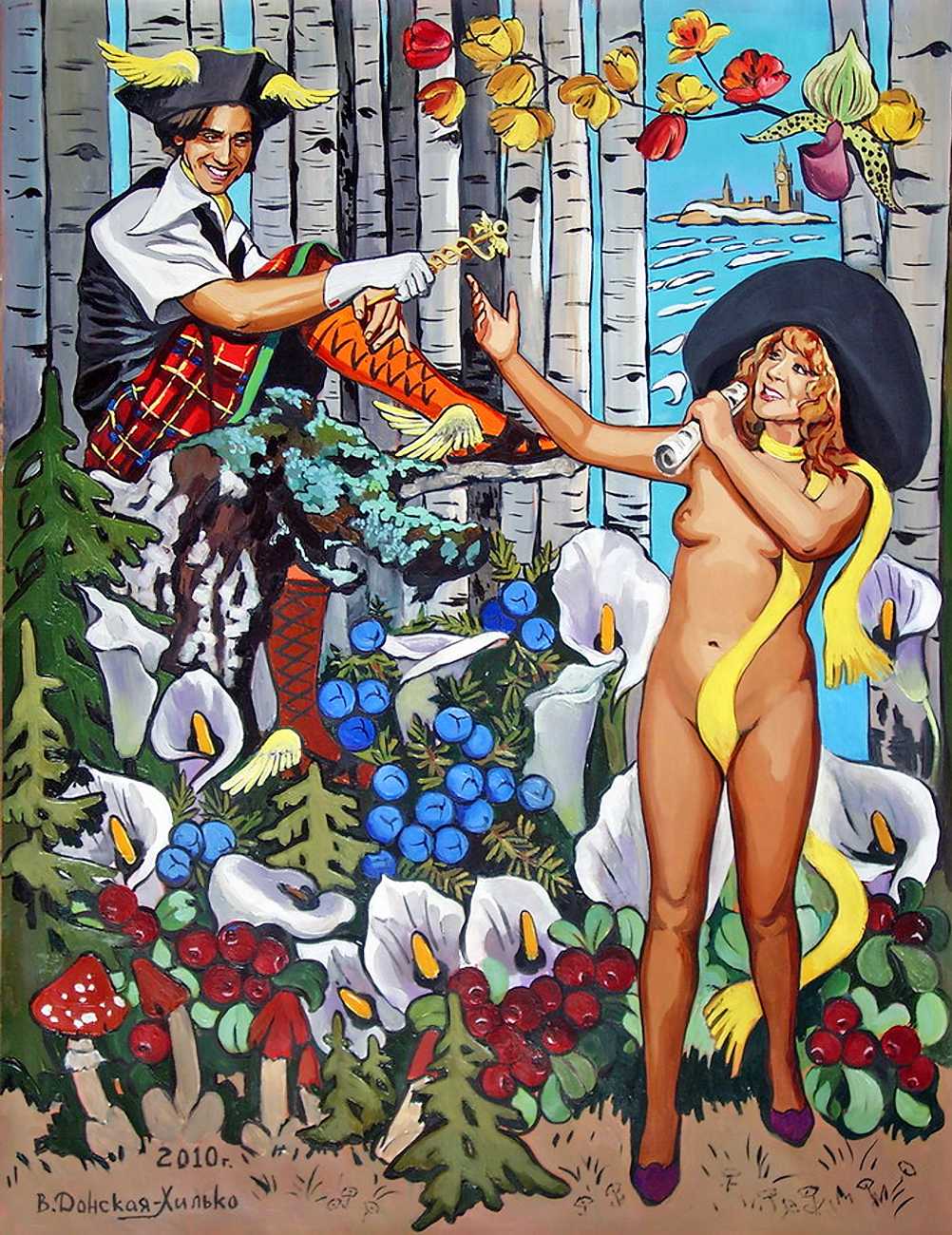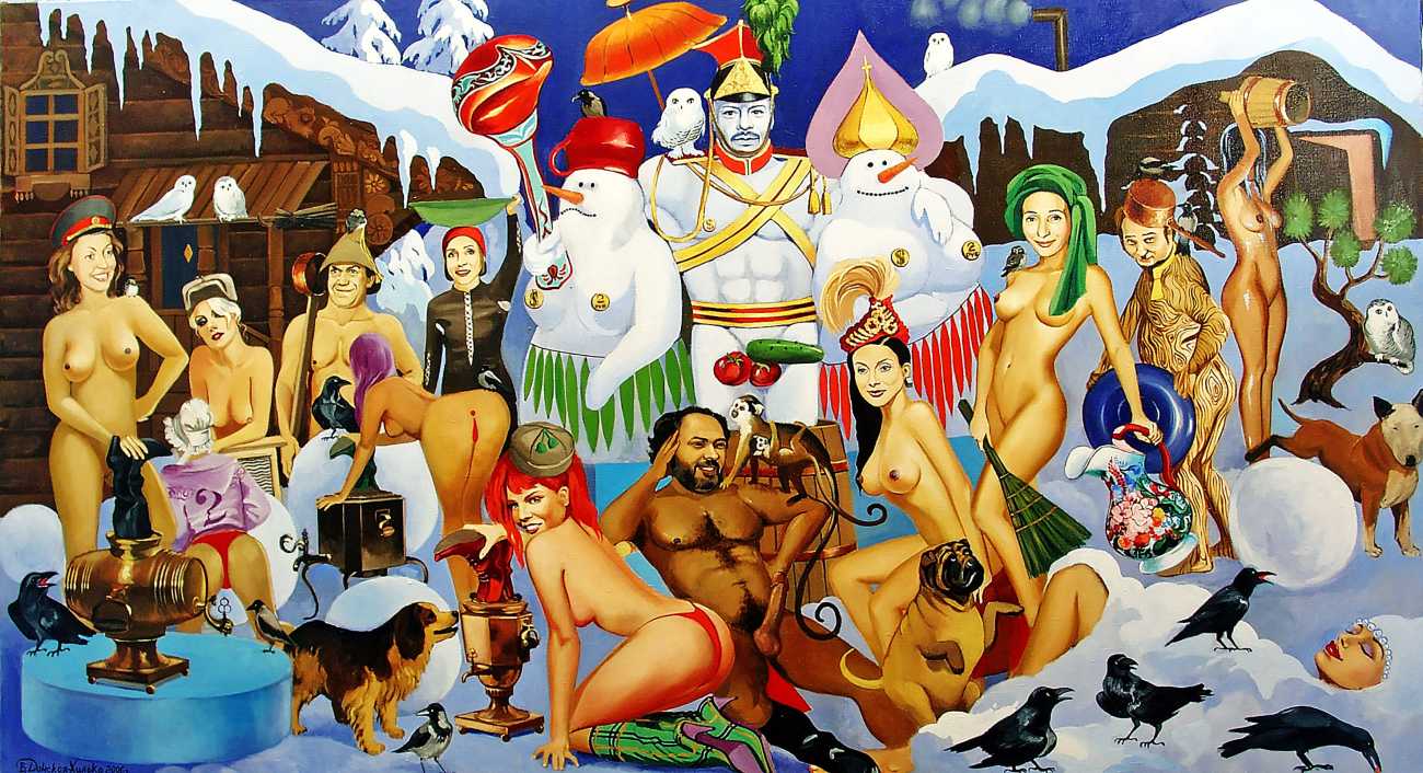 The Russian painter Vera Vasilievna Donskaya-Khilko clearly has an affinity for the naked human body and what it can get up to, but the official, sanitised description of her work on her website describes it as ‘aiming to depict the historical truth of her country within the broader context of world events, reflecting historical epochs through symbolic and metaphorical imagery’. In good Soviet-era practice she tells us all about her family history (great-grandfather the opera singer Lavrenty Dmitrievich Donskoy, maternal grandmother Donskaya Maria Nikolaevna a teacher of Russian and literature, maternal grandfather Basnev Alexander Ivanovich a school director, mother the economist Lobashkova Inna Aleksandrovna, father Lobashkov Vasily Pavlovich a veteran of the Great Patriotic War and senior engineer at the Academy of Sciences who produced equipment for spaceships, husband Gennady Anatolyevich Khilko an architect specialising in bridge and tunnel construction, daughter Lyudmila also an artist and illustrator), before modestly returning to her own career.