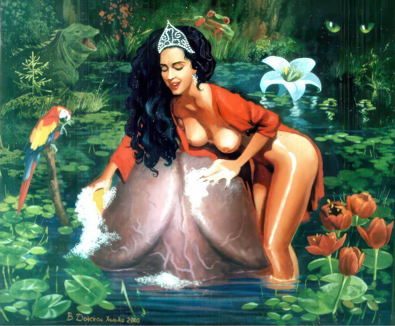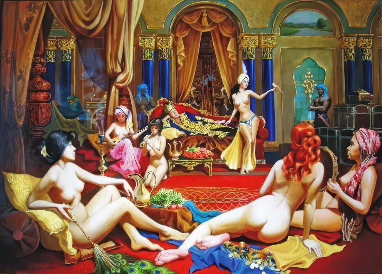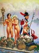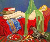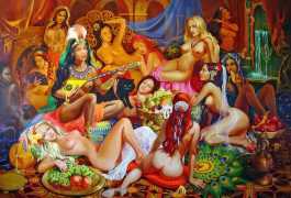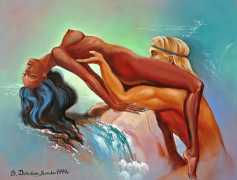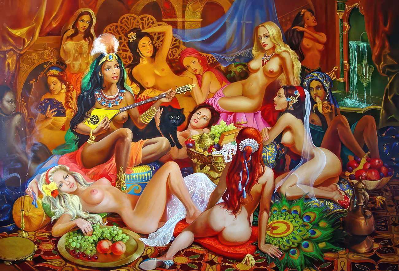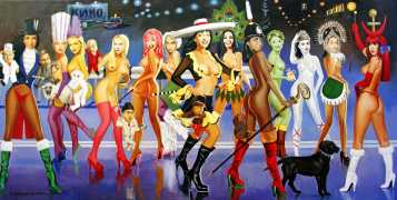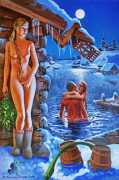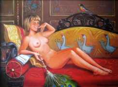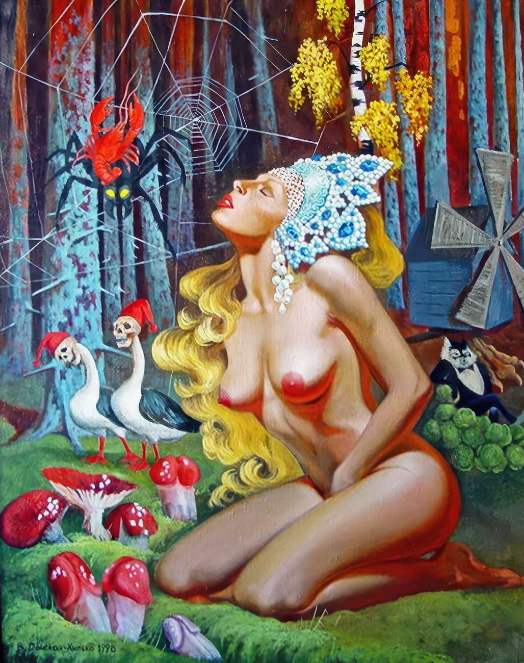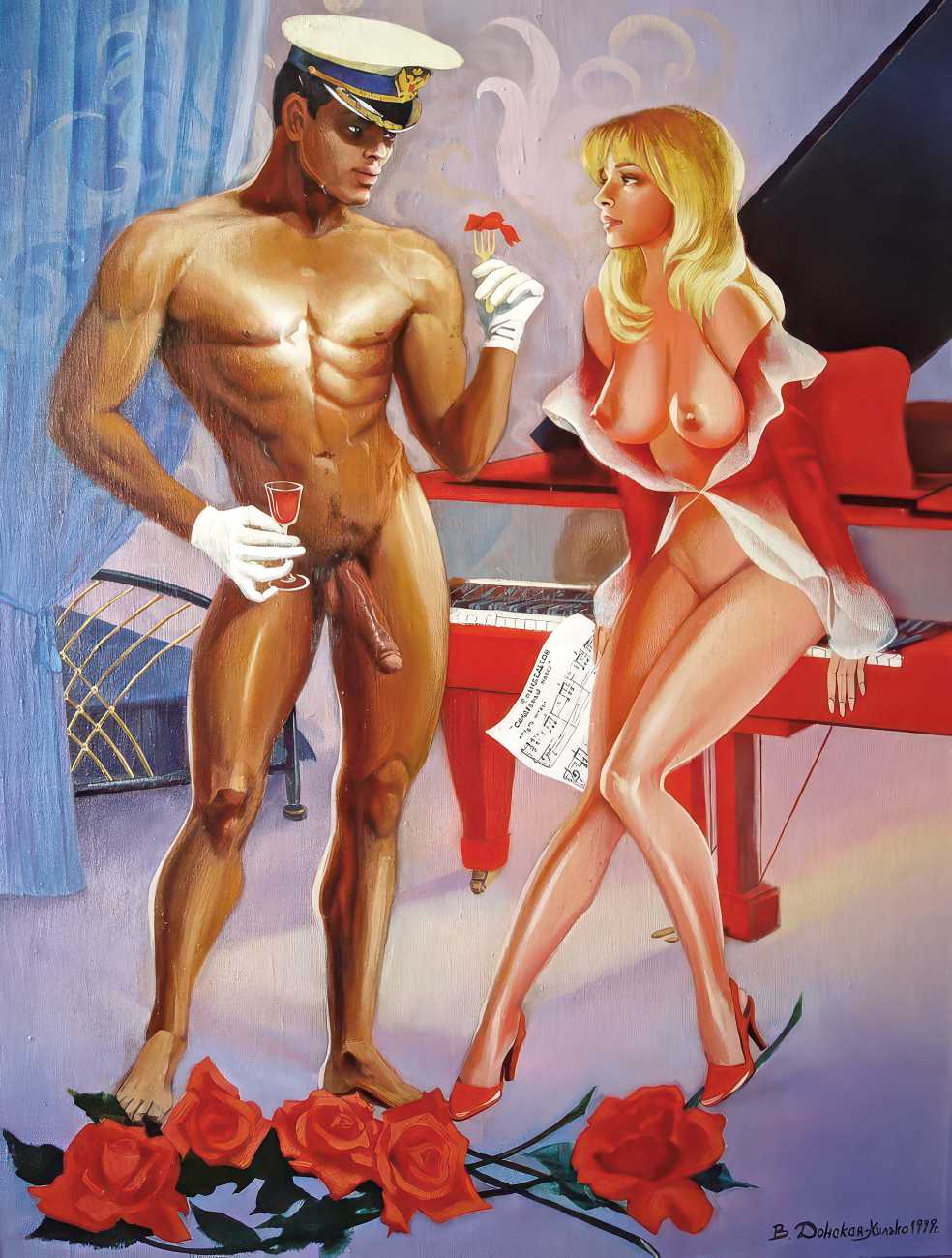 The Russian painter Vera Vasilievna Donskaya-Khilko clearly has an affinity for the naked human body and what it can get up to, but the official, sanitised description of her work on her website describes it as ‘aiming to depict the historical truth of her country within the broader context of world events, reflecting historical epochs through symbolic and metaphorical imagery’. In good Soviet-era practice she tells us all about her family history (great-grandfather the opera singer Lavrenty Dmitrievich Donskoy, maternal grandmother Donskaya Maria Nikolaevna a teacher of Russian and literature, maternal grandfather Basnev Alexander Ivanovich a school director, mother the economist Lobashkova Inna Aleksandrovna, father Lobashkov Vasily Pavlovich a veteran of the Great Patriotic War and senior engineer at the Academy of Sciences who produced equipment for spaceships, husband Gennady Anatolyevich Khilko an architect specialising in bridge and tunnel construction, daughter Lyudmila also an artist and illustrator), before modestly returning to her own career.