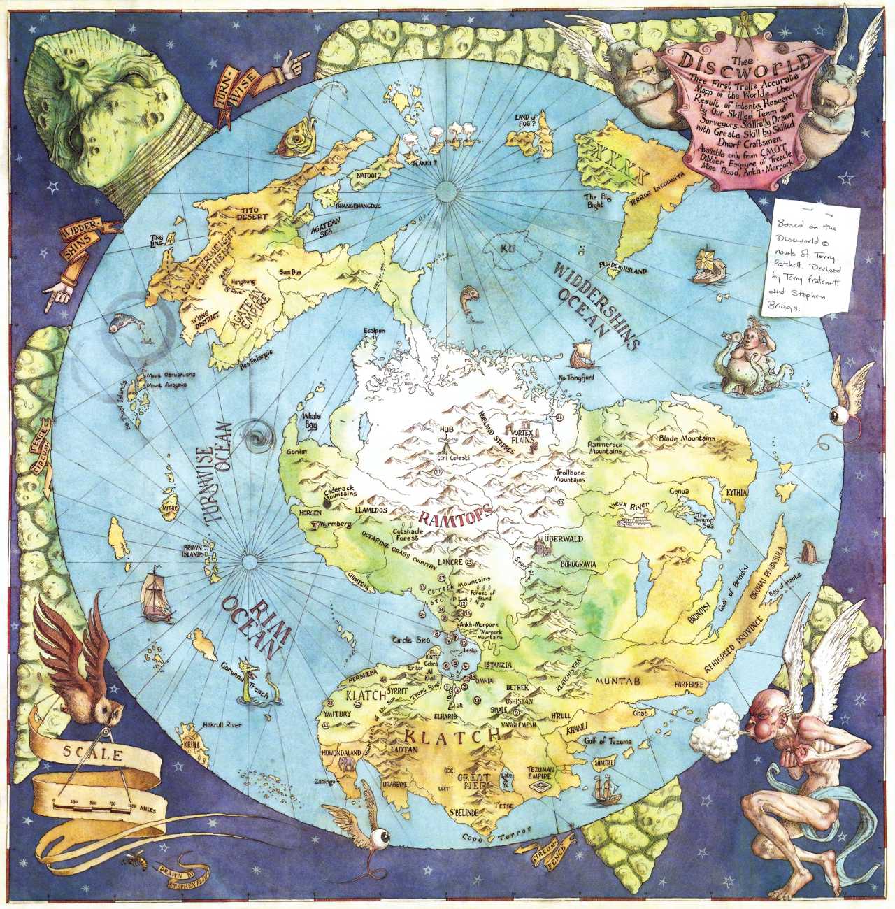 As an almost entirely non-erotic footnote, here is Player’s map of Pratchett’s Discworld, probably his most well-known work:
