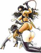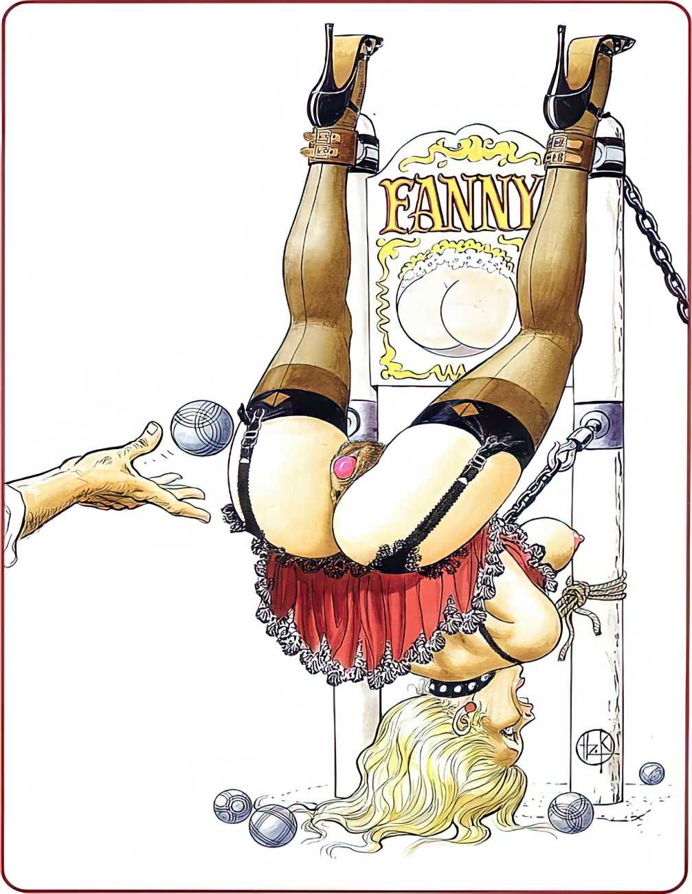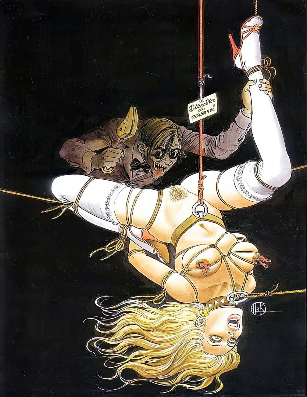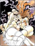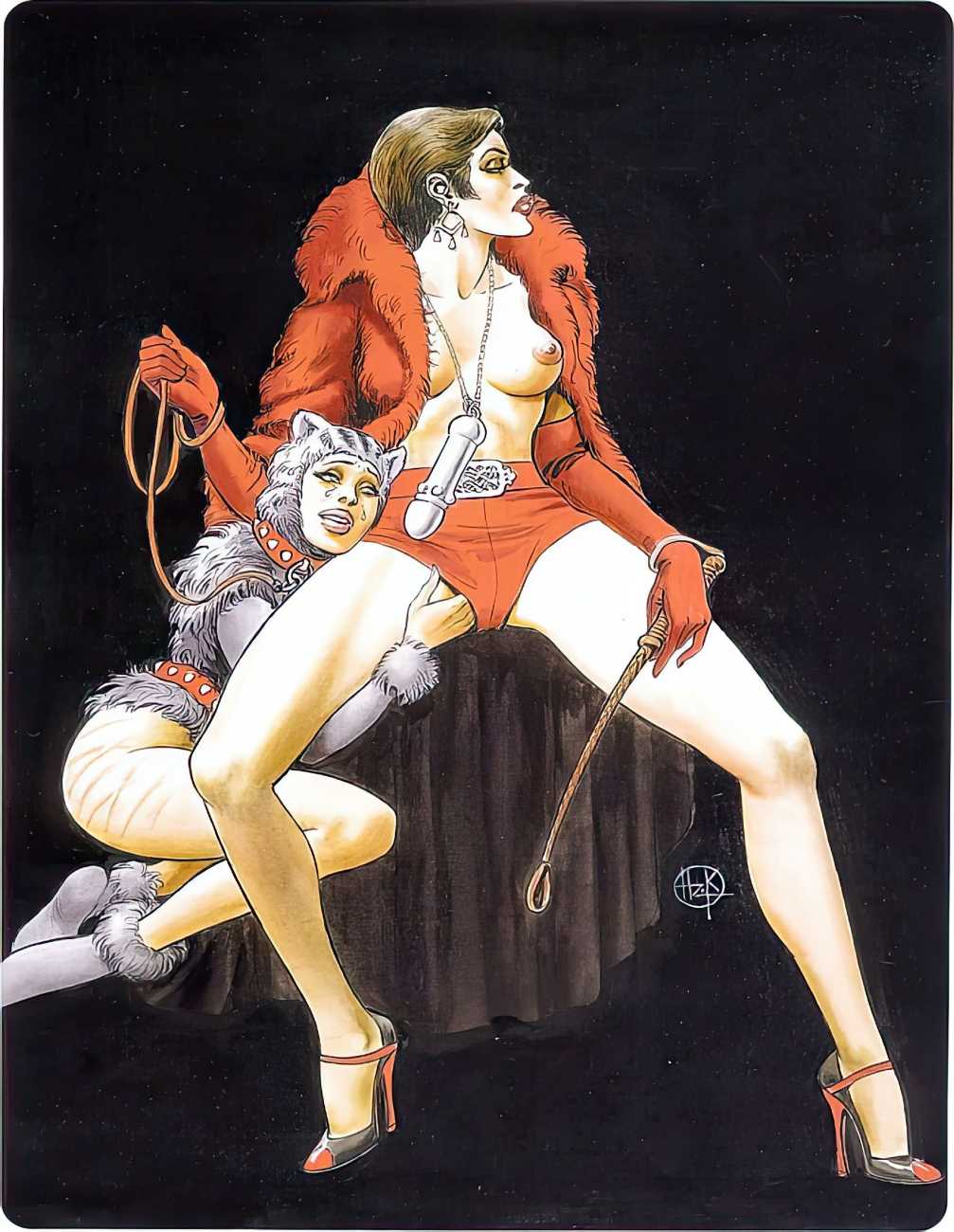 After Hilda and Diane de Grand Lieu, the full-colour Kovacq album Beautés dociles (Docile Beauties), published a year after Bernard Dufossé’s death, is rather a disappointment. It is really just a compilation of the titillating full-colour cover illustrations from his more experimental work, and the introduction – which though ostensibly by him is almost certainly not – excuses the ‘pin-ups’ as ‘what pleases all his readers’.