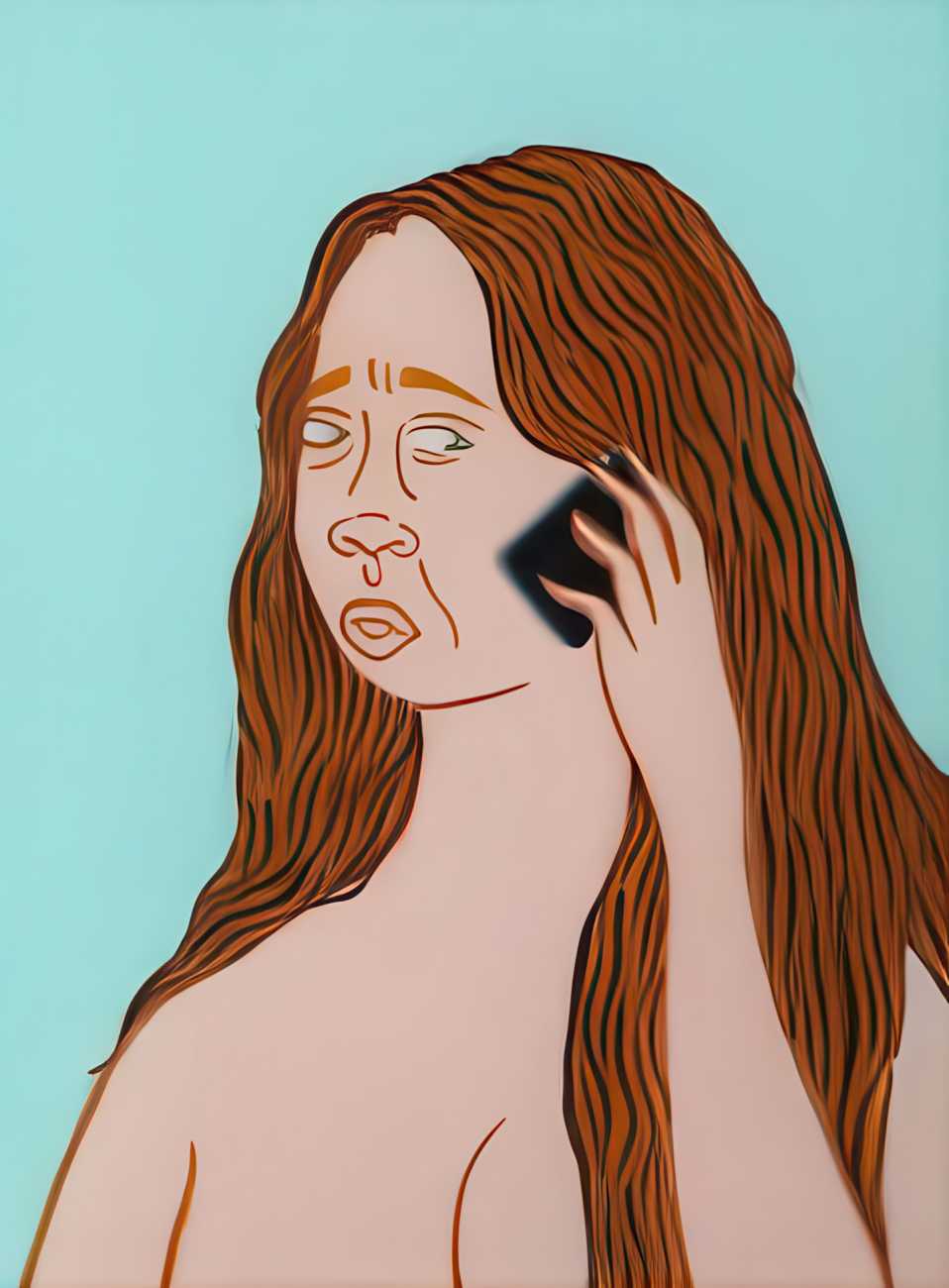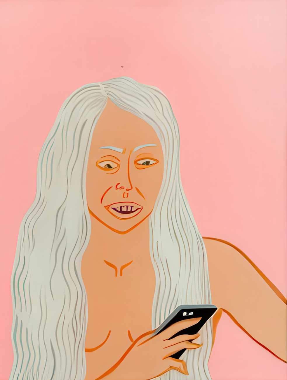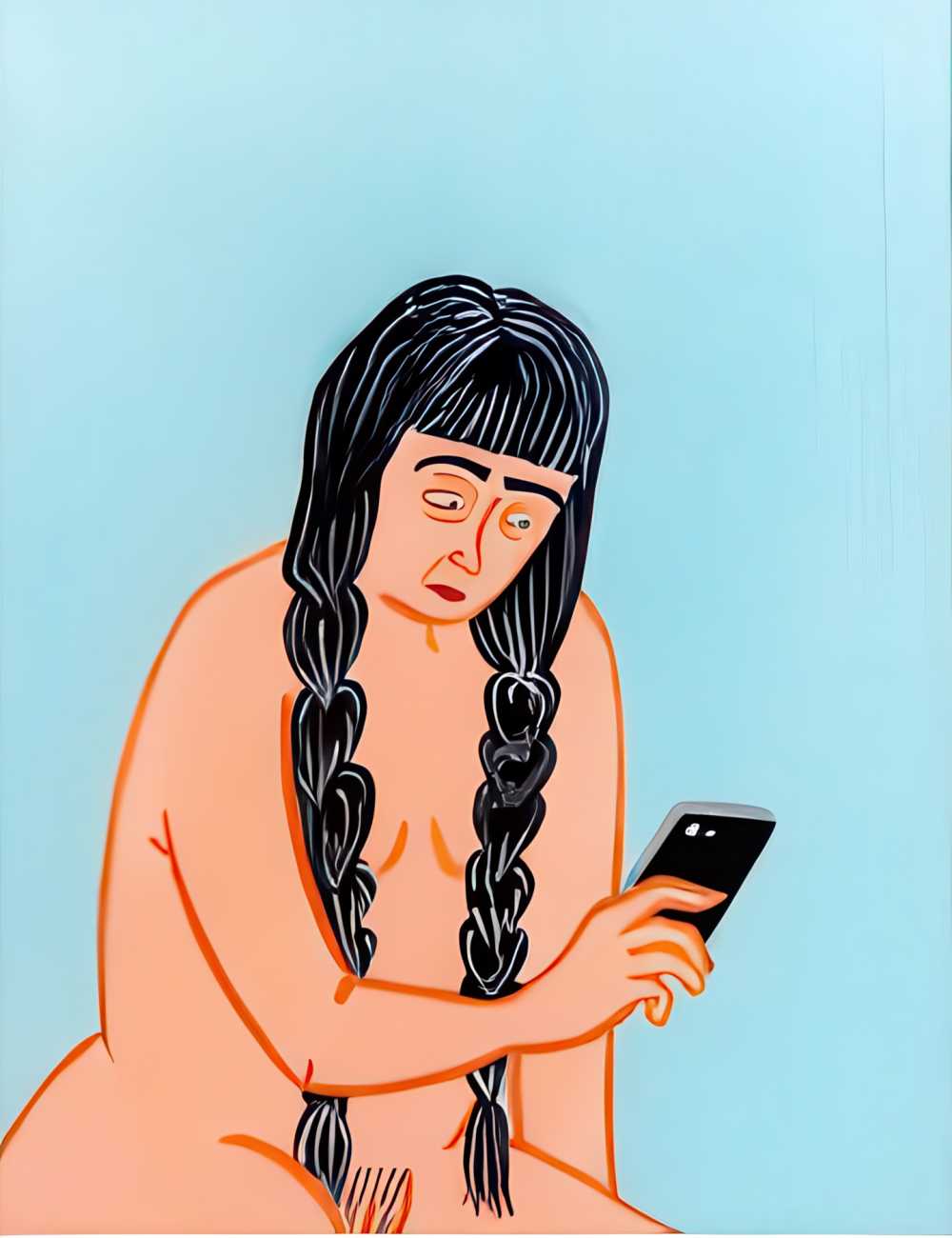 Sylvia Rehbein of the Thomas Rehbein Gallery in Köln (which presented a major exhibition of Dubois’s work in 2020) writes, ‘With a wink, Joëlle Dubois transfers the digital revolution and the resulting role of humans in our modern society into her works. She is especially interested in the voyeuristic aspect of digitalisation. Social media platforms like Instagram, Snapchat and YouTube, television programs like Big Brother, fulfil our desire to observe others anonymously in their suffering – their love life, their successes and failures. Digitalisation has made communication faster, more purposeful and interactive, but it means that less and less privacy is possible, and we present ourselves more openly and more naked to everyone else. Communication becomes increasingly superficial, impersonal and anonymous. Dubois devotes herself with passion to this complex of topics in an ironic and comical way. She depicts her protagonists in an exposed and unadorned manner, steeped in a drastic realism that often turns out distorted in the digital world. By showing hairy chubby women and men in compromising positions, she emphasises her own role as an independent and emancipated woman and artist. Dubois is a silent observer, watching the world in her own display of idiosyncratic perfectionism.’