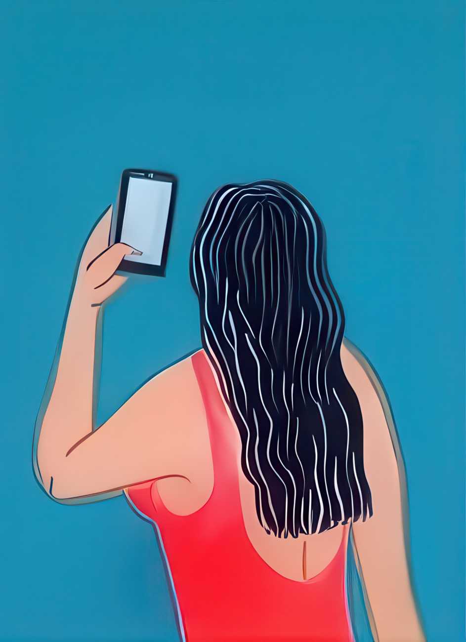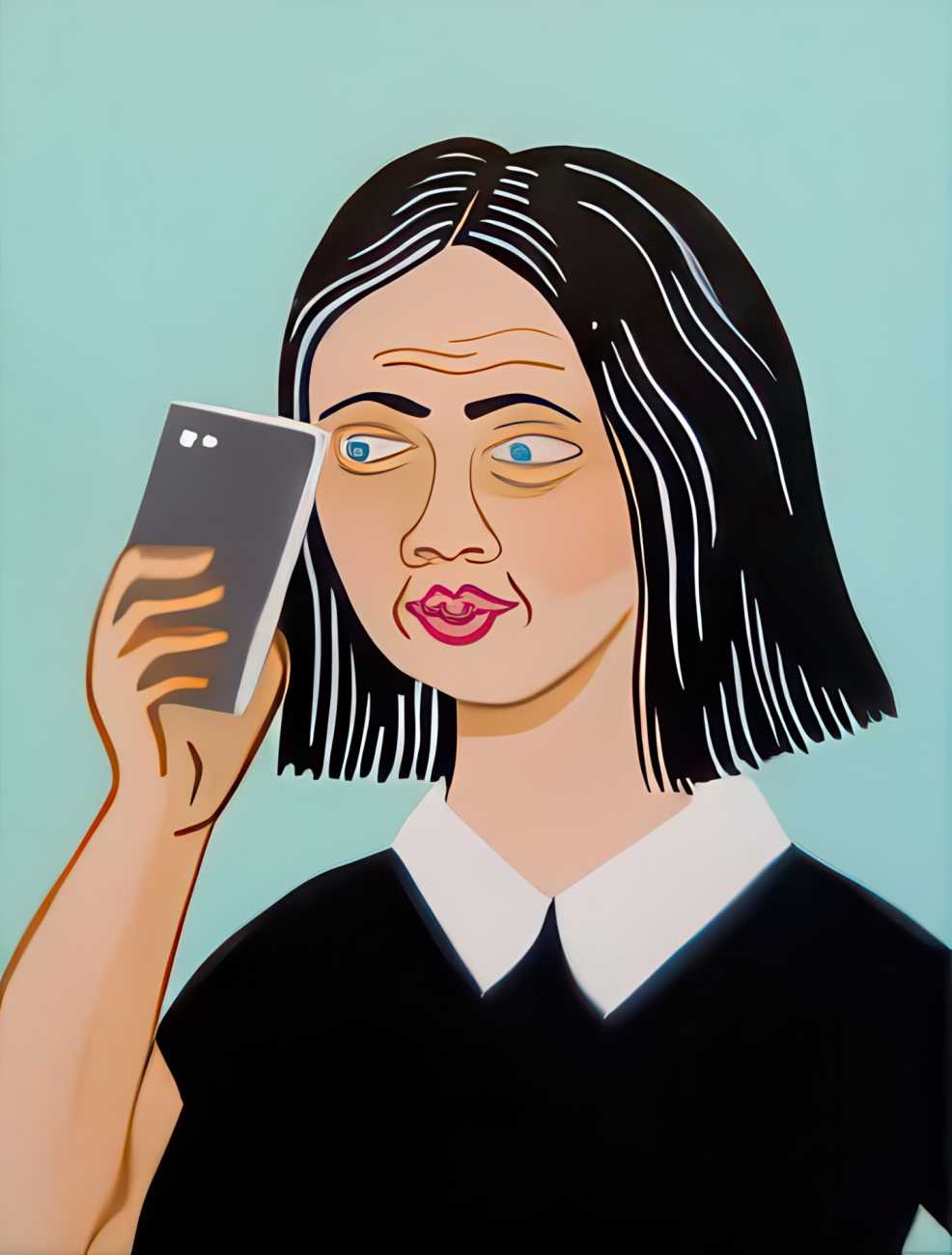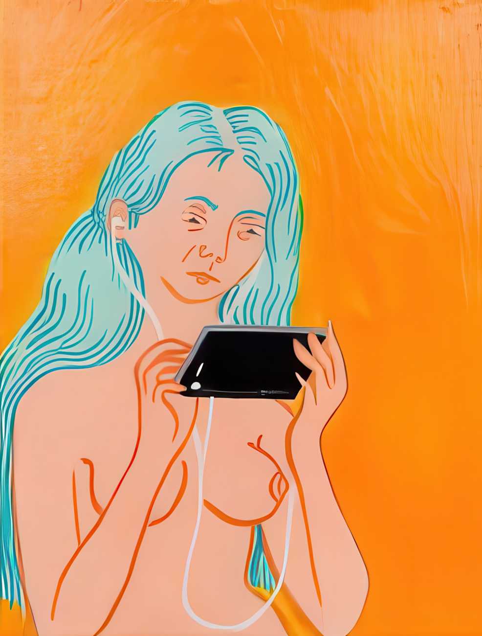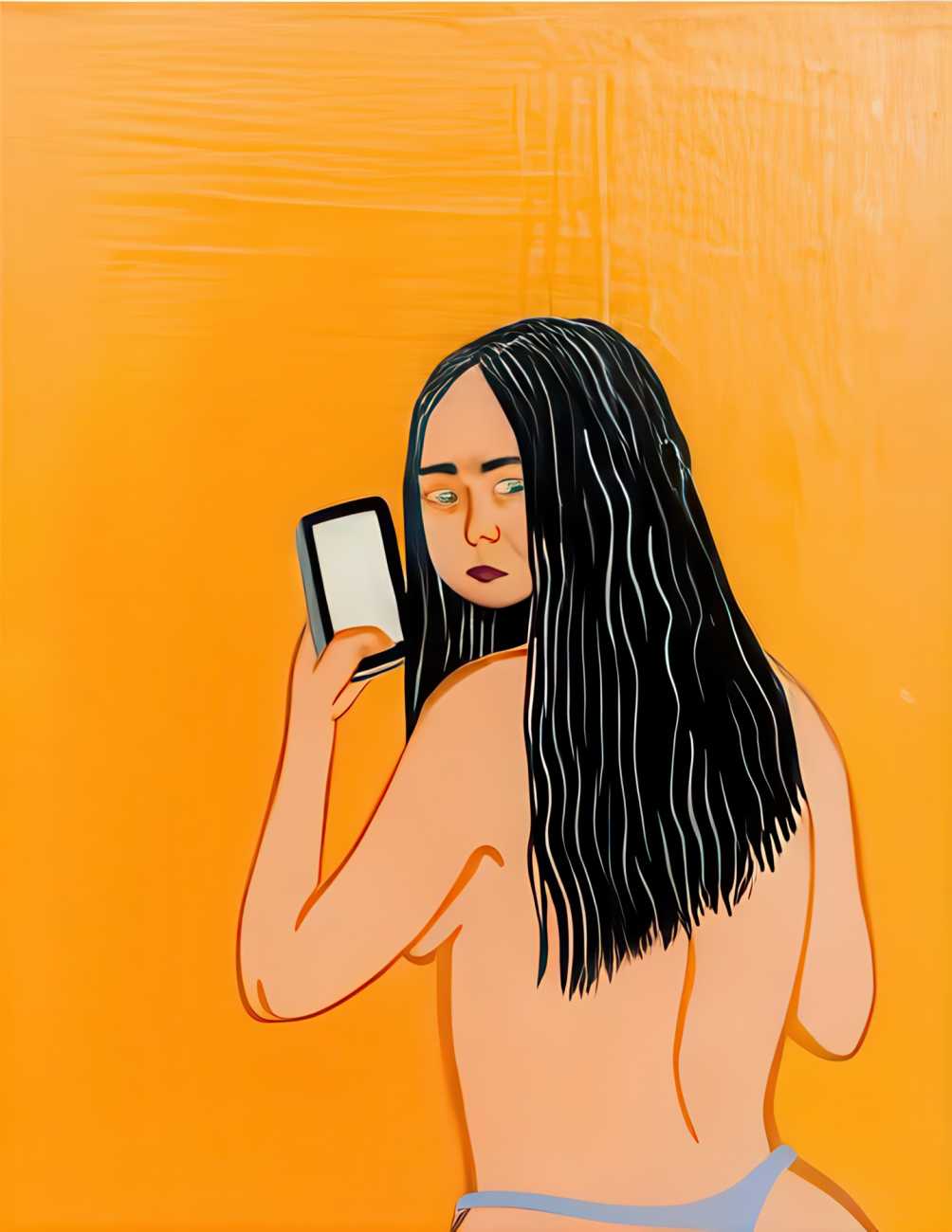 Sylvia Rehbein of the Thomas Rehbein Gallery in Köln (which presented a major exhibition of Dubois’s work in 2020) writes, ‘With a wink, Joëlle Dubois transfers the digital revolution and the resulting role of humans in our modern society into her works. She is especially interested in the voyeuristic aspect of digitalisation. Social media platforms like Instagram, Snapchat and YouTube, television programs like Big Brother, fulfil our desire to observe others anonymously in their suffering – their love life, their successes and failures. Digitalisation has made communication faster, more purposeful and interactive, but it means that less and less privacy is possible, and we present ourselves more openly and more naked to everyone else. Communication becomes increasingly superficial, impersonal and anonymous. Dubois devotes herself with passion to this complex of topics in an ironic and comical way. She depicts her protagonists in an exposed and unadorned manner, steeped in a drastic realism that often turns out distorted in the digital world. By showing hairy chubby women and men in compromising positions, she emphasises her own role as an independent and emancipated woman and artist. Dubois is a silent observer, watching the world in her own display of idiosyncratic perfectionism.’