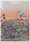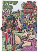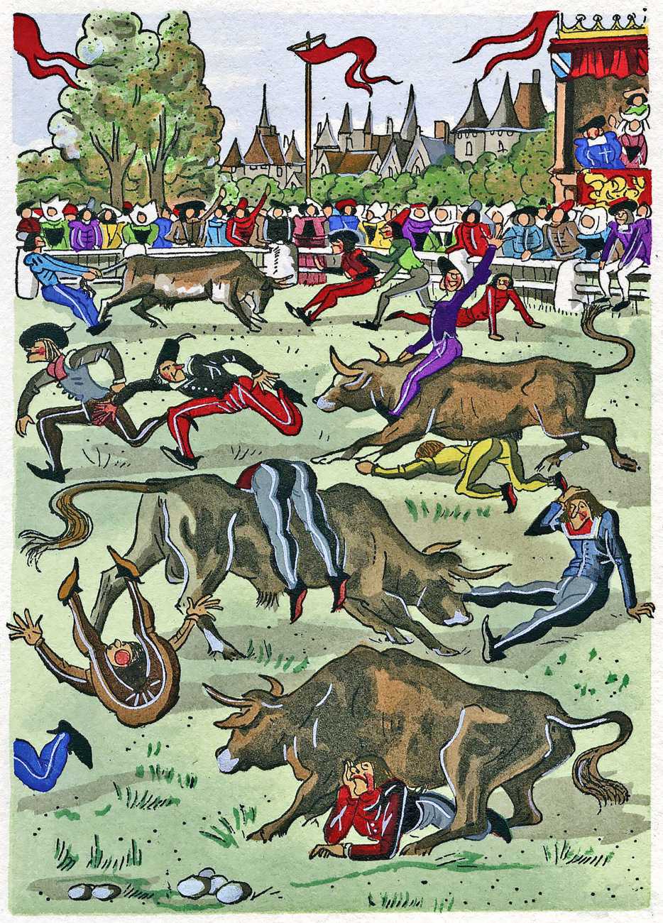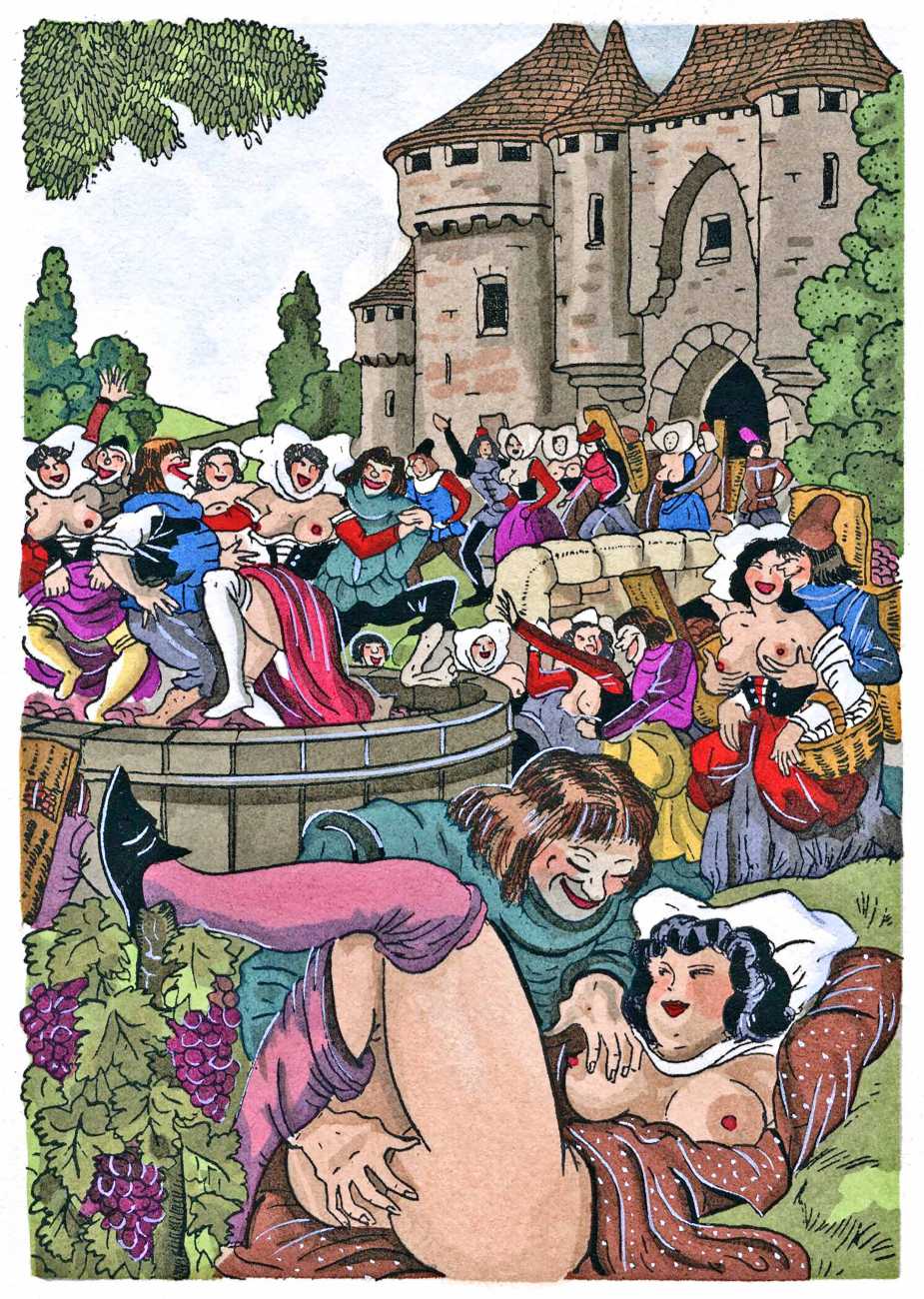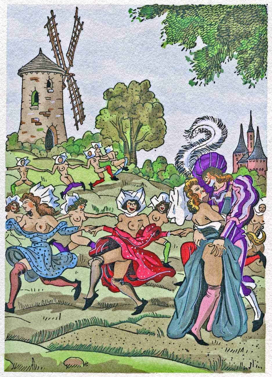 Jean Gradassi was commissioned to produce a new set of illustrations for Sciomachie, and is the perfect illustrator for Rabelais’ witty account of the over-the-top celebrations, with plenty of naked flesh to add to the entertainment.