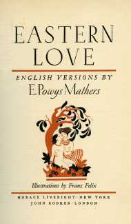 Eastern Love was first published in London by John Rodker, in 1927, in a twelve-volume limited edition with coloured engravings by Hester Sainsbury. The American edition, published in a luxury three-volume set by Horace Liveright, New York, used three-colour plates by Franz Felix, all of which included metallic gold ink. Liveright, along with his publishing partner Albert Boni, were well known for their experimental de luxe illustrated editions, and this set was published in a limited numbered edition of 1,500 copies. Both the John Rodker and the Horace Liveright sets are now sought after by collectors.