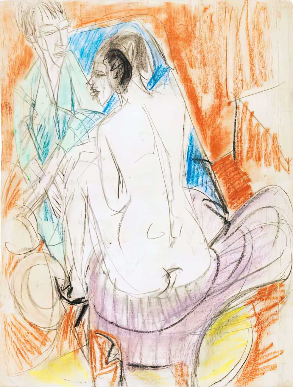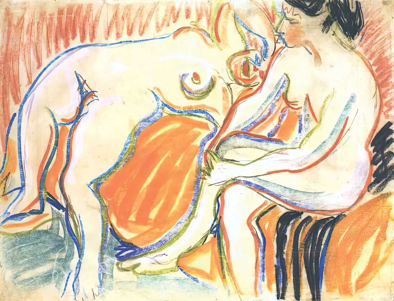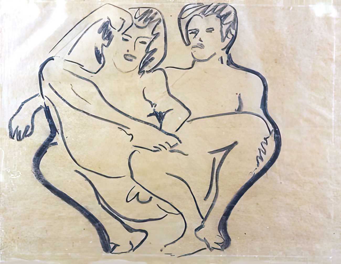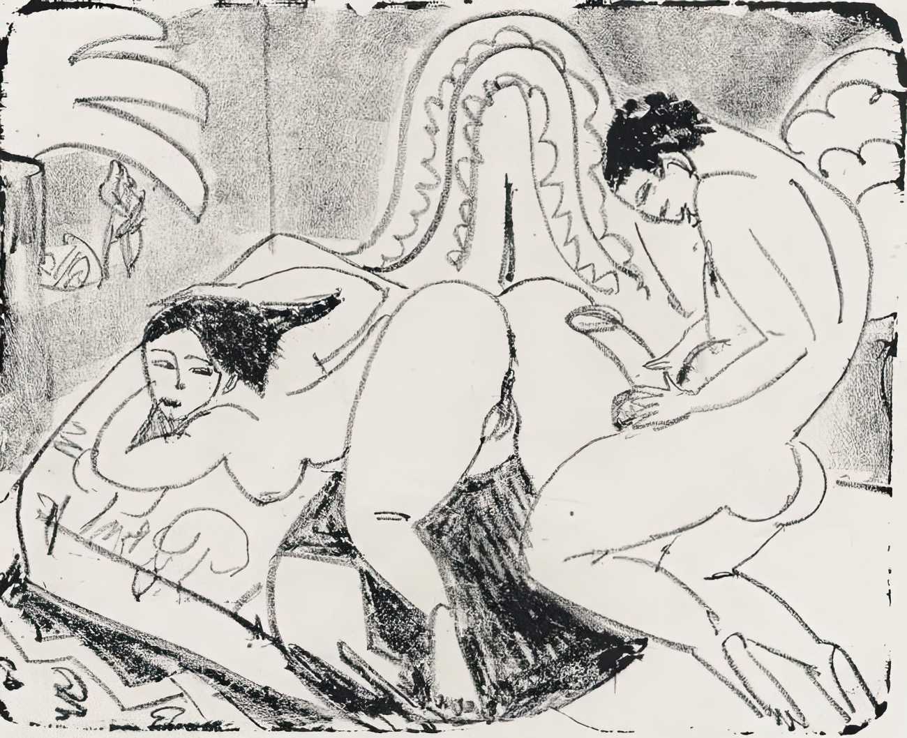 Because drawing offered fewer mediating layers than painting, Kirchner could approach the erotic with a kind of observational frankness. Even when figures are stylised, the emphasis falls on gesture and posture, on how bodies occupy space and relate to one another. The erotic emerges not as spectacle but as a form of lived intimacy shaped by the artist’s encounter with the subject. His drawings often reveal the tension between freedom and restraint that runs through his work. Quick strokes convey liberation and naturalness, yet the compressed compositions and abrupt angles hint at psychological unease.