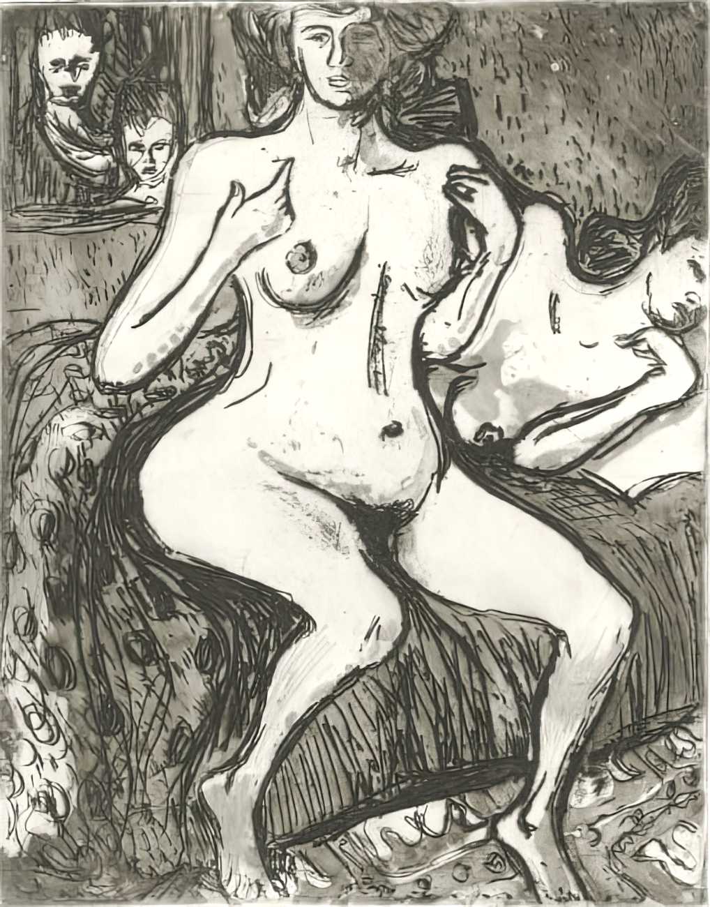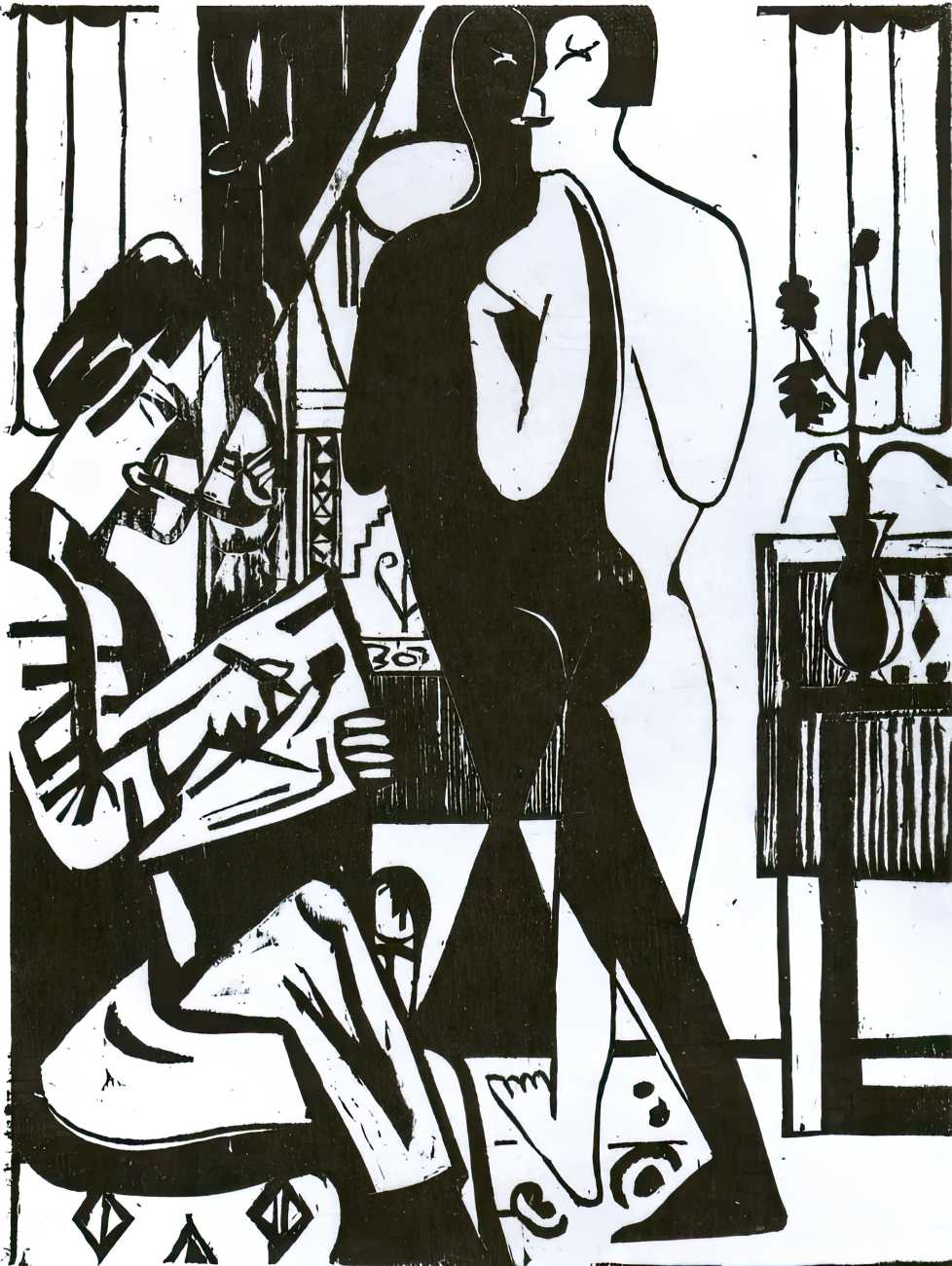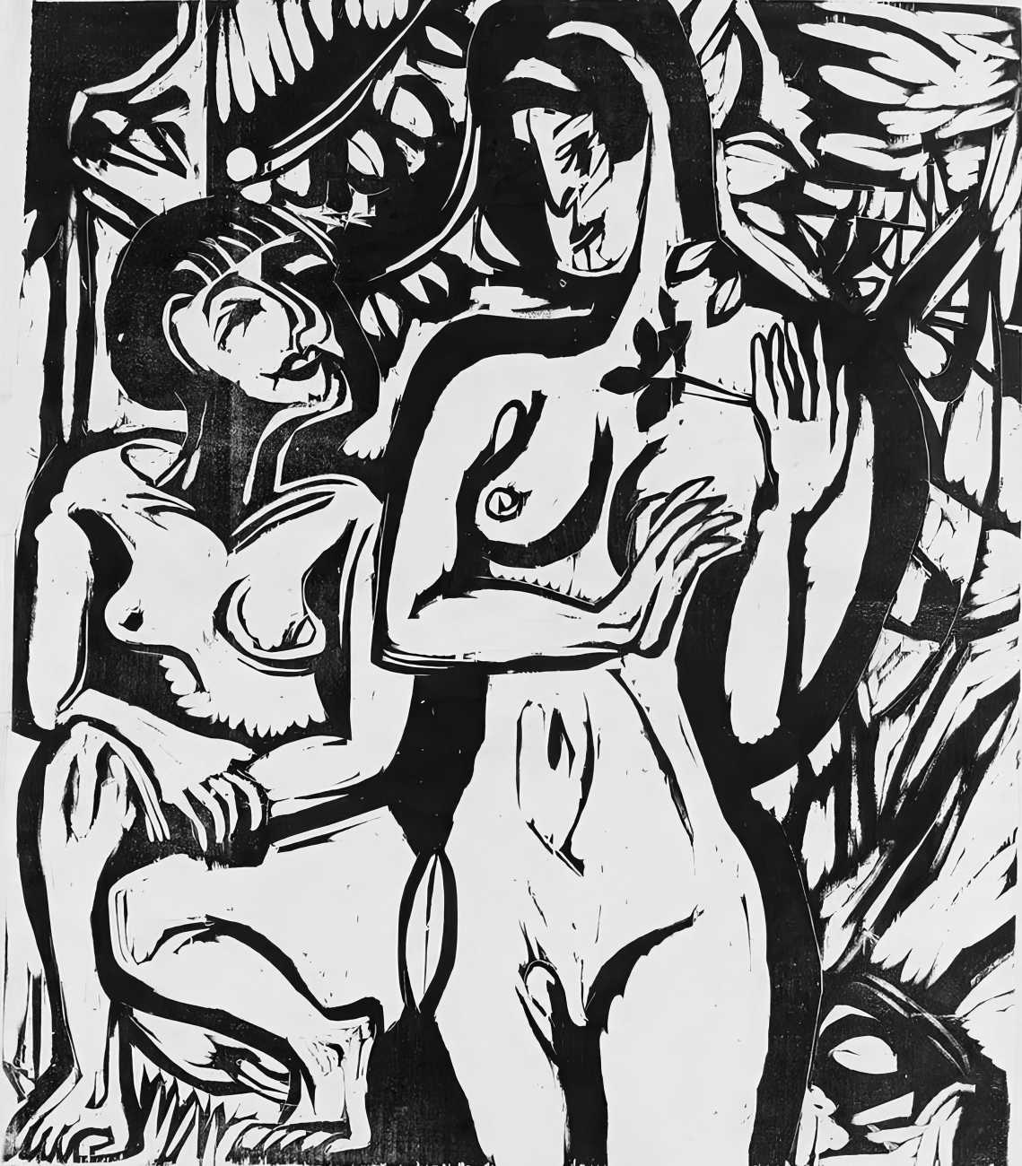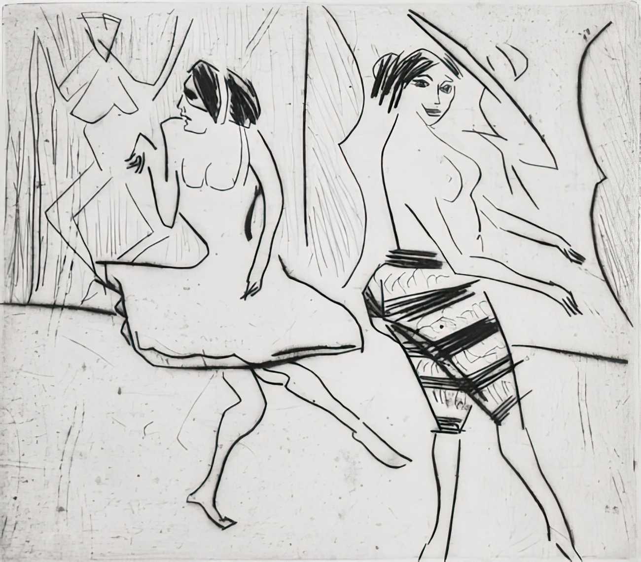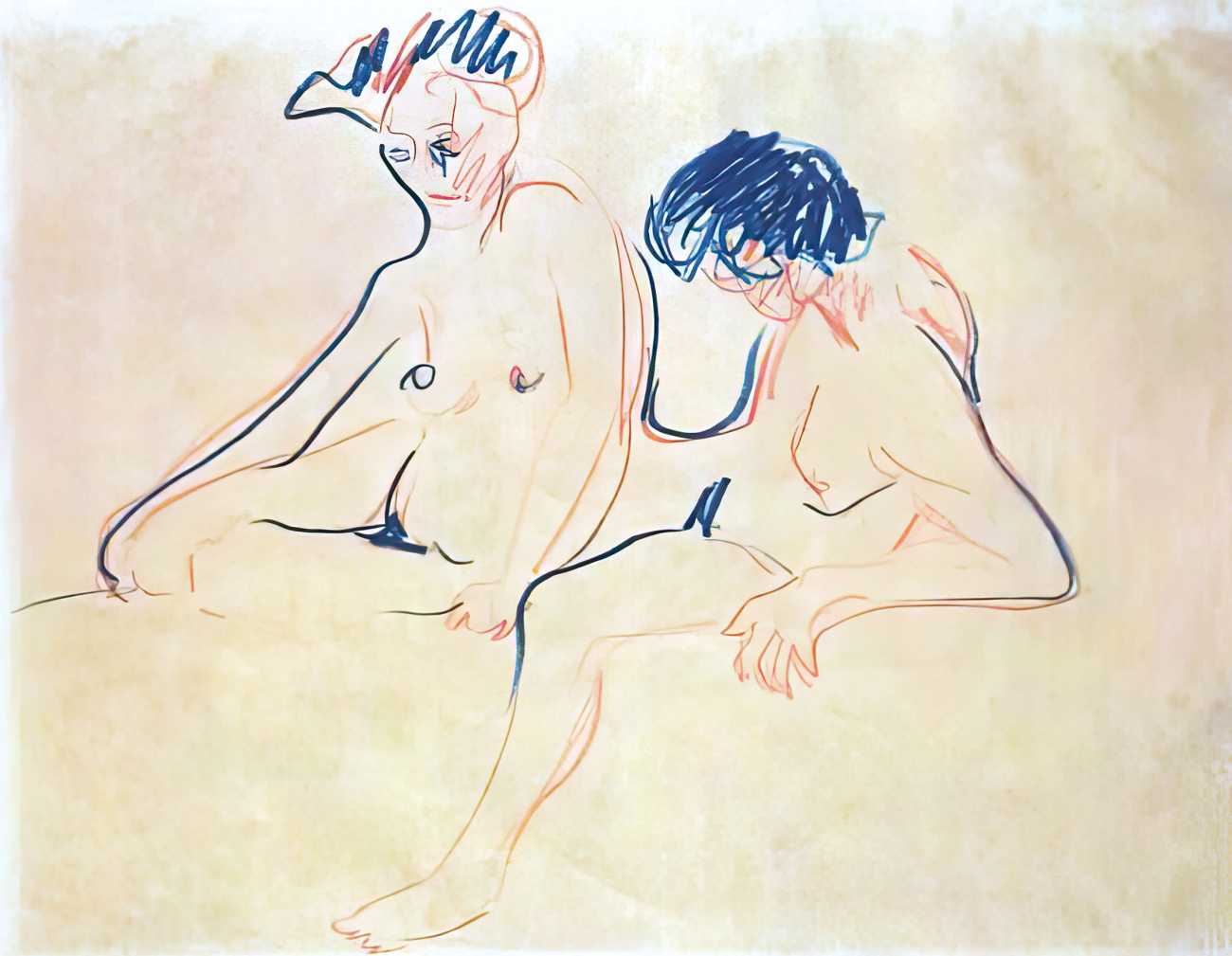 Because drawing offered fewer mediating layers than painting, Kirchner could approach the erotic with a kind of observational frankness. Even when figures are stylised, the emphasis falls on gesture and posture, on how bodies occupy space and relate to one another. The erotic emerges not as spectacle but as a form of lived intimacy shaped by the artist’s encounter with the subject. His drawings often reveal the tension between freedom and restraint that runs through his work. Quick strokes convey liberation and naturalness, yet the compressed compositions and abrupt angles hint at psychological unease.