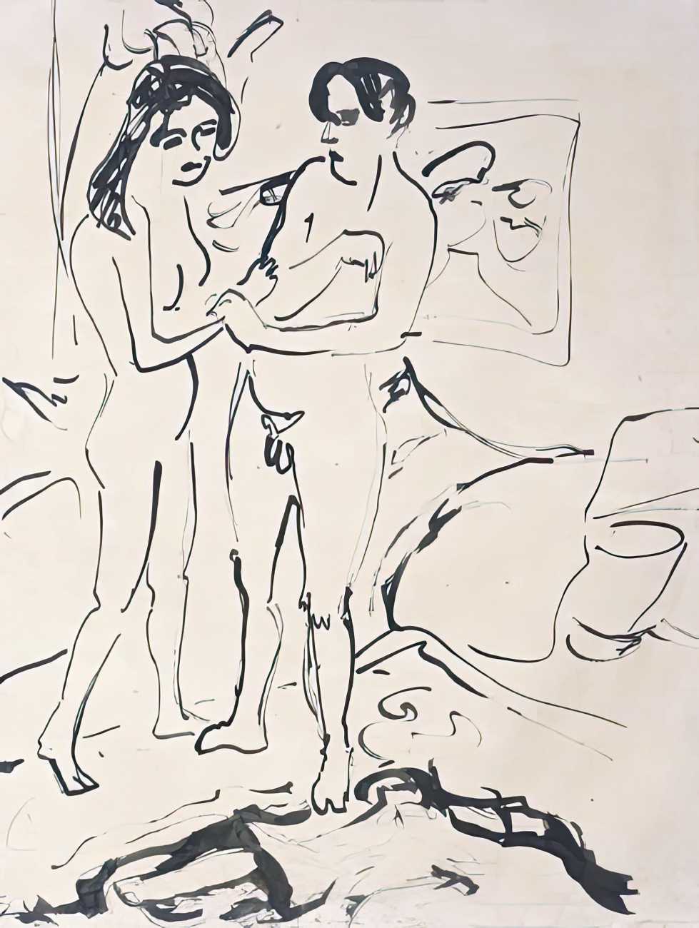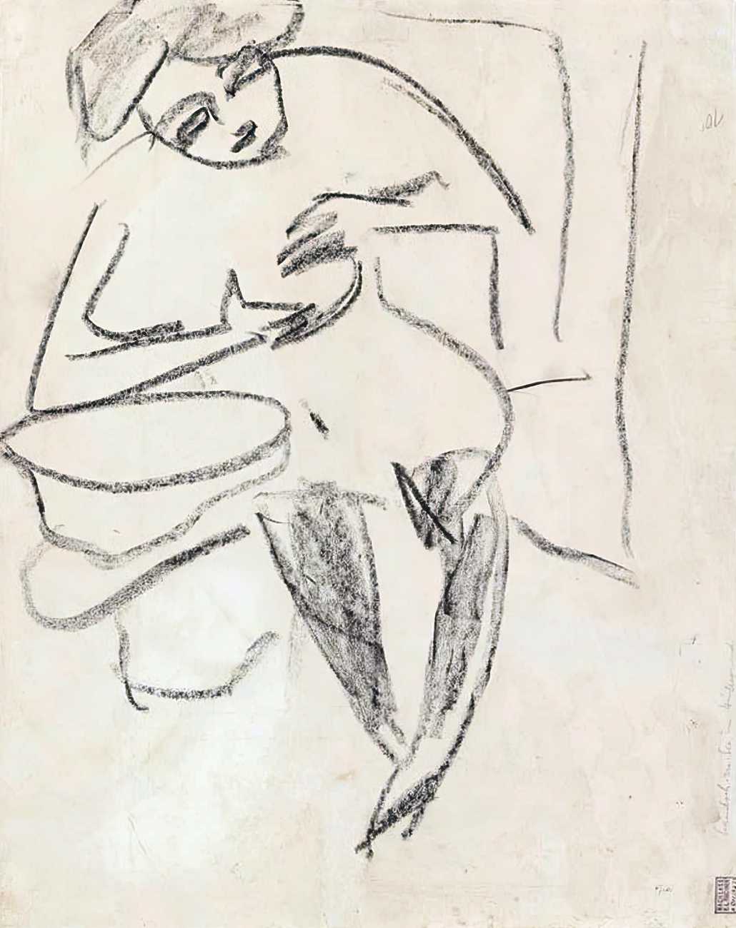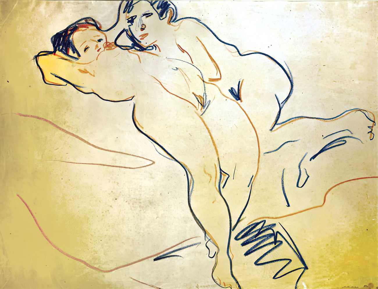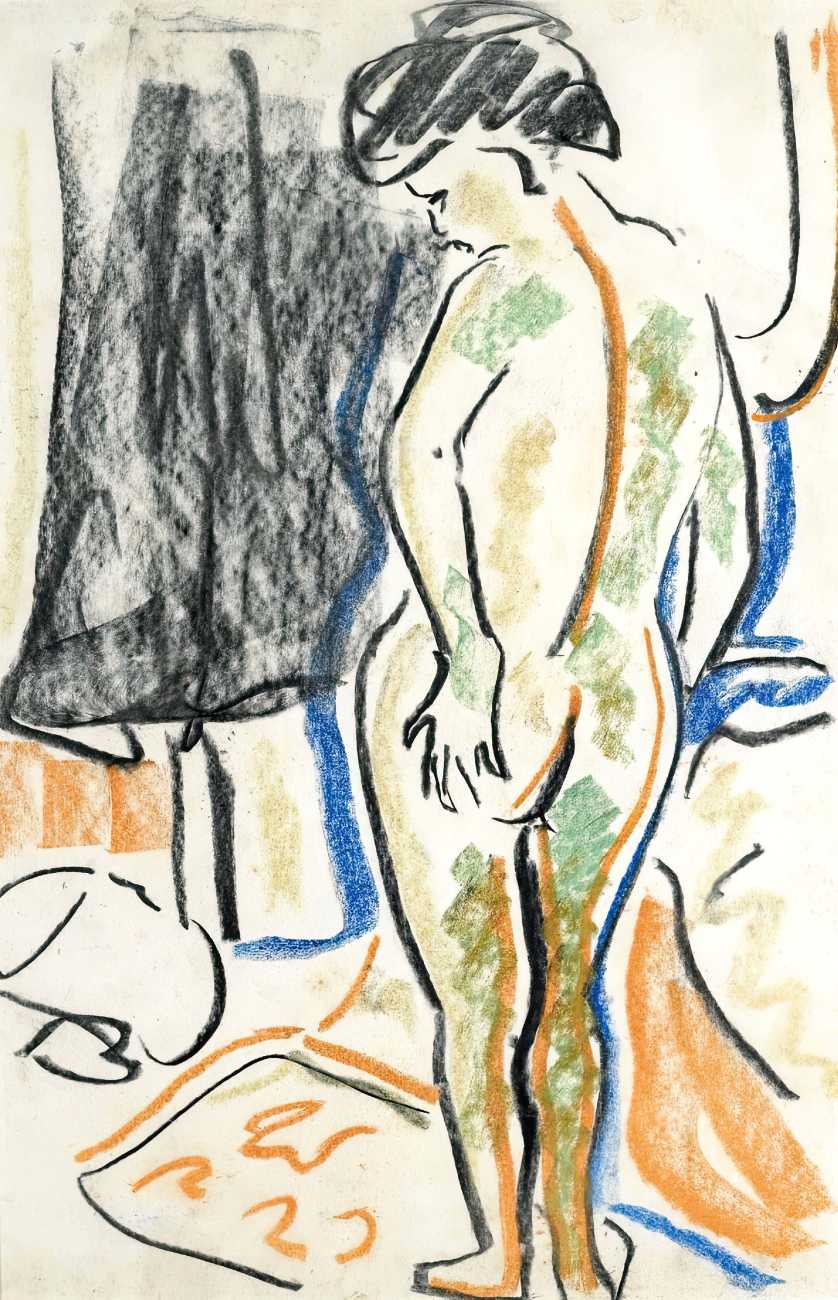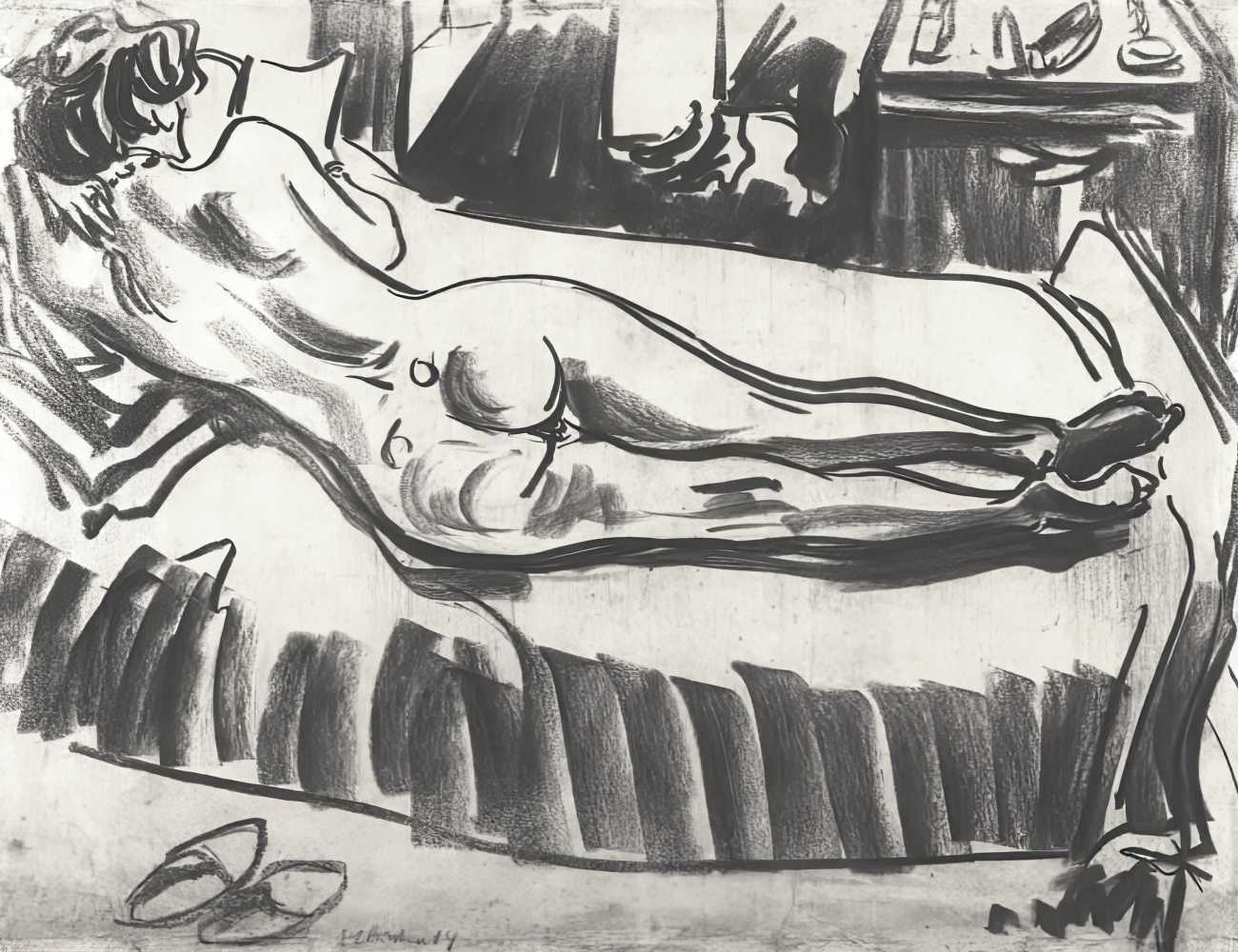 In Kirchner’s drawings the erotic appears with a directness and immediacy distinct from the more theatrically charged sensuality of his paintings. Working quickly with charcoal, ink or pencil, Kirchner used drawing as a laboratory for exploring bodily presence stripped of narrative context or painterly drama. The line became the primary expressive agent, recording desire as a kinetic impulse rather than as a composed scene. His naked subjects often seem caught in a moment of transition – stretching, reclining, dressing, bathing – captured with an economy of line suggesting spontaneity and intimacy.