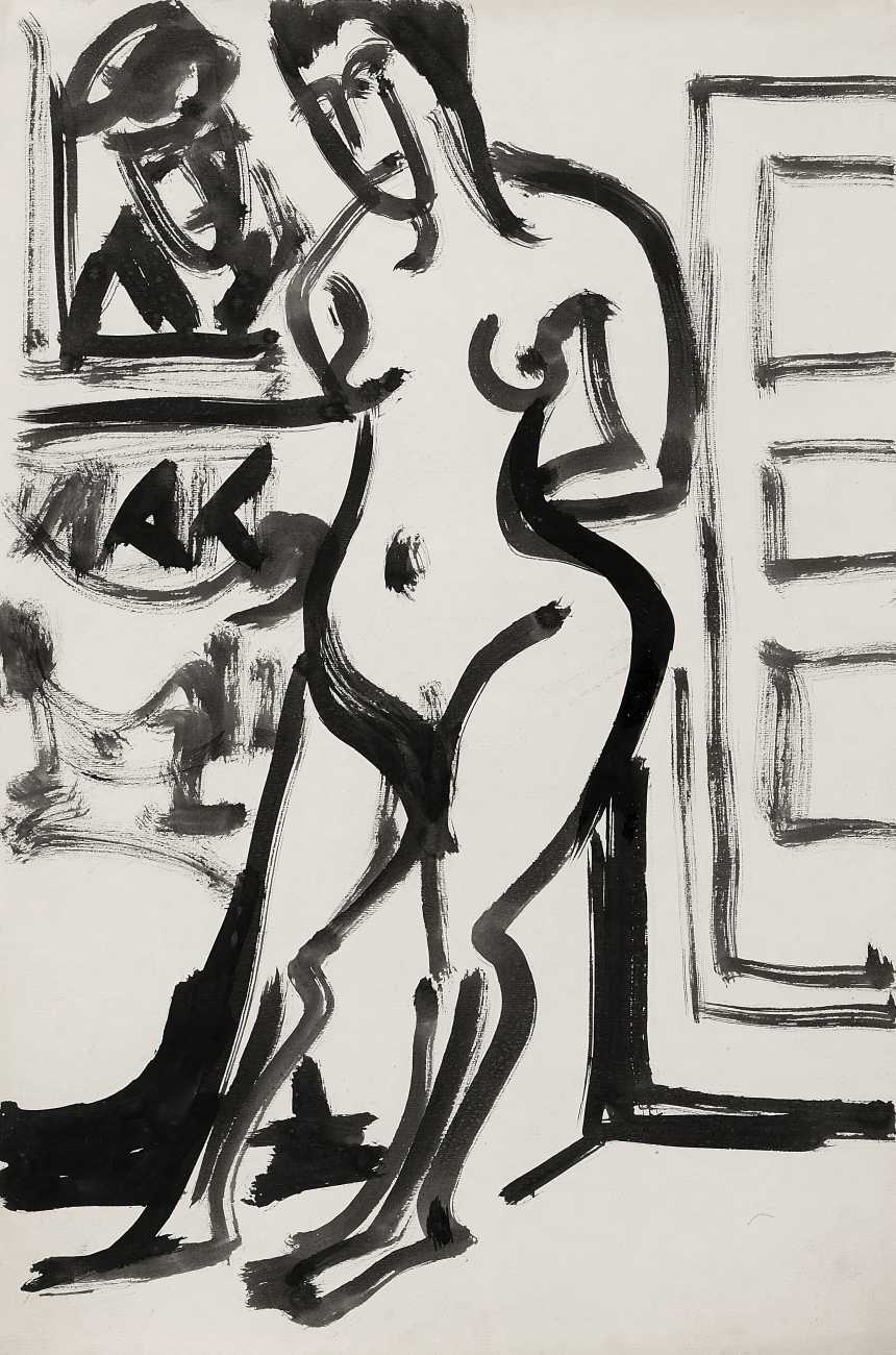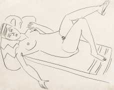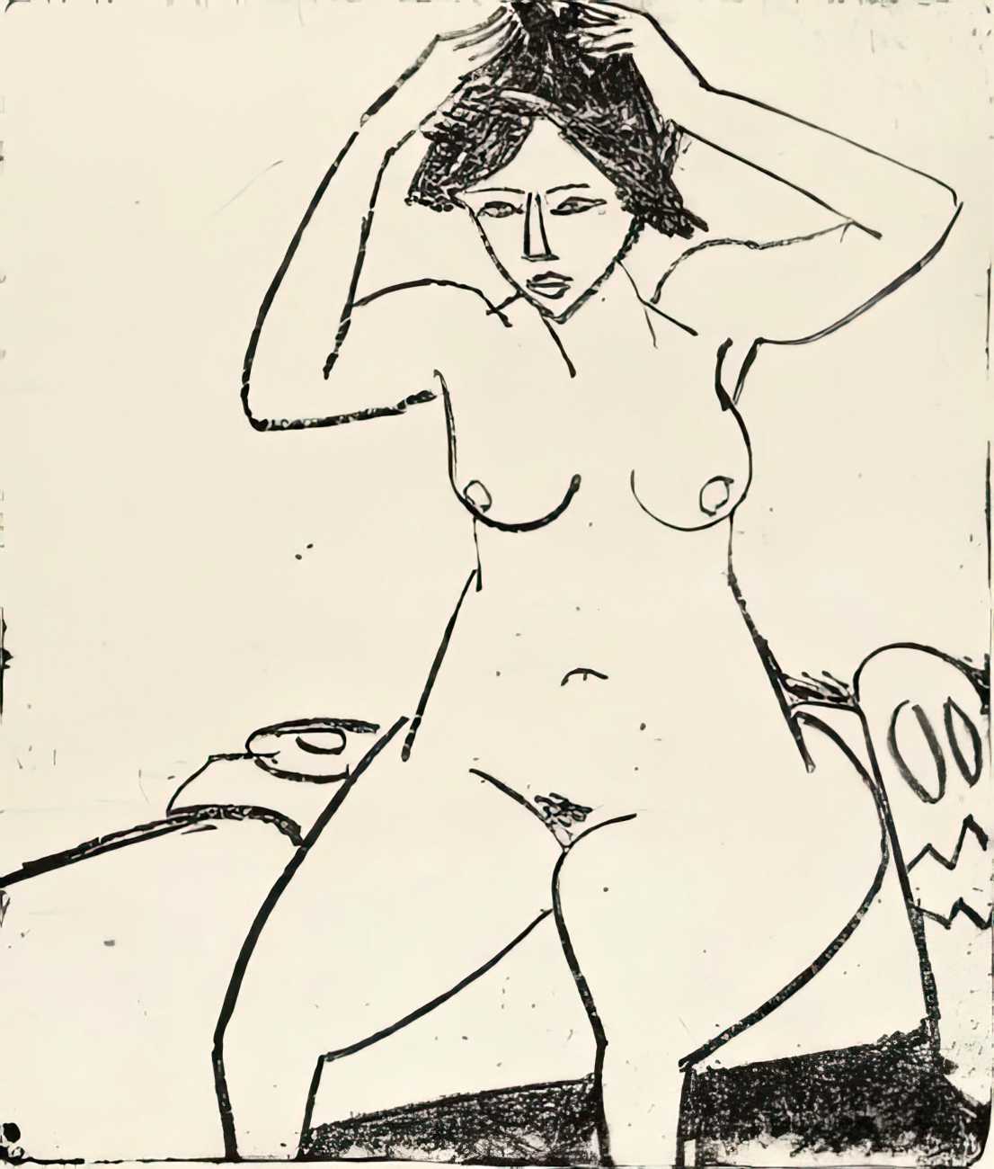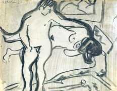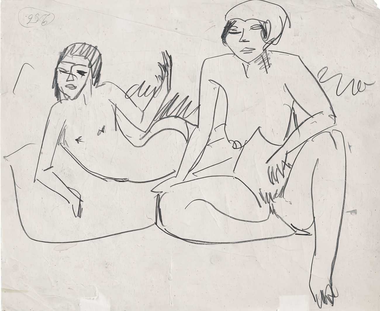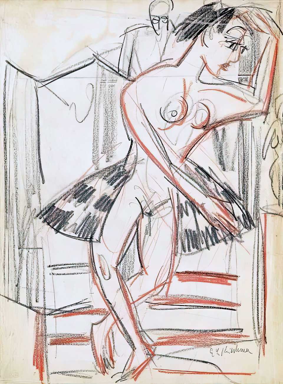 In Kirchner’s drawings the erotic appears with a directness and immediacy distinct from the more theatrically charged sensuality of his paintings. Working quickly with charcoal, ink or pencil, Kirchner used drawing as a laboratory for exploring bodily presence stripped of narrative context or painterly drama. The line became the primary expressive agent, recording desire as a kinetic impulse rather than as a composed scene. His naked subjects often seem caught in a moment of transition – stretching, reclining, dressing, bathing – captured with an economy of line suggesting spontaneity and intimacy.
