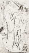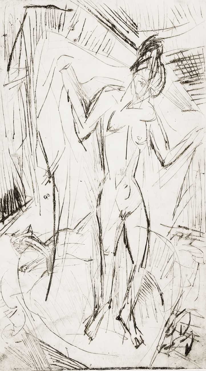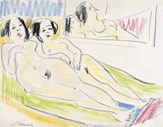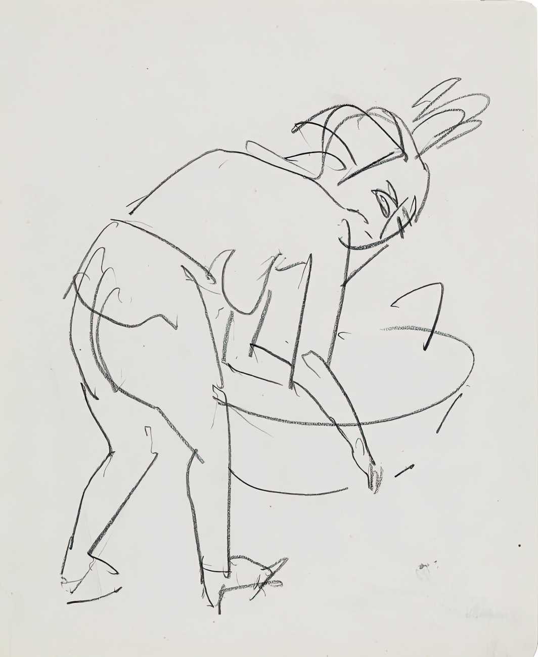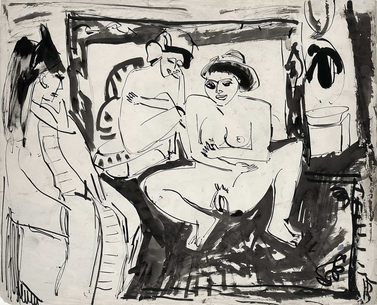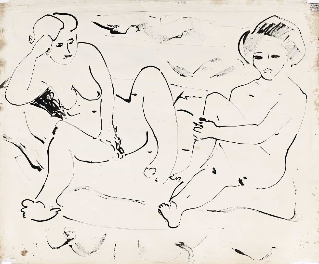 In Kirchner’s drawings the erotic appears with a directness and immediacy distinct from the more theatrically charged sensuality of his paintings. Working quickly with charcoal, ink or pencil, Kirchner used drawing as a laboratory for exploring bodily presence stripped of narrative context or painterly drama. The line became the primary expressive agent, recording desire as a kinetic impulse rather than as a composed scene. His naked subjects often seem caught in a moment of transition – stretching, reclining, dressing, bathing – captured with an economy of line suggesting spontaneity and intimacy.