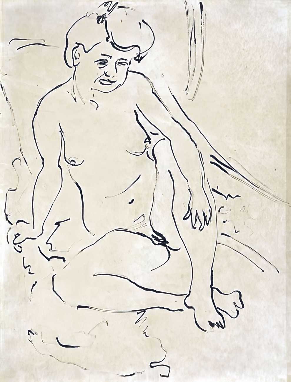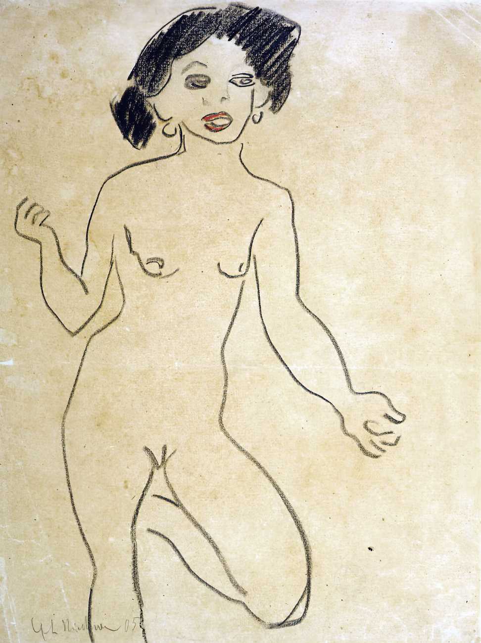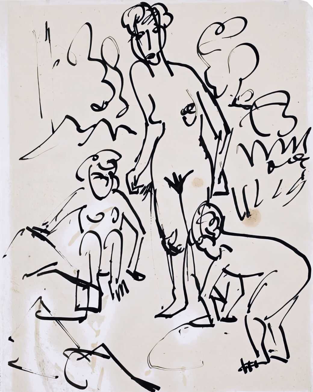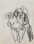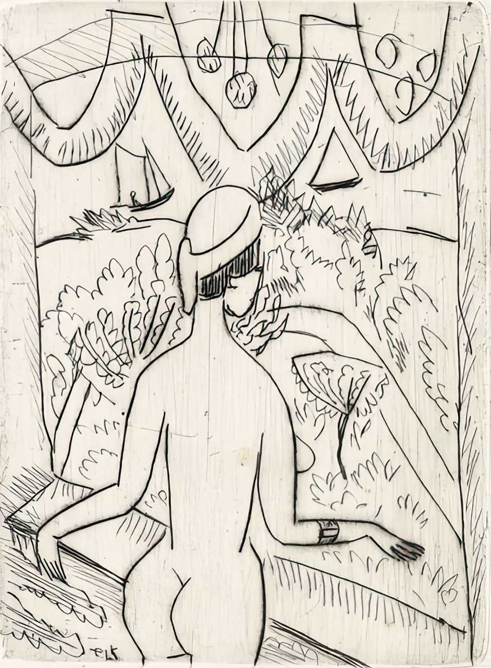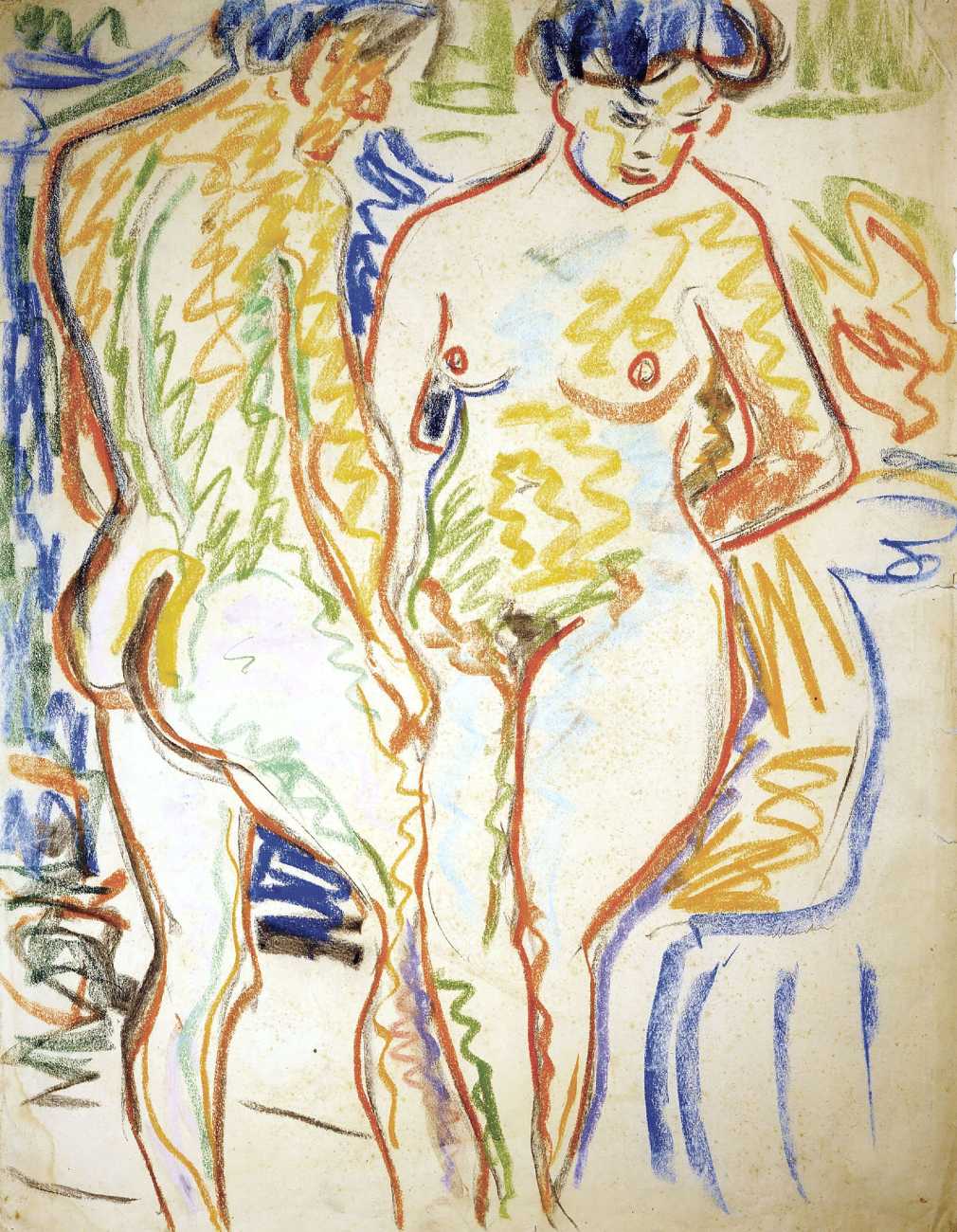In Kirchner’s drawings the erotic appears with a directness and immediacy distinct from the more theatrically charged sensuality of his paintings. Working quickly with charcoal, ink or pencil, Kirchner used drawing as a laboratory for exploring bodily presence stripped of narrative context or painterly drama. The line became the primary expressive agent, recording desire as a kinetic impulse rather than as a composed scene. His naked subjects often seem caught in a moment of transition – stretching, reclining, dressing, bathing – captured with an economy of line suggesting spontaneity and intimacy.