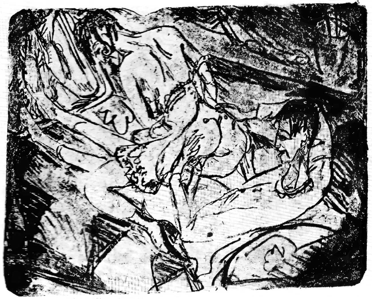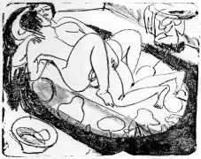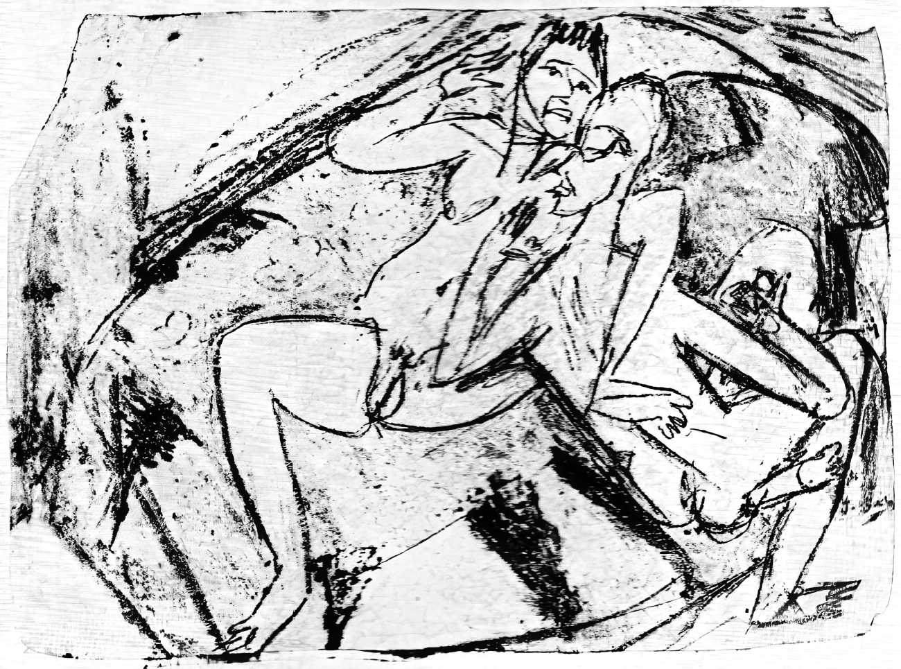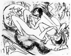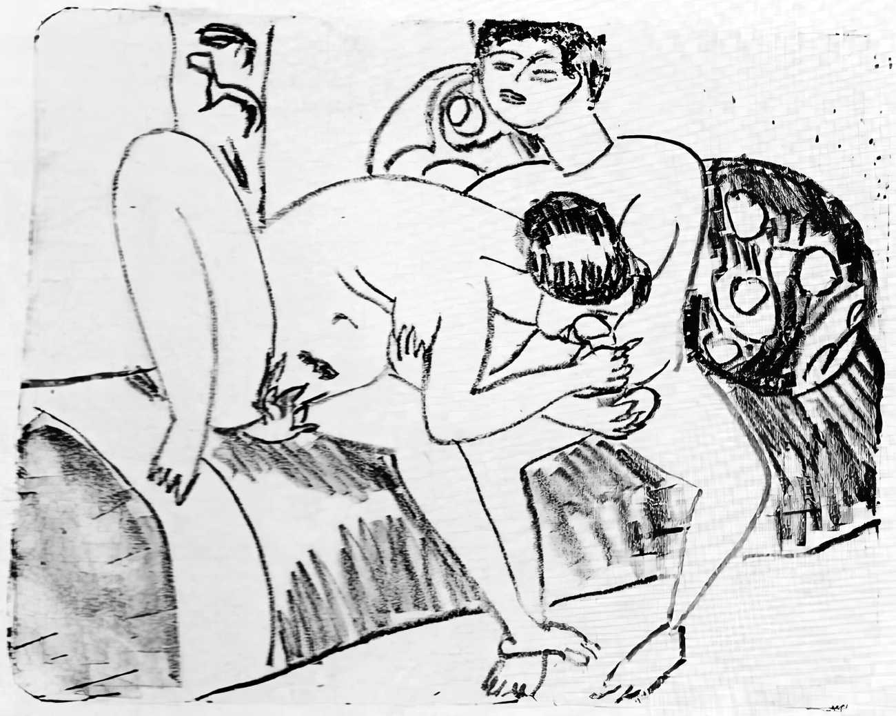 This linked series of explicitly sexual engravings was made in Berlin in 1912–13, at a time when Kirchner’s love life was closely tied to two young women who became central to both his emotional world and his artistic development – Erna Schilling and, to a lesser extent, her sister Gerda. Erna, a dancer and cabaret performer, met Kirchner in late 1911., and their relationship quickly became a long-term partnership, intense, complicated, and deeply interwoven with Kirchner’s work. Erna provided not just sexual and emotional companionship, but also practical stability during a turbulent period of urban overstimulation and artistic ambition. She modelled for him constantly, appearing in numerous drawings, prints, and paintings: Kirchner was drawn to her independence and Bohemian background, while Erna adapted to his volatile temperament and growing psychological struggles.