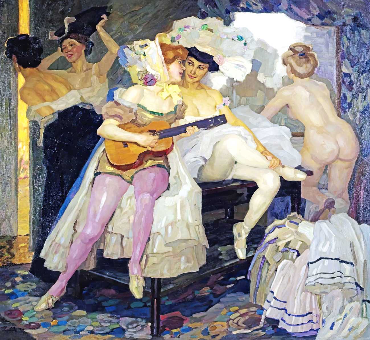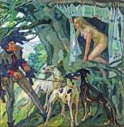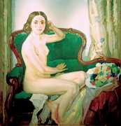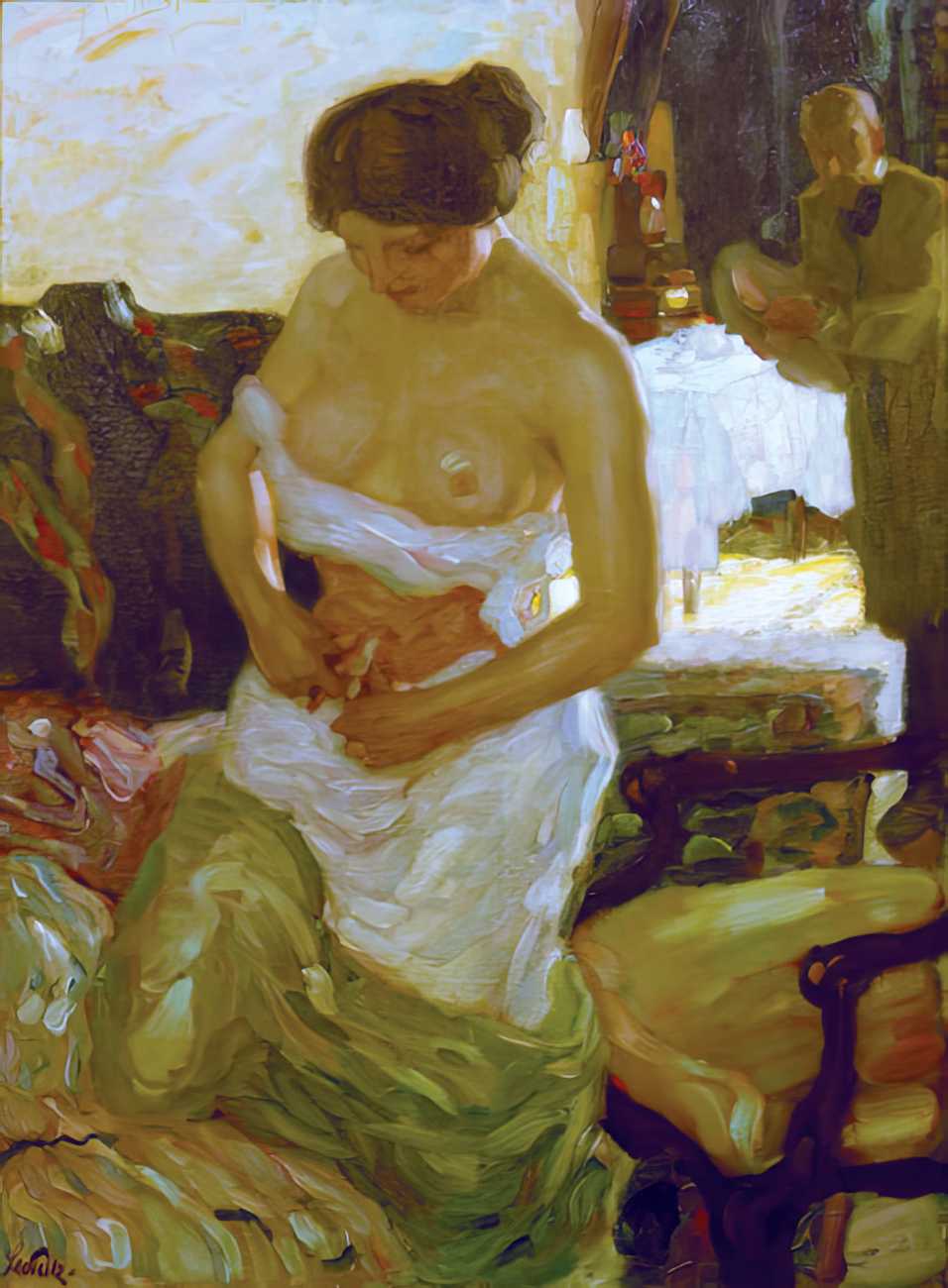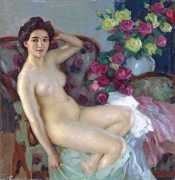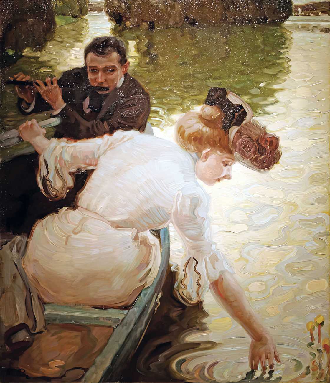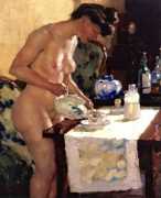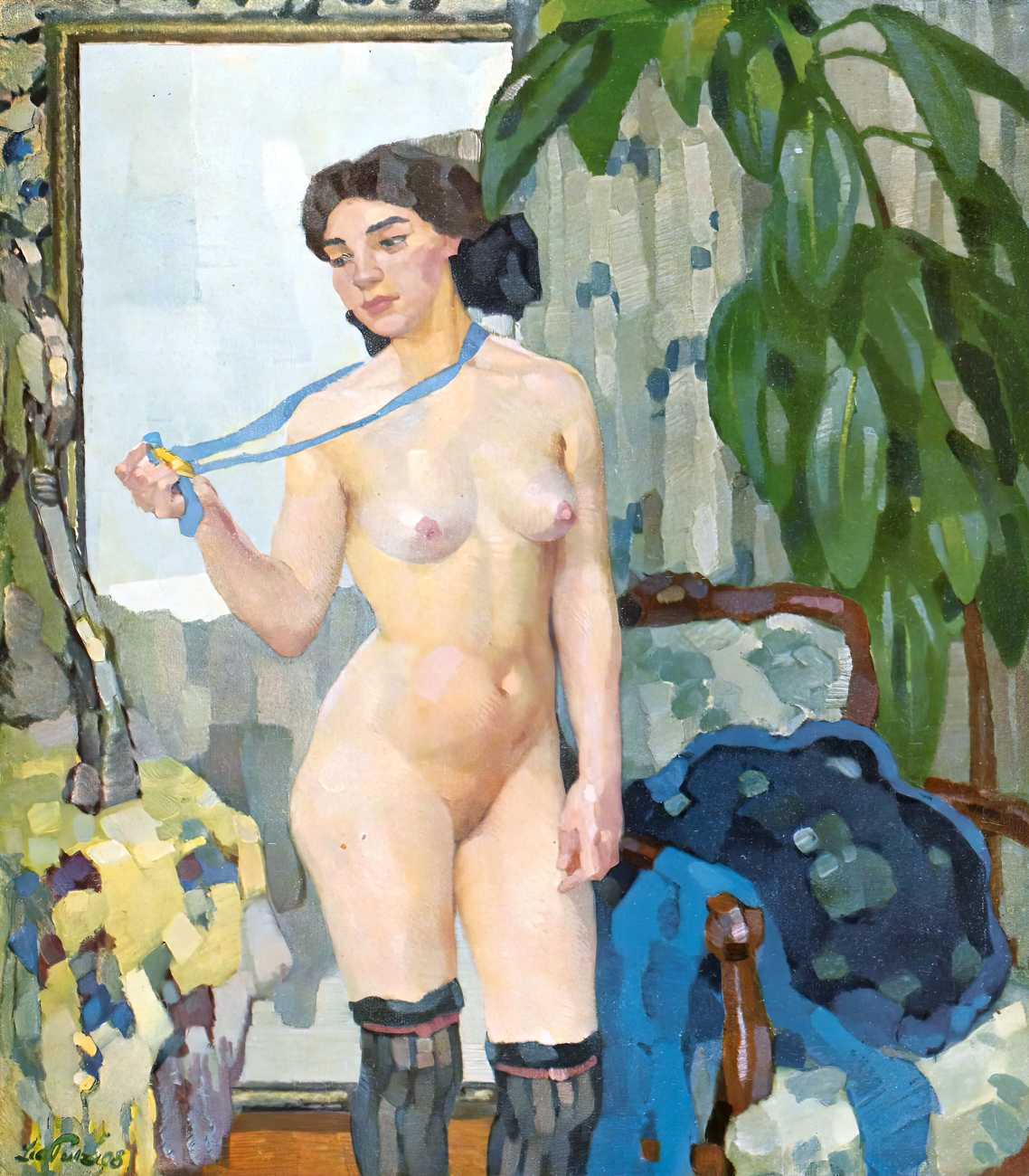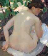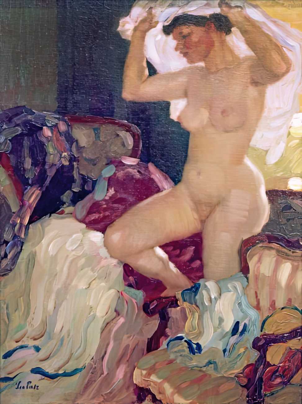 Leo Putz explored eroticism through his oil paintings of naked women, producing works that balance art nouveau elegance with an impressionist sensibility. Rather than shocking revelation, his erotic paintings tend toward a cultivated sensuality, with languid poses, softly modelled flesh, and a focus on atmosphere – sunlit skin, reflective water, and the enclosing landscape – which makes sexuality part of a larger, pictorial harmony.