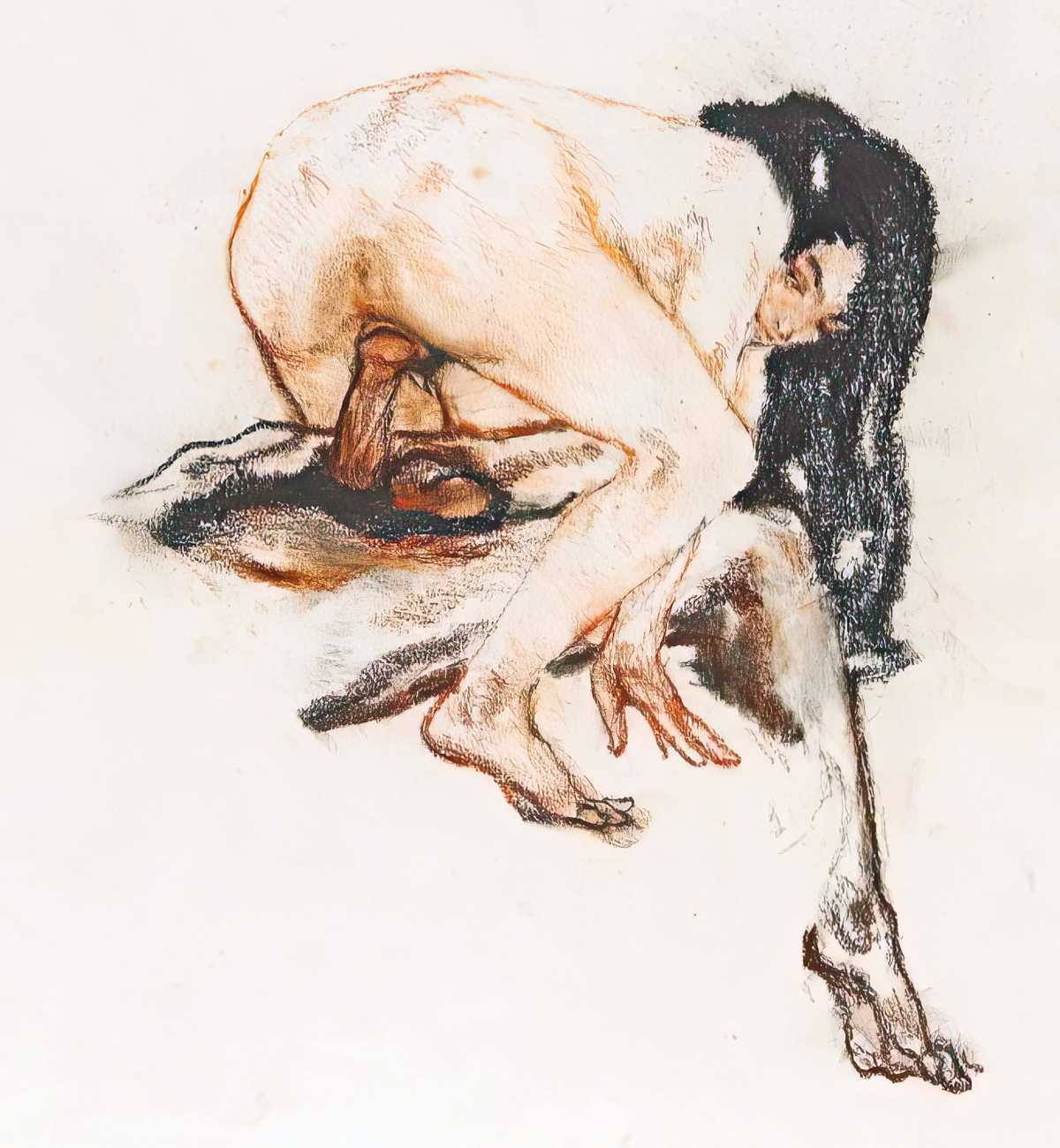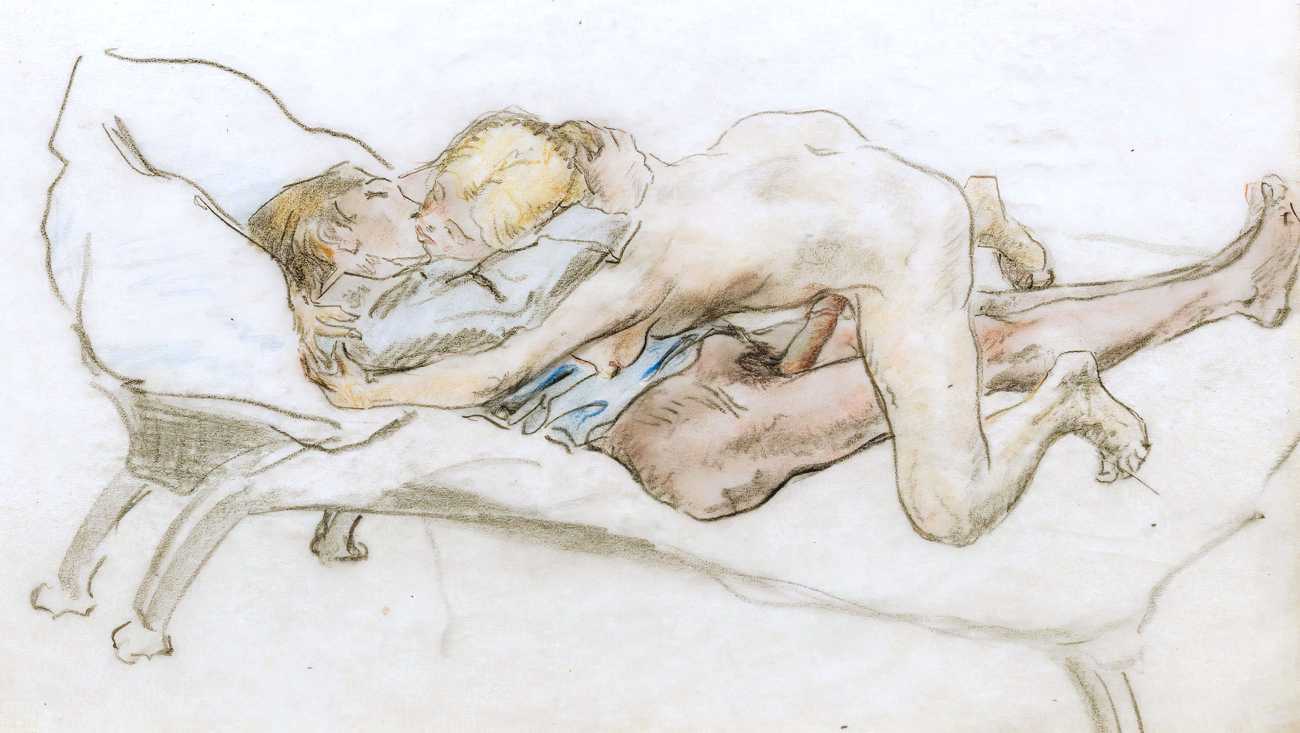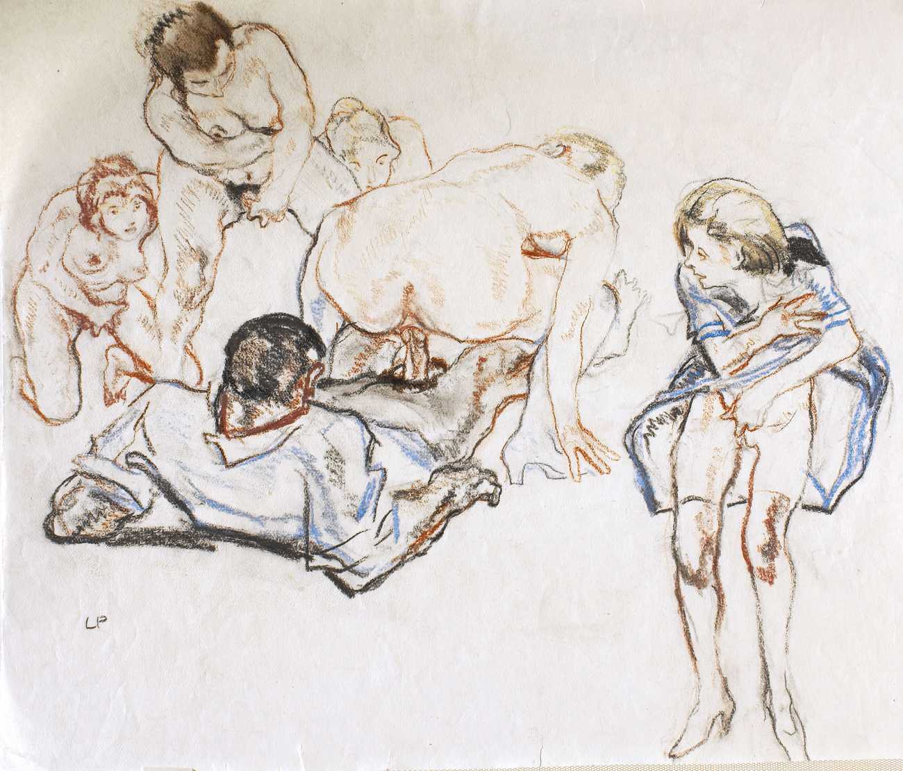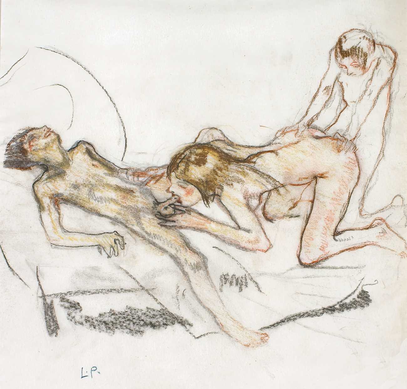 Leo Putz’s erotic drawings occupy a different register from his oil paintings – smaller, more intimate works on paper that trade the canvases’ painterly colour fields and surface build-up for direct line, immediacy, and the opportunity to imagine a much more explicit range of sexual subjects. Where his oils celebrate light, atmosphere and pictorial harmony, many of the known erotic works, executed in pencil, coloured pencil, chalk and pastel, rely on the sensual suggestion of contour and touch: the sweep of a back, the weight of a thigh, all rendered in a few confident strokes.