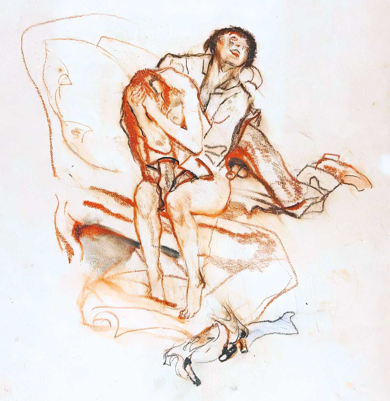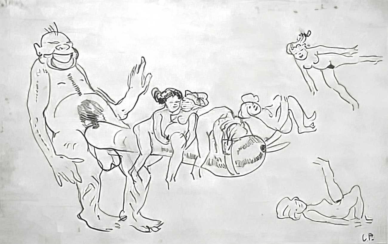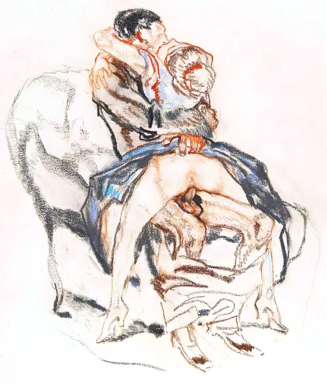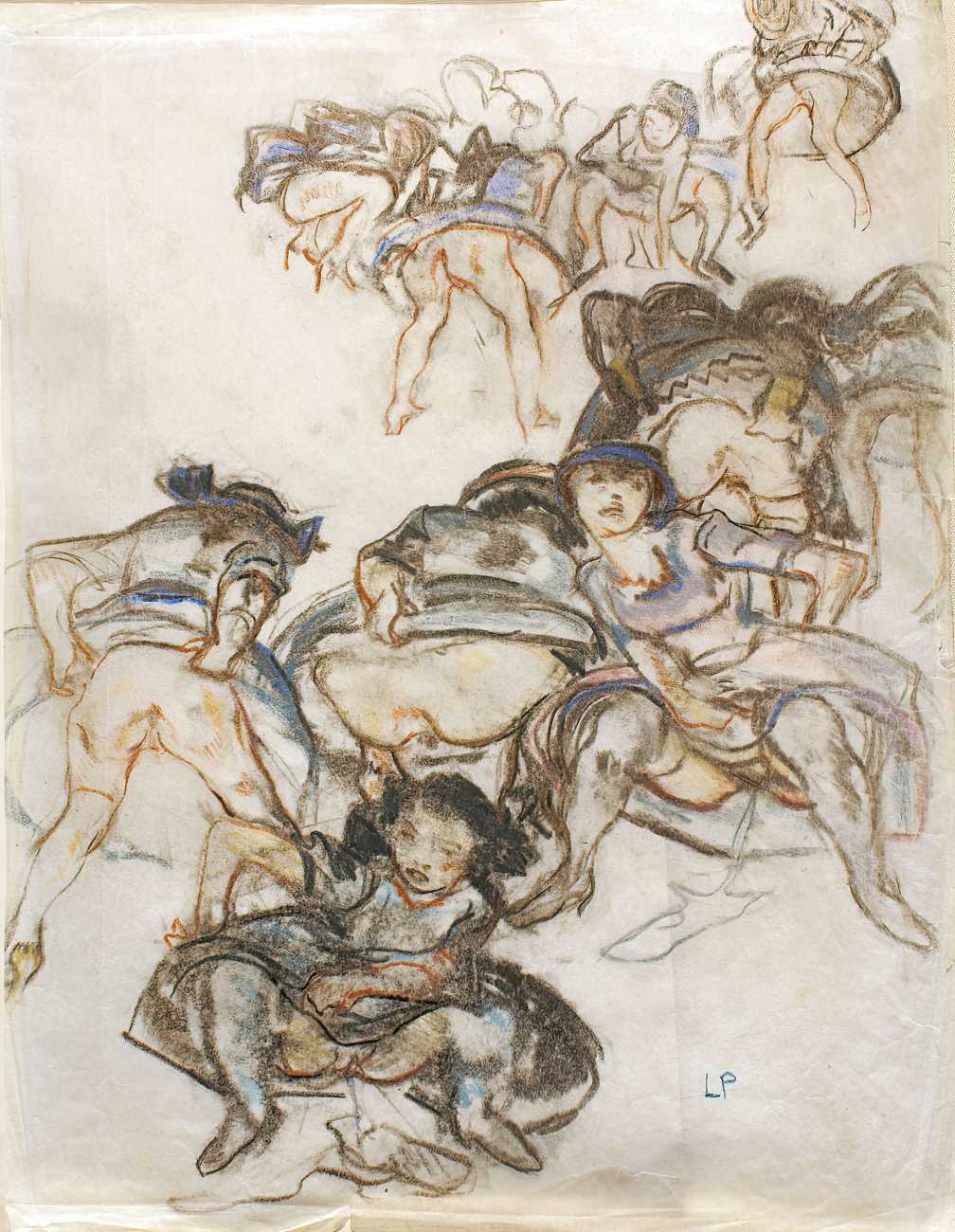 Leo Putz’s erotic drawings occupy a different register from his oil paintings – smaller, more intimate works on paper that trade the canvases’ painterly colour fields and surface build-up for direct line, immediacy, and the opportunity to imagine a much more explicit range of sexual subjects. Where his oils celebrate light, atmosphere and pictorial harmony, many of the known erotic works, executed in pencil, coloured pencil, chalk and pastel, rely on the sensual suggestion of contour and touch: the sweep of a back, the weight of a thigh, all rendered in a few confident strokes.