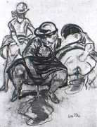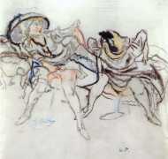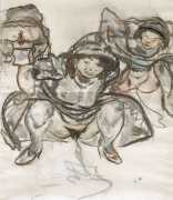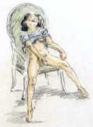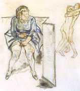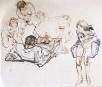 His drawings allowed Putz to explore the figure with a quicker, more intimate hand. Pastel and coloured pencil permit immediate modulation of skin tone on paper without the drying time and layering oil requires. This makes the drawings feel more private and improvisational – studies or vignettes meant for close viewing, collecting in portfolios, or reproduction in prints rather than the public display function that large oils fulfilled.
