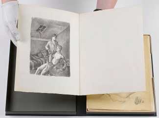 In May 2025 Vallot Auctioneers offered a remarkably well-preserved clamshell volume of a suite of lithographs by the French actor and artist Roland Caillaux. Produced in 1945 in an edition of only 115 copies, the portfolio includes twenty lithographs by Caillaux, accompanying poetry titled Vingt lithographies pour un livre que j’ai lu (Twenty Lithographs for a Book I have Read), written by his friend Jean Genet. The images depict a suite of clandestine meetings and sexual encounters of young men in dingy alleyways and tiny bohemian bedrooms. Carefully rendered homoerotic scenes are followed with images depicting encounters with the law – in a courtroom and multiple prison-like cells.