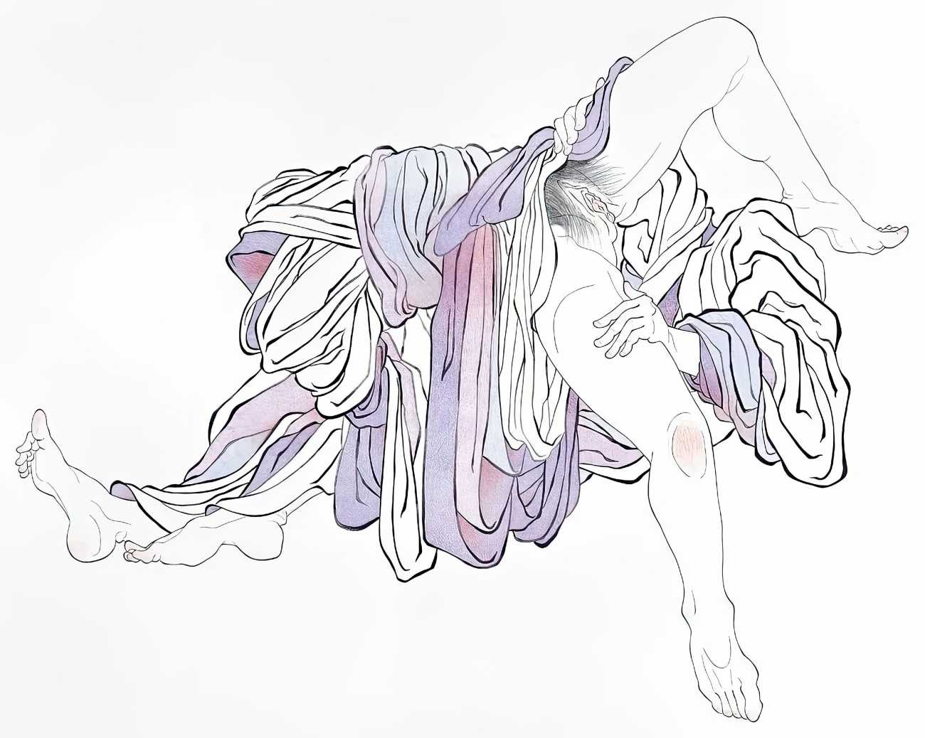 Robinson’s practice is rooted in traditional Japanese art forms, especially shunga, a genre of erotic woodblock prints and ukiyo-e that flourished in Japan’s Edo period. She first discovered shunga as an undergraduate, explaining that her initial interest came from a desire to respond to criticism that her earlier work was too safe by deliberately embracing erotic subject matter, an interest that grew into a serious artistic inquiry.