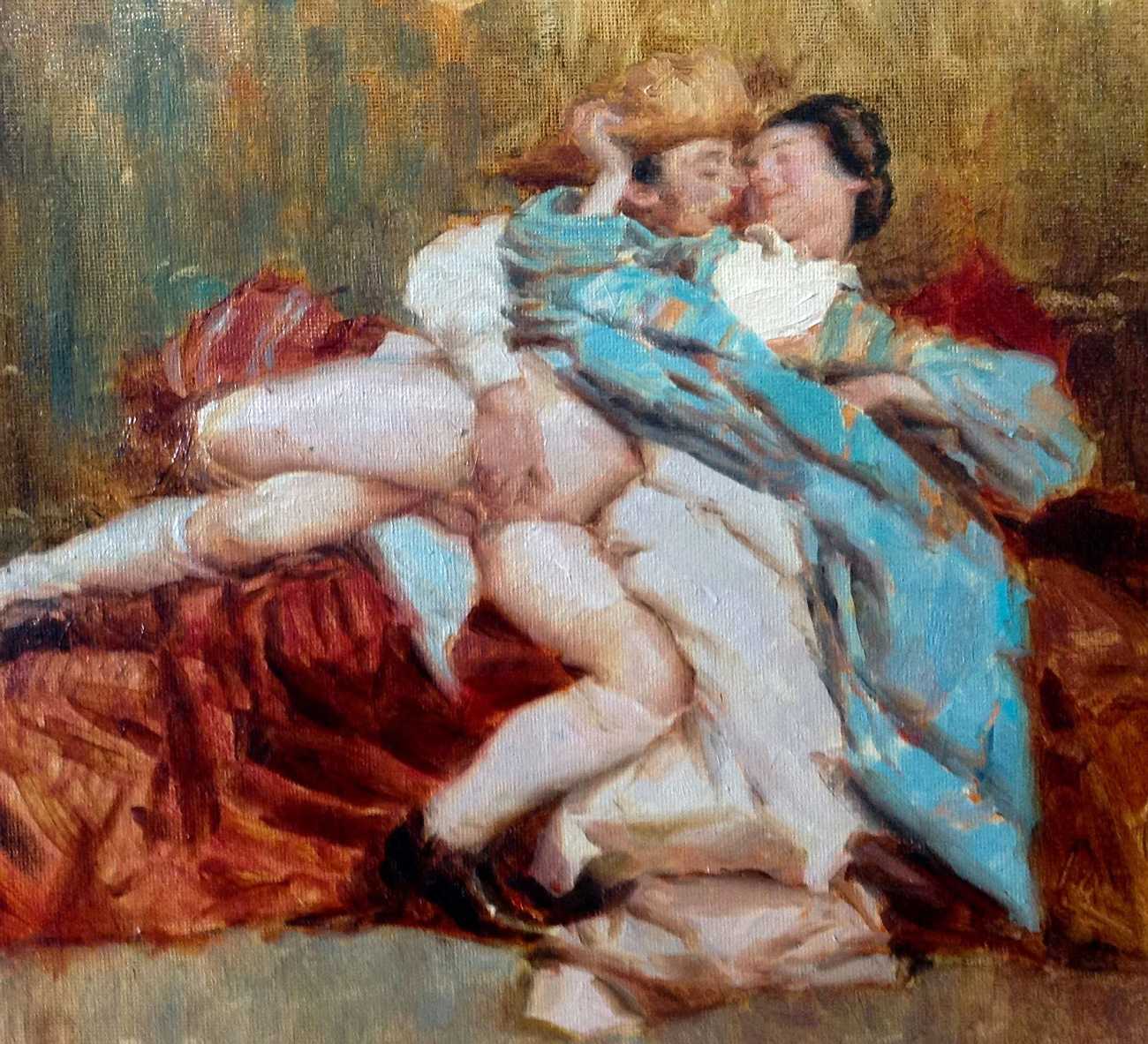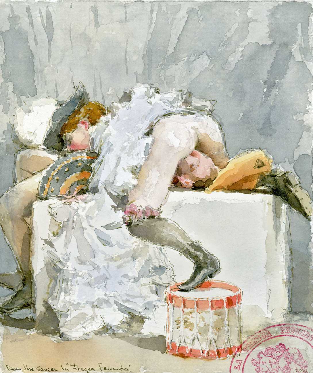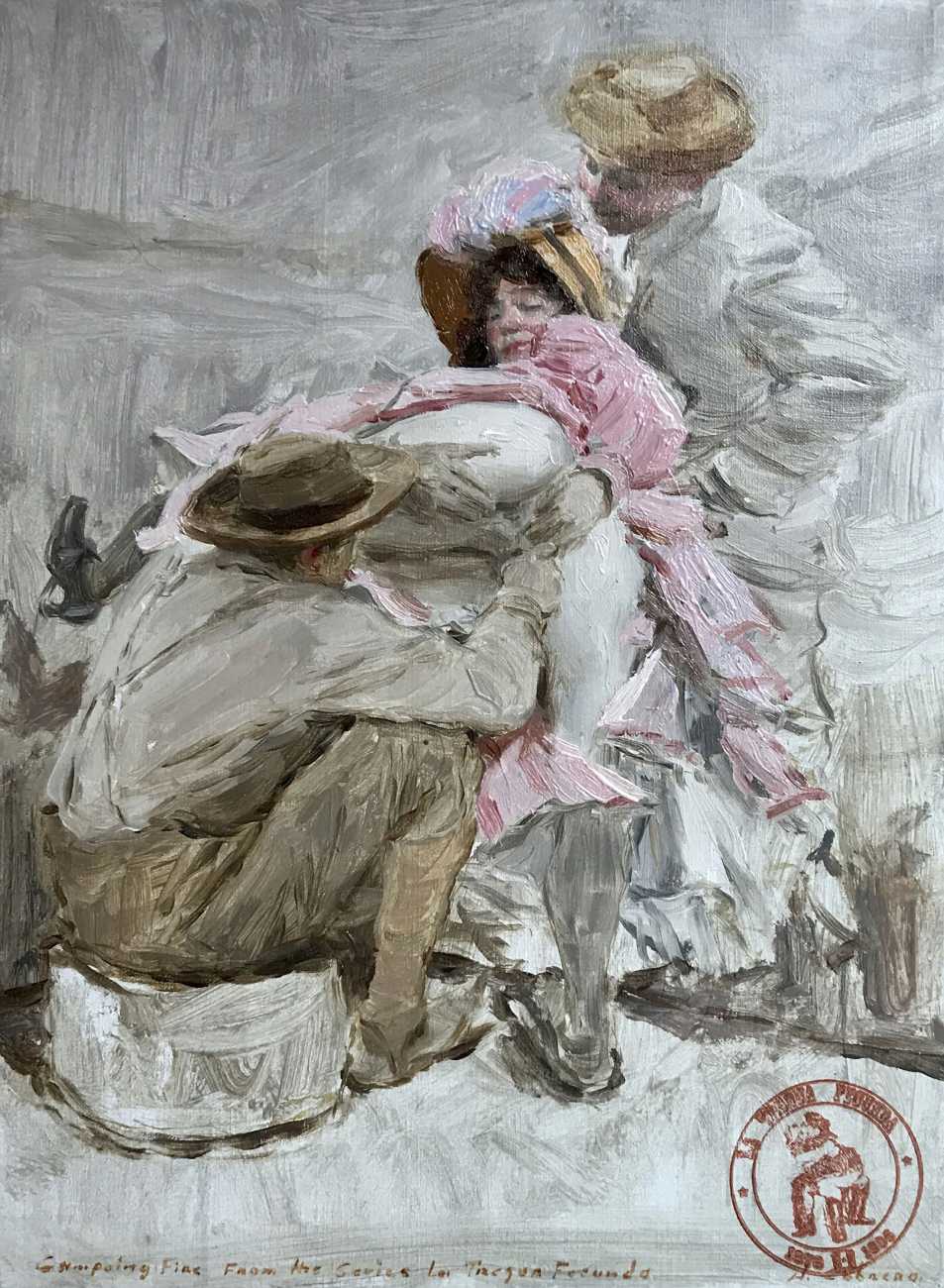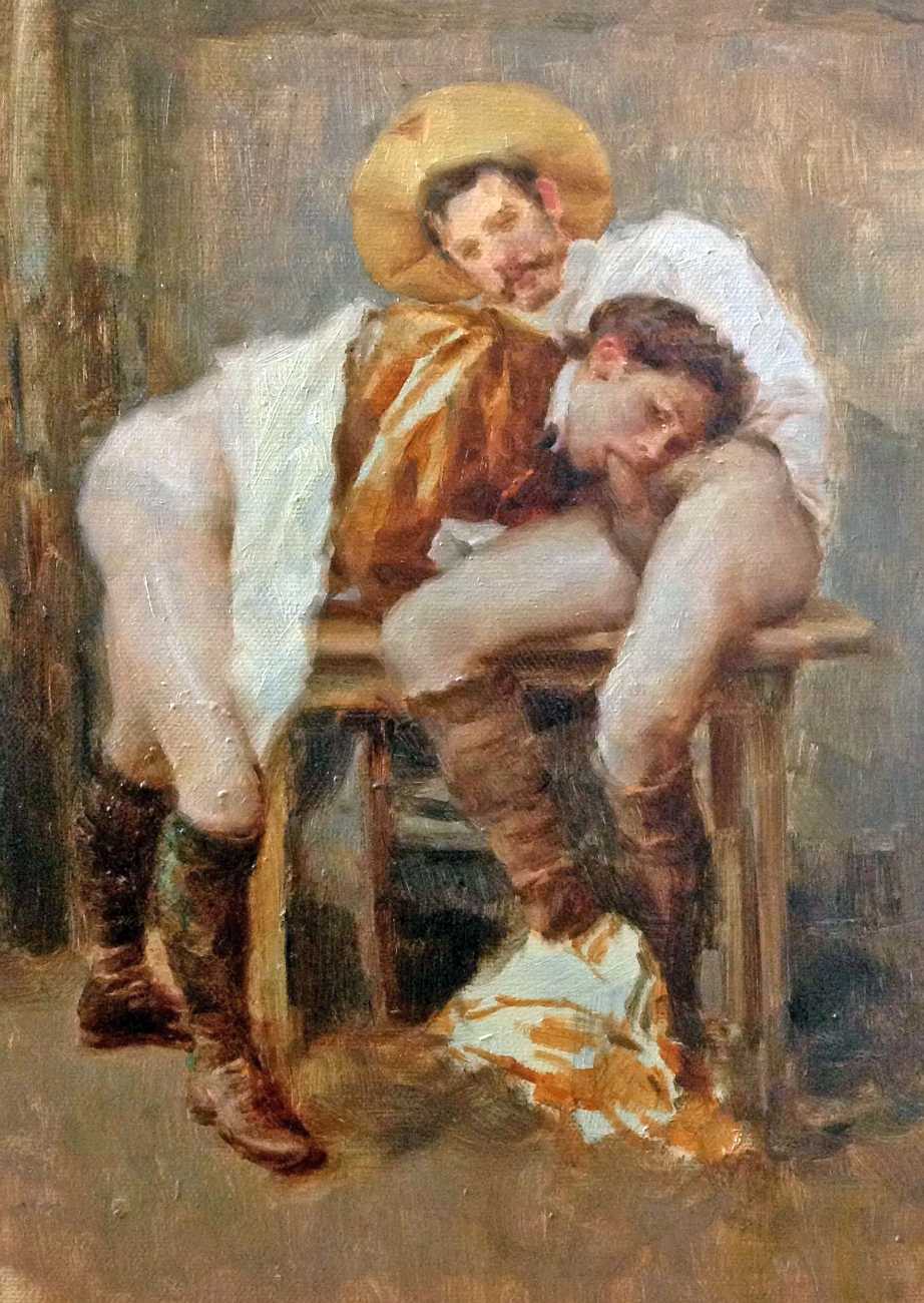 In his work, Cabrera Montejo recreates theatrical scenarios inspired by the historical periods like the interwar period known as La Tregua Fecunda or Fertile Truce (1879–95), and the Cuban War of Independence (1895–98). His imagined subjects are anecdotal heroes, not depicted like the traditional representations of heroes in Cuban colonial paintings by Juan Emilio Hernández Giro, Leopoldo Romañach and Armando Menocal. Cabrera Montejo’s characters have carnal, ludic, sensual desires. His subjects are less military and more human, not solemn serious figures on pedestals.