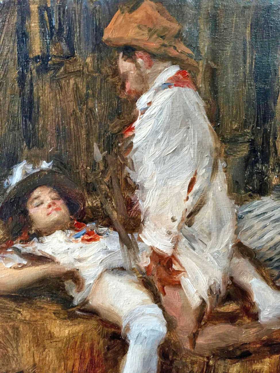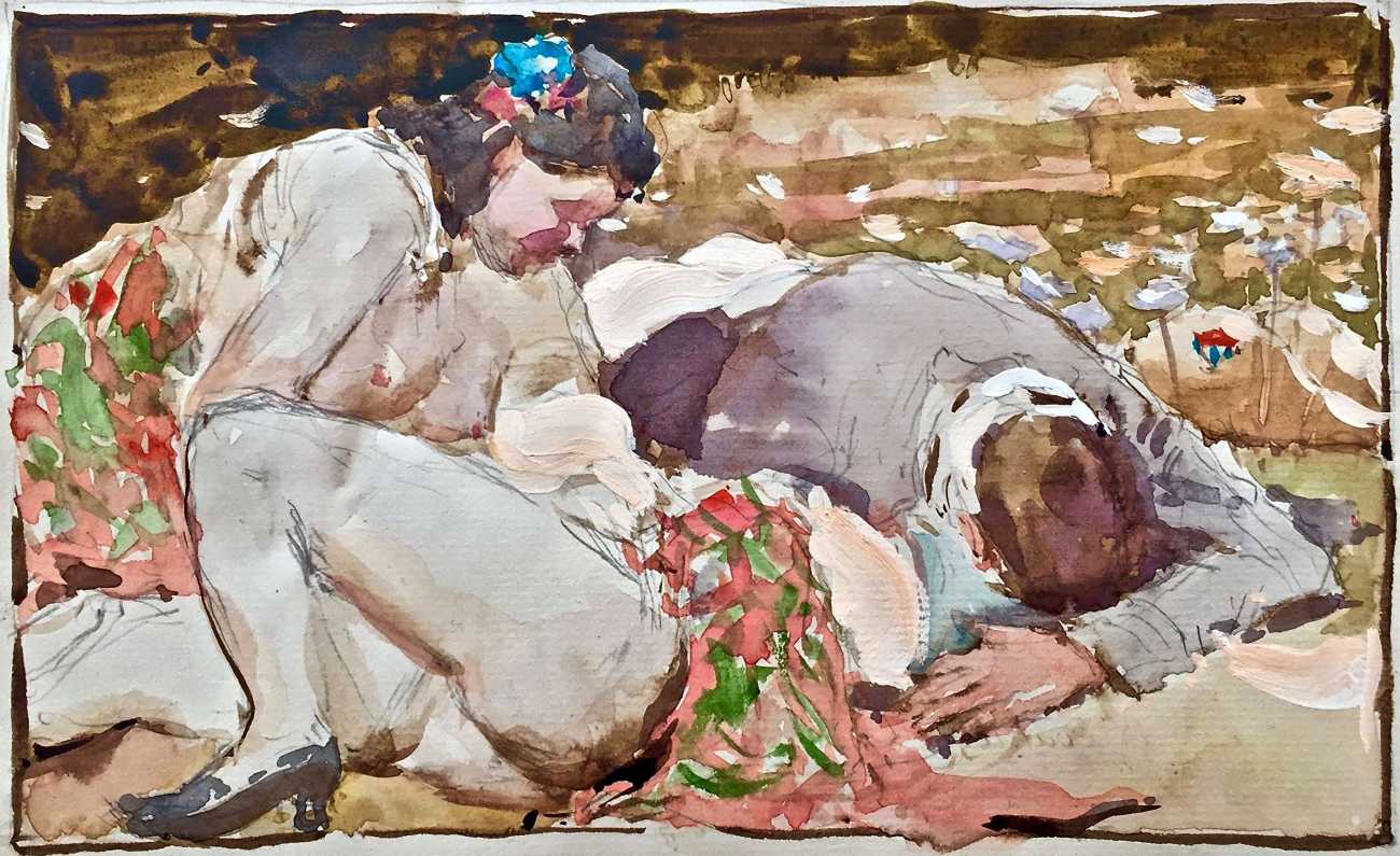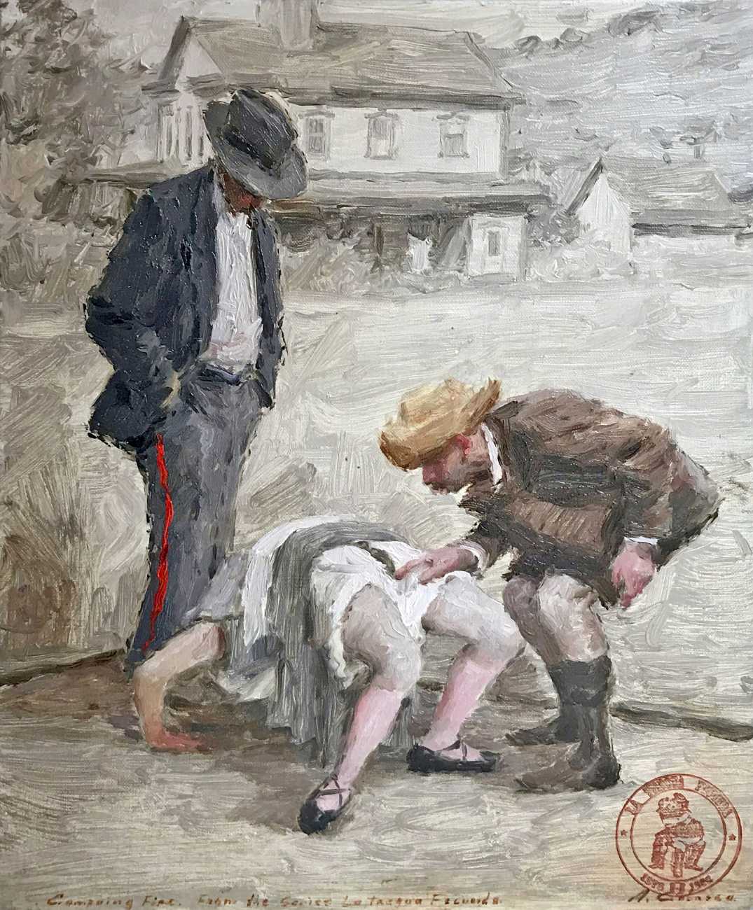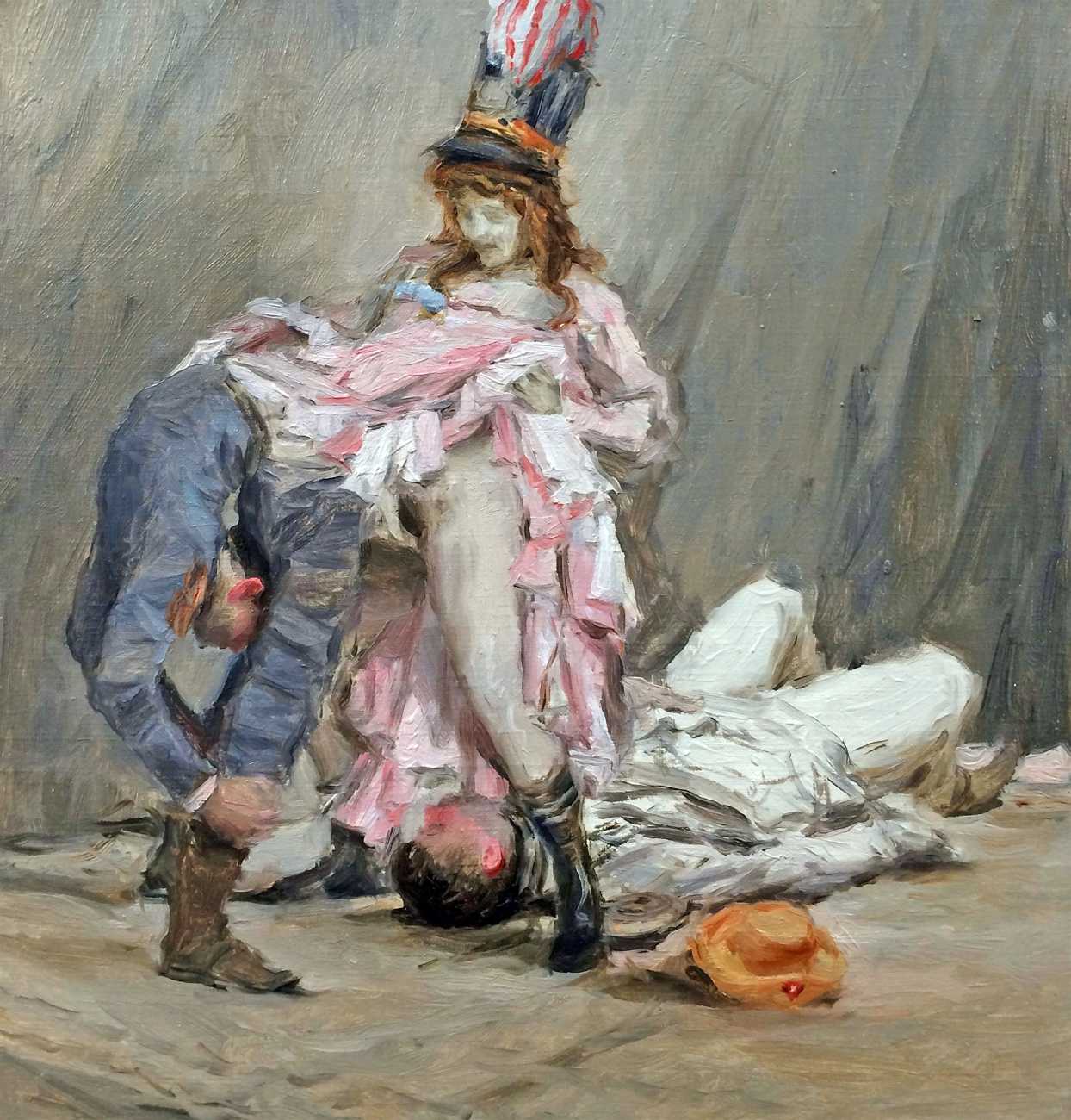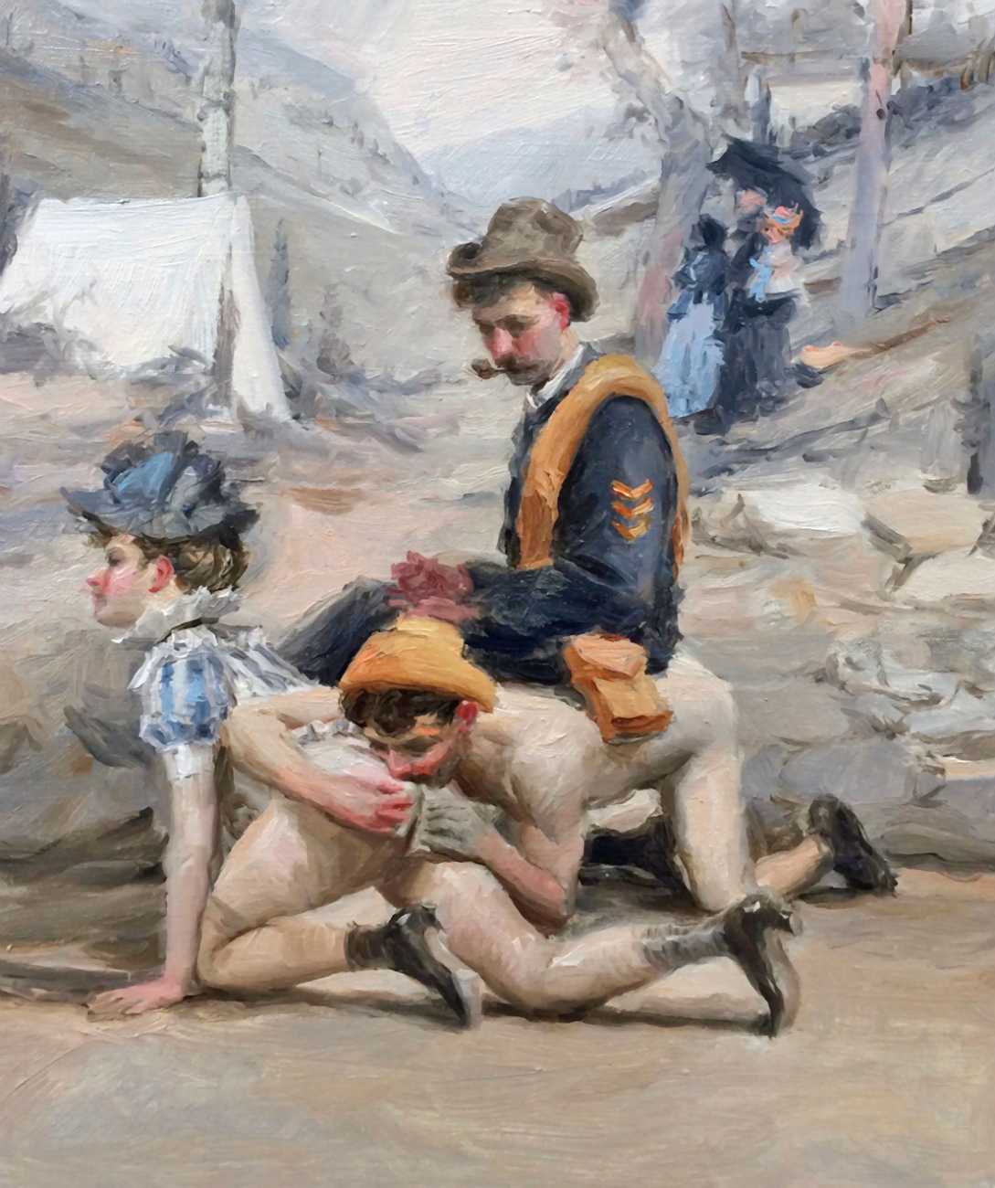 In his work, Cabrera Montejo recreates theatrical scenarios inspired by the historical periods like the interwar period known as La Tregua Fecunda or Fertile Truce (1879–95), and the Cuban War of Independence (1895–98). His imagined subjects are anecdotal heroes, not depicted like the traditional representations of heroes in Cuban colonial paintings by Juan Emilio Hernández Giro, Leopoldo Romañach and Armando Menocal. Cabrera Montejo’s characters have carnal, ludic, sensual desires. His subjects are less military and more human, not solemn serious figures on pedestals.