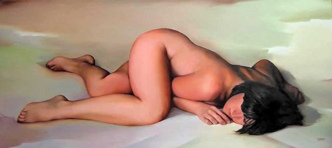 In conventional artspeak the subject of Caroline Westerhout’s naked-woman paintings would be ‘the nude’, but her studies of nakedness go far beyond such conventions. She uses paint to explore the intimate and close-up contours of the naked body, resulting in a more immediate relationship between the viewer and her subject – very often modelled, with the aid of photographs, on herself. Her work invites her audience to participate in an exploration of relationships and emotions, a shared quest requiring, often demanding, a personal response.