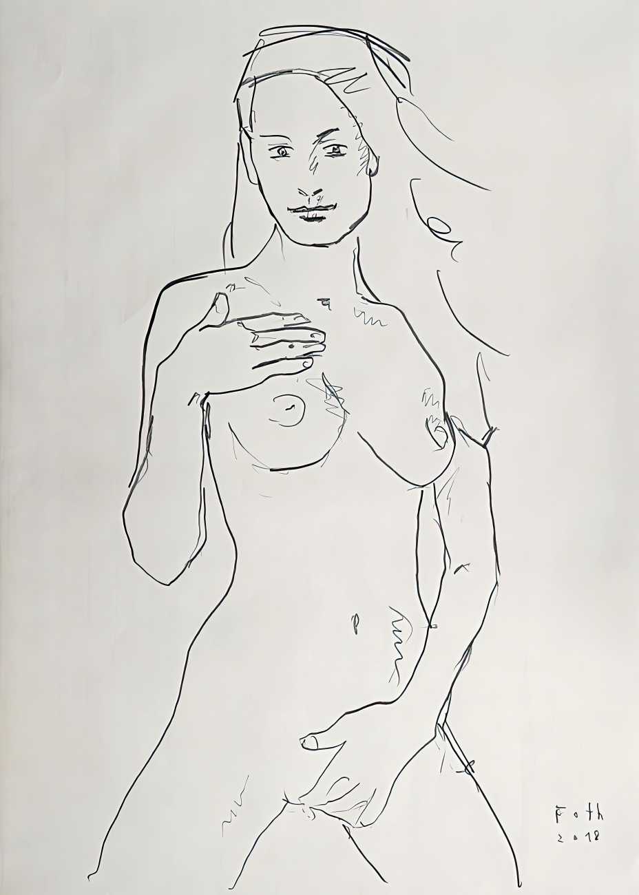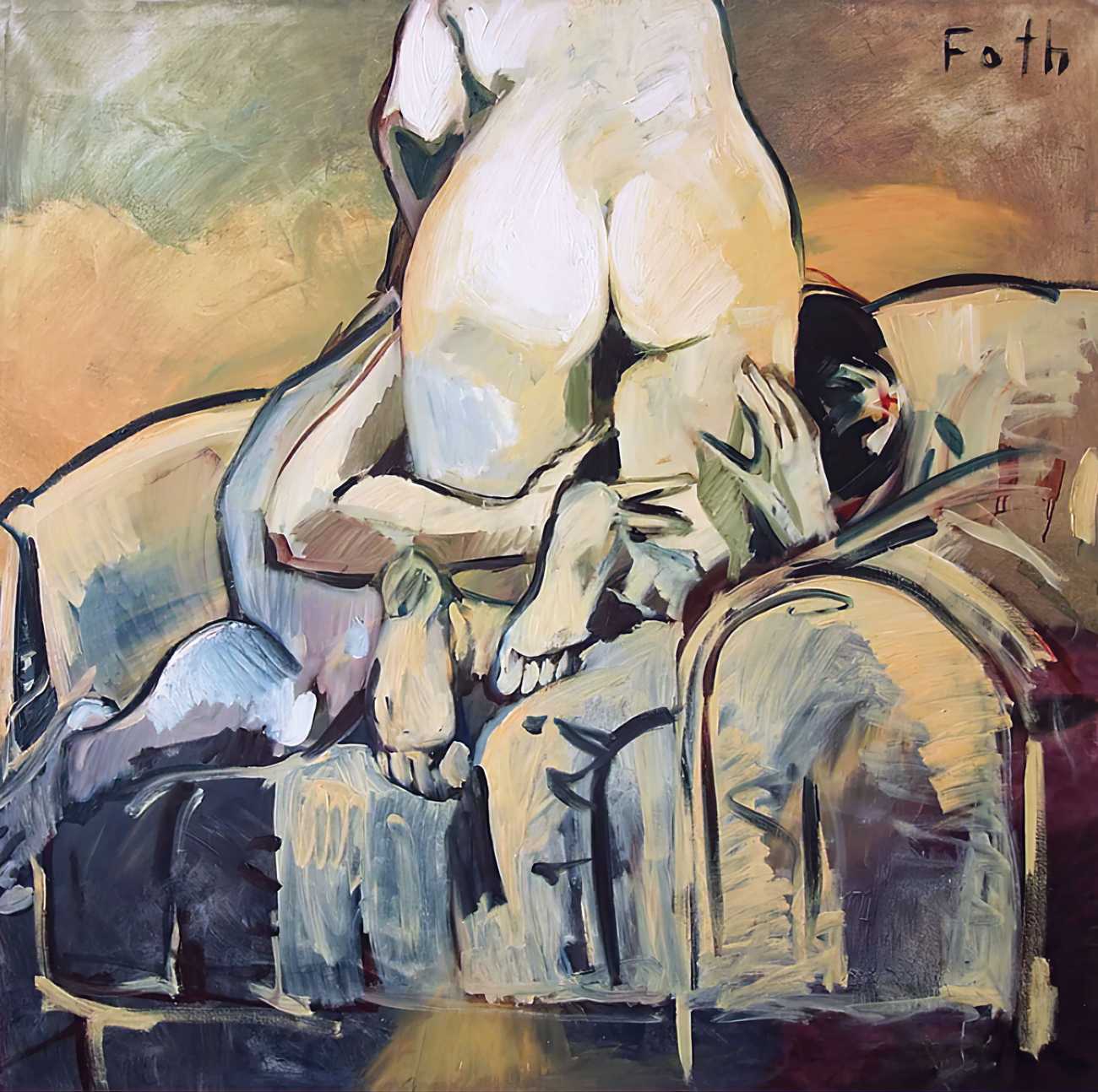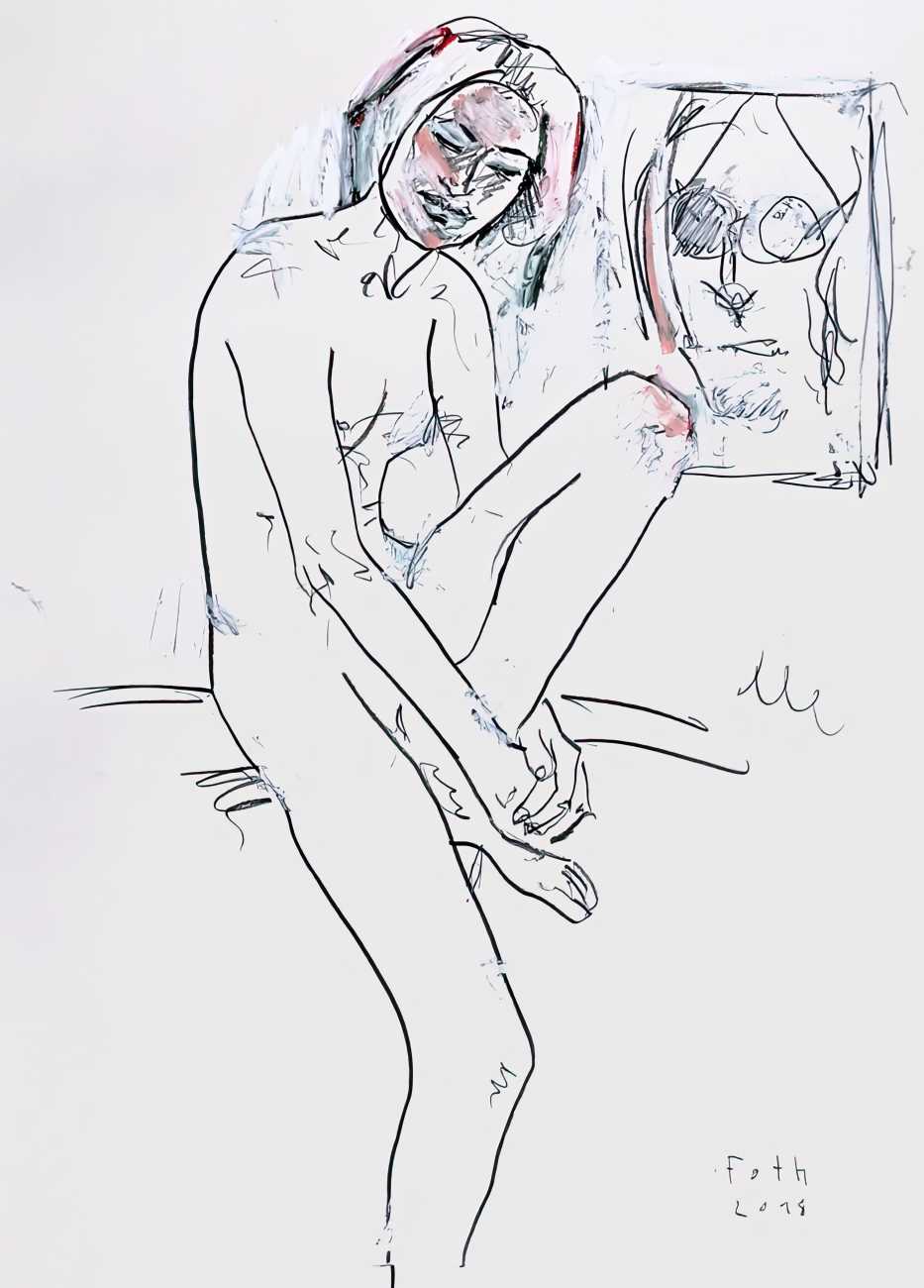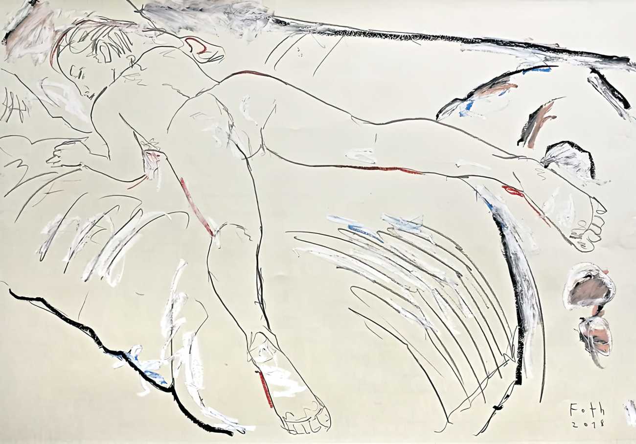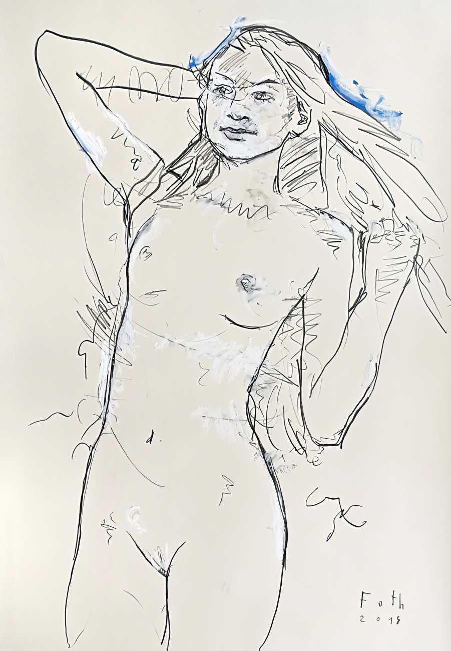Throughout his career Detlev Foth has repeatedly returned to the naked body as a central subject, both singly in paintings and drawings of female models (sometimes including himself), and also in scenes of sexual and sensual encounter. When working on his large paintings of naked bodies he often likes to work naked himself, a real commitment to both subject and the work in progress.