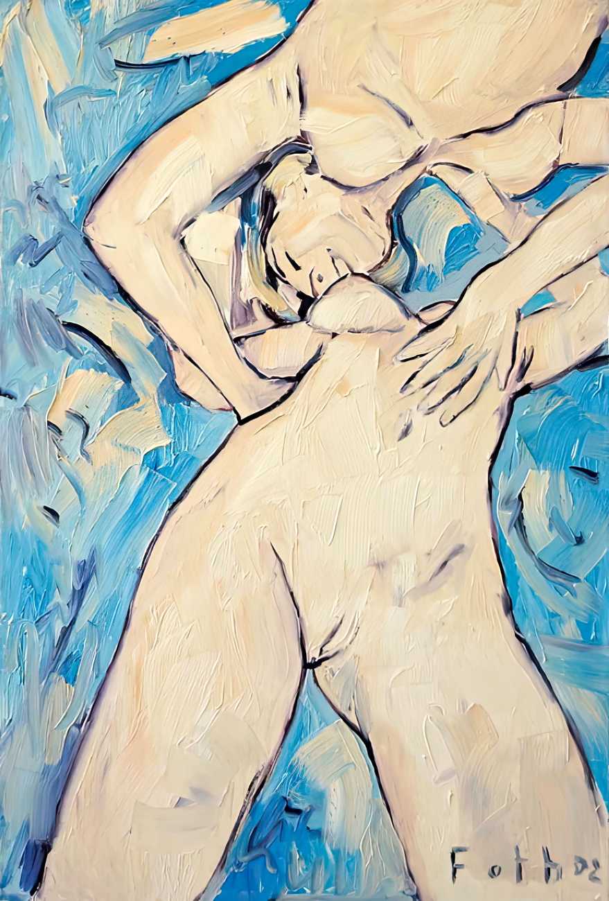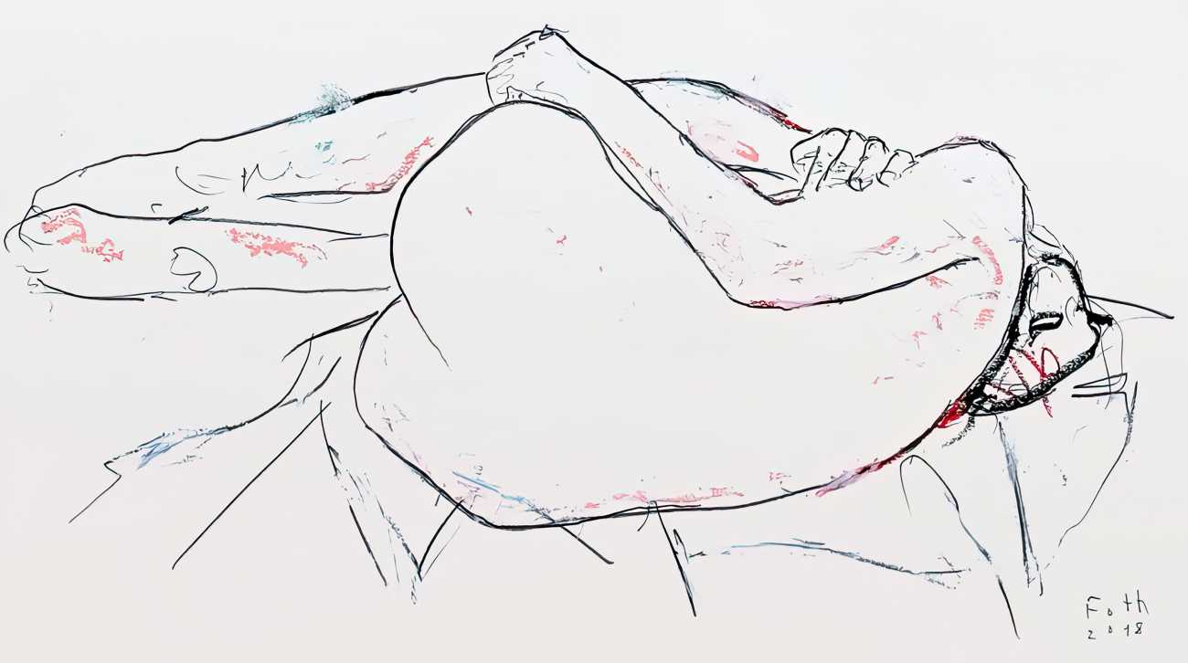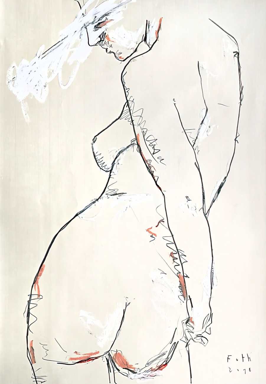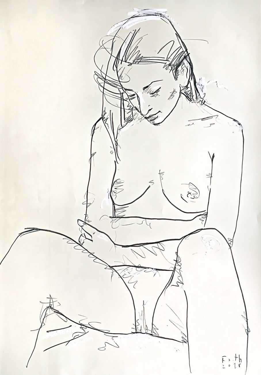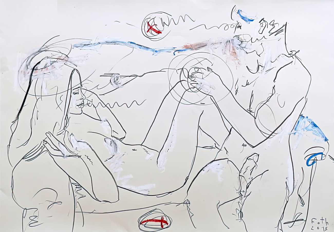 Throughout his career Detlev Foth has repeatedly returned to the naked body as a central subject, both singly in paintings and drawings of female models (sometimes including himself), and also in scenes of sexual and sensual encounter. When working on his large paintings of naked bodies he often likes to work naked himself, a real commitment to both subject and the work in progress.