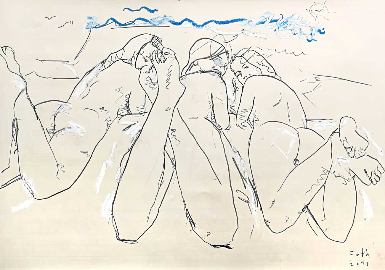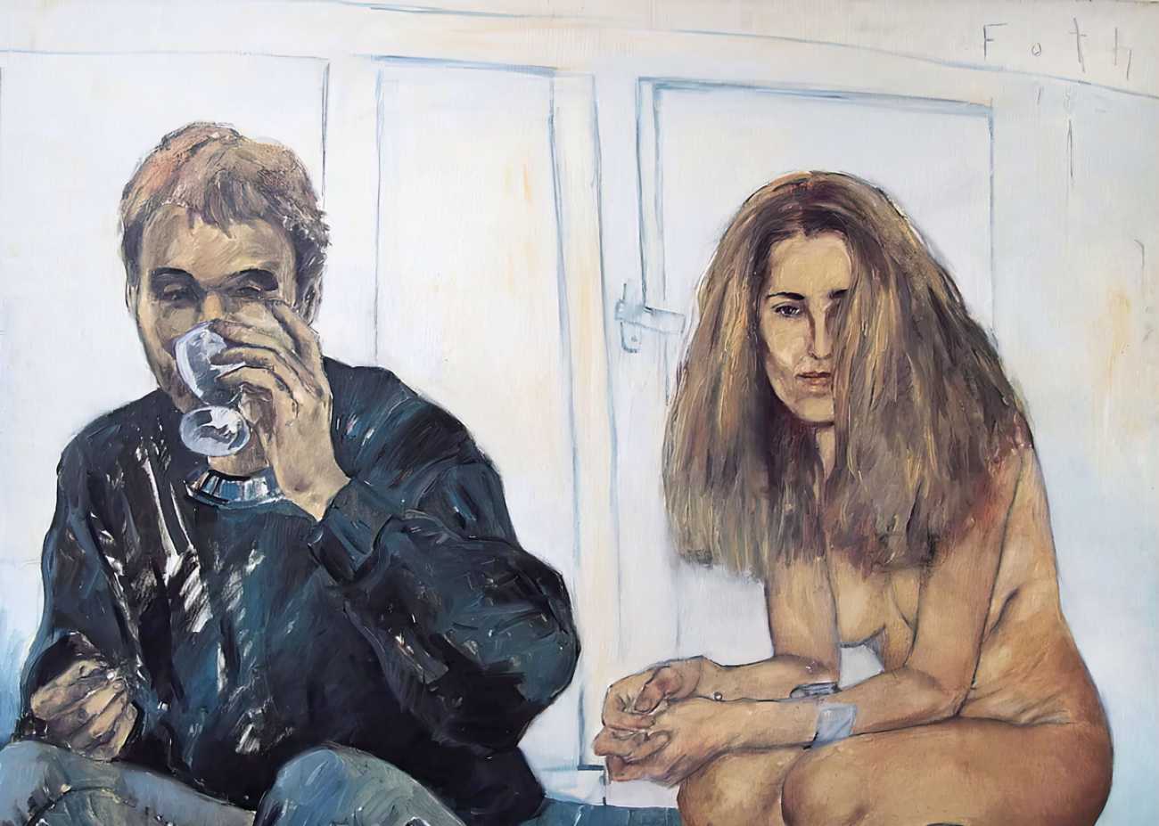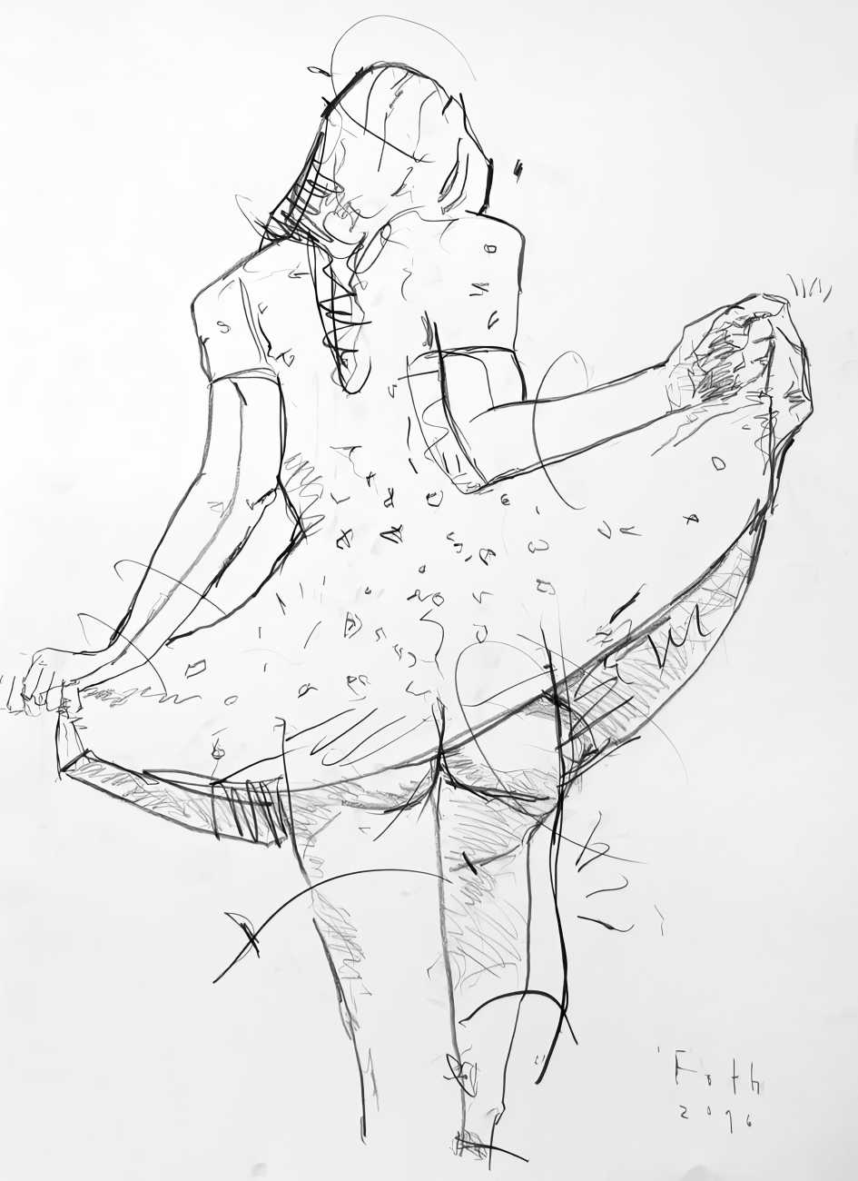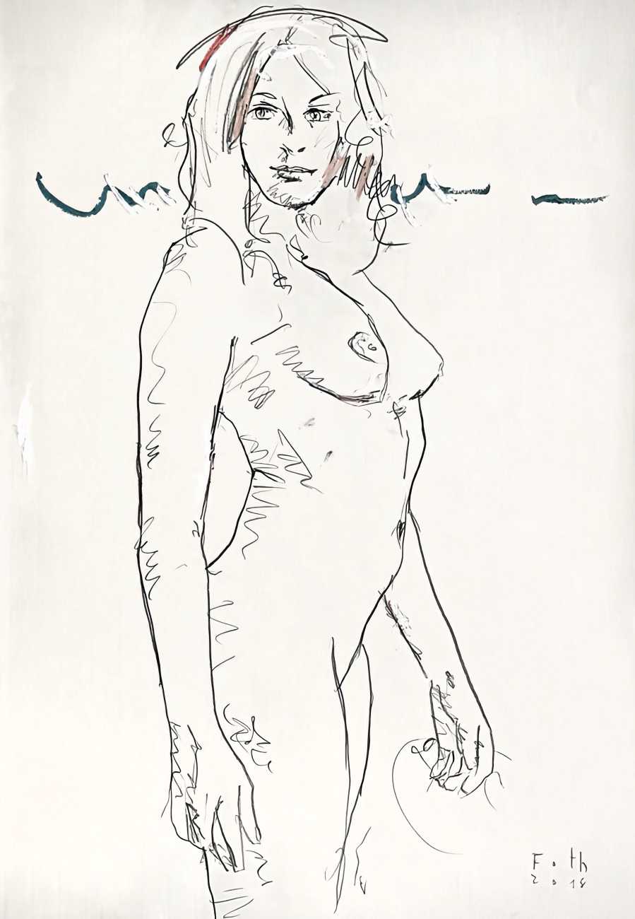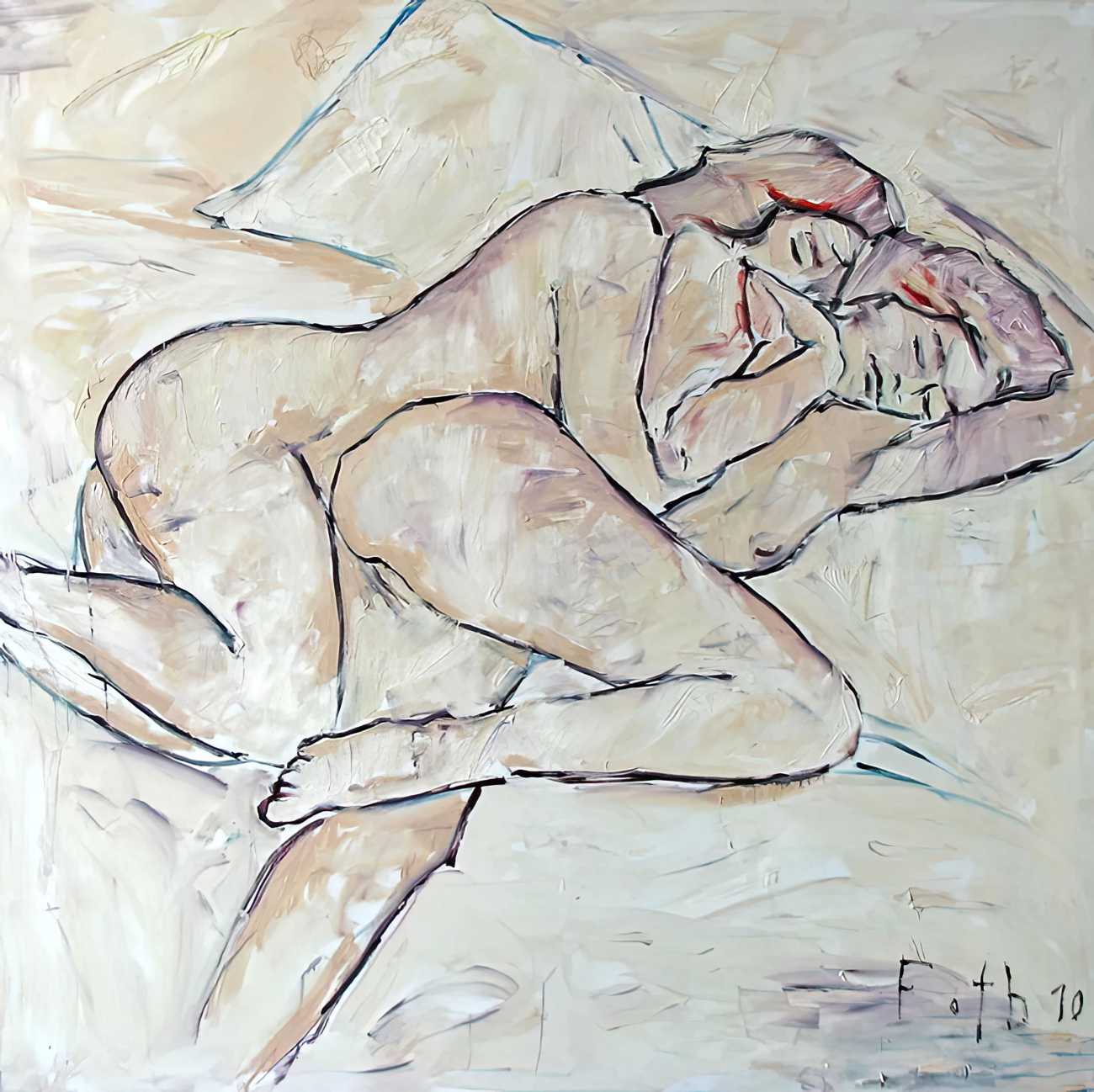Throughout his career Detlev Foth has repeatedly returned to the naked body as a central subject, both singly in paintings and drawings of female models (sometimes including himself), and also in scenes of sexual and sensual encounter. When working on his large paintings of naked bodies he often likes to work naked himself, a real commitment to both subject and the work in progress.