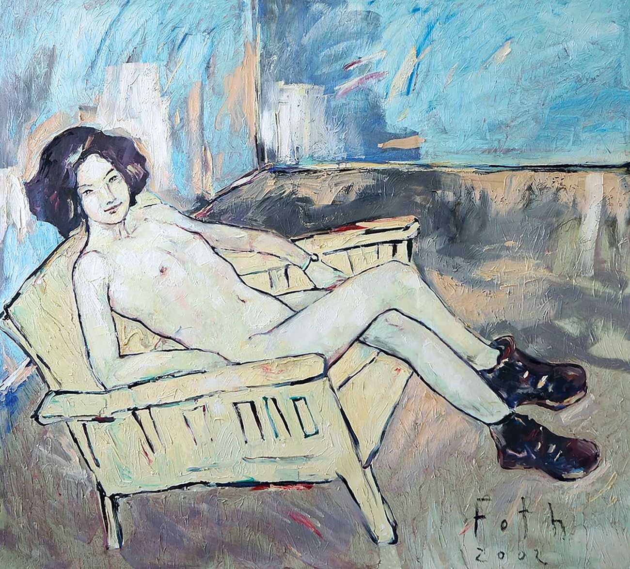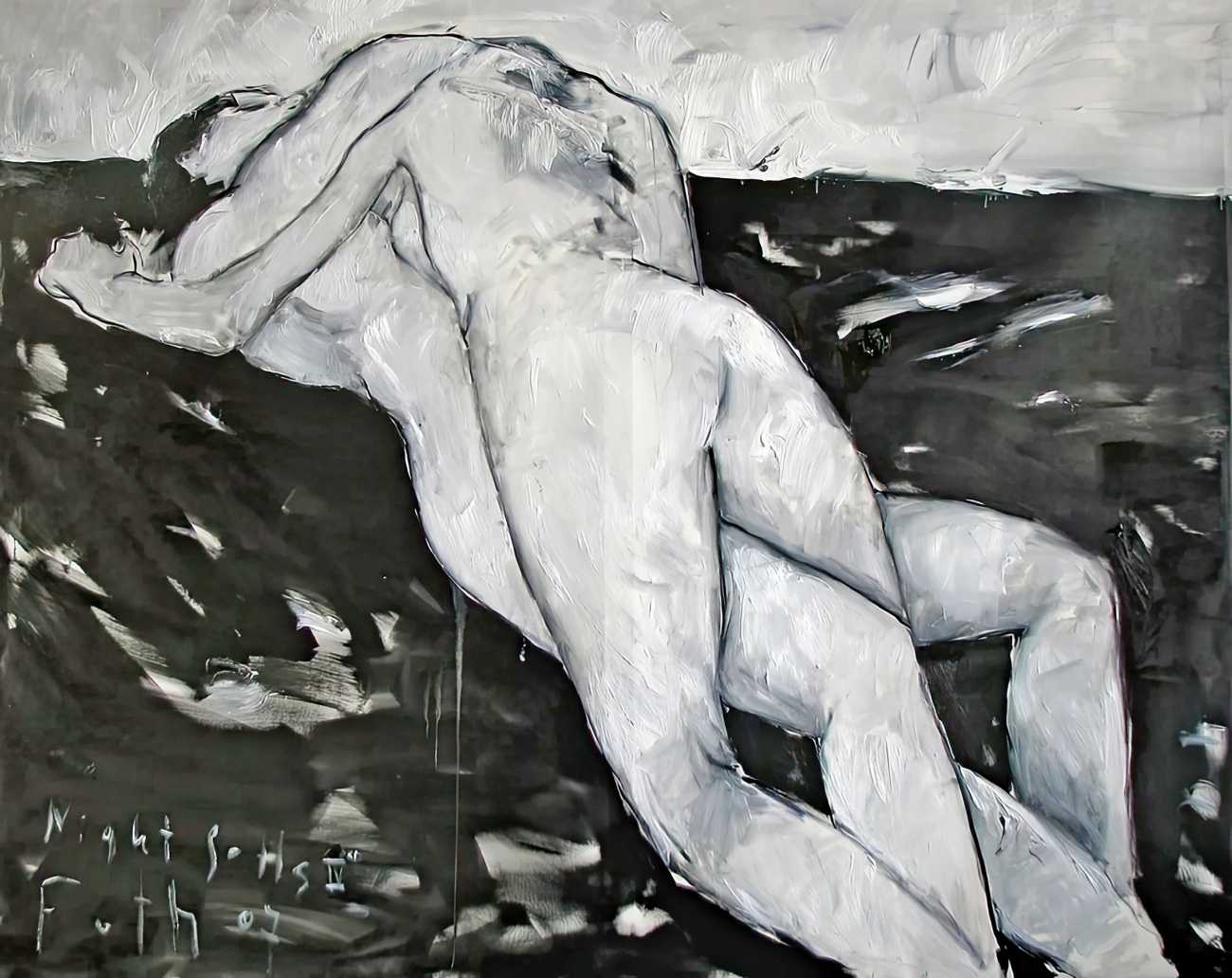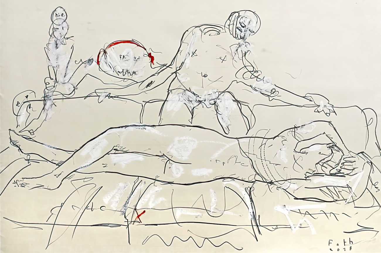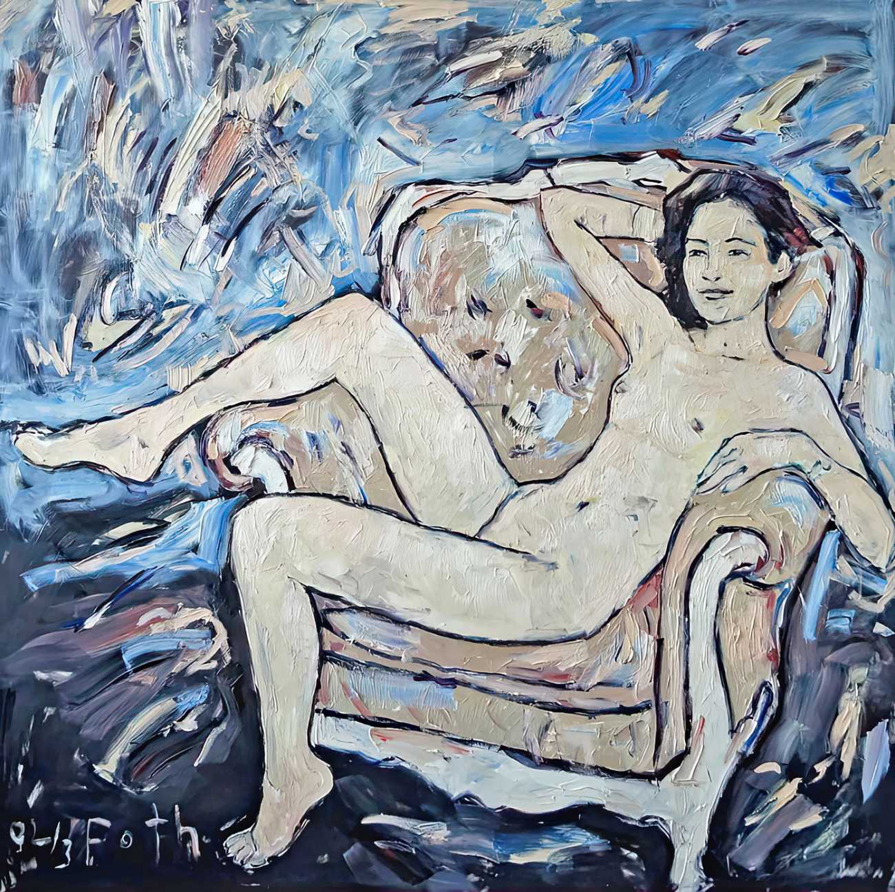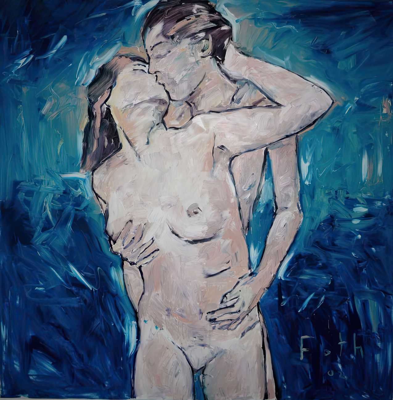 Throughout his career Detlev Foth has repeatedly returned to the naked body as a central subject, both singly in paintings and drawings of female models (sometimes including himself), and also in scenes of sexual and sensual encounter. When working on his large paintings of naked bodies he often likes to work naked himself, a real commitment to both subject and the work in progress.