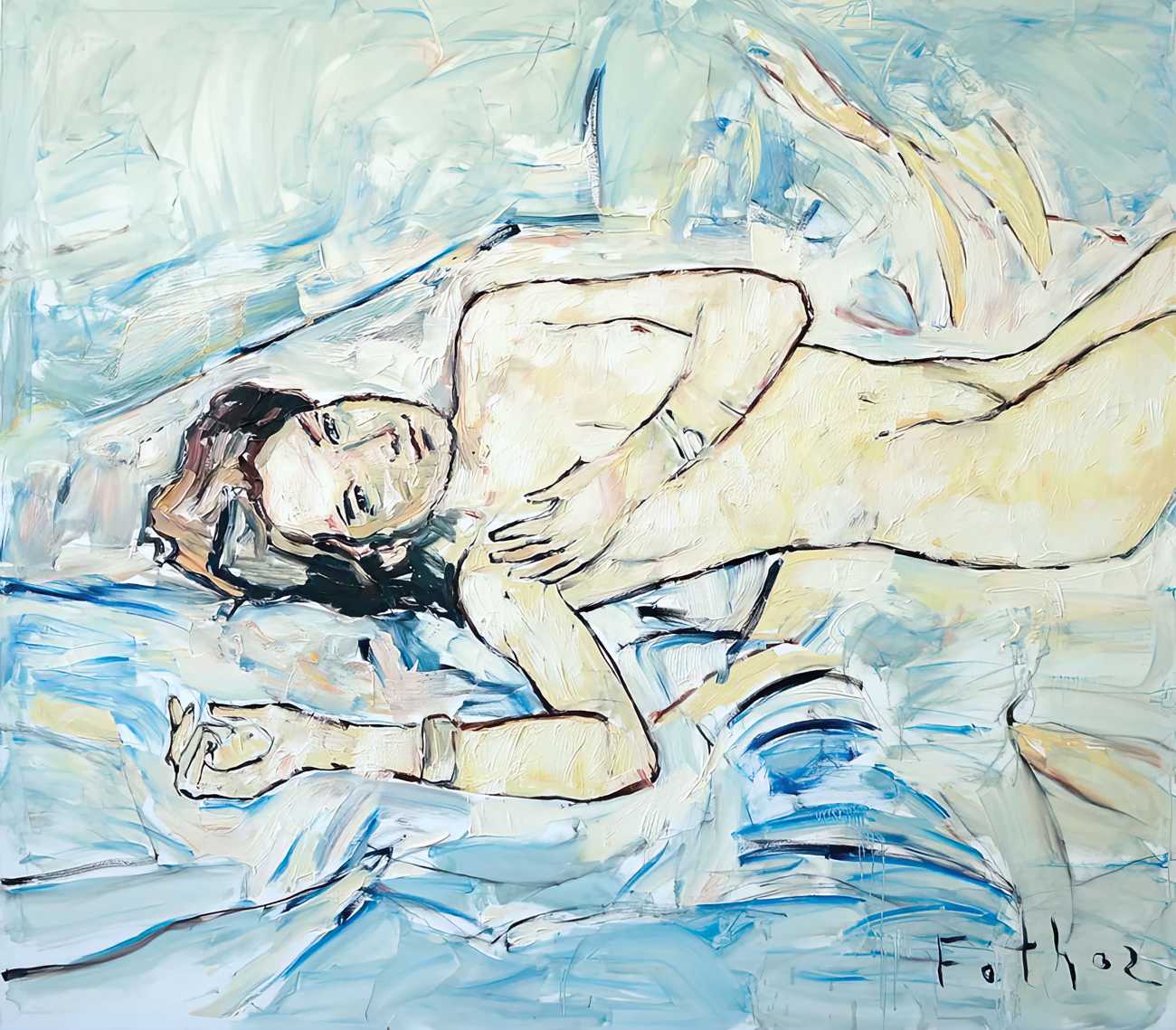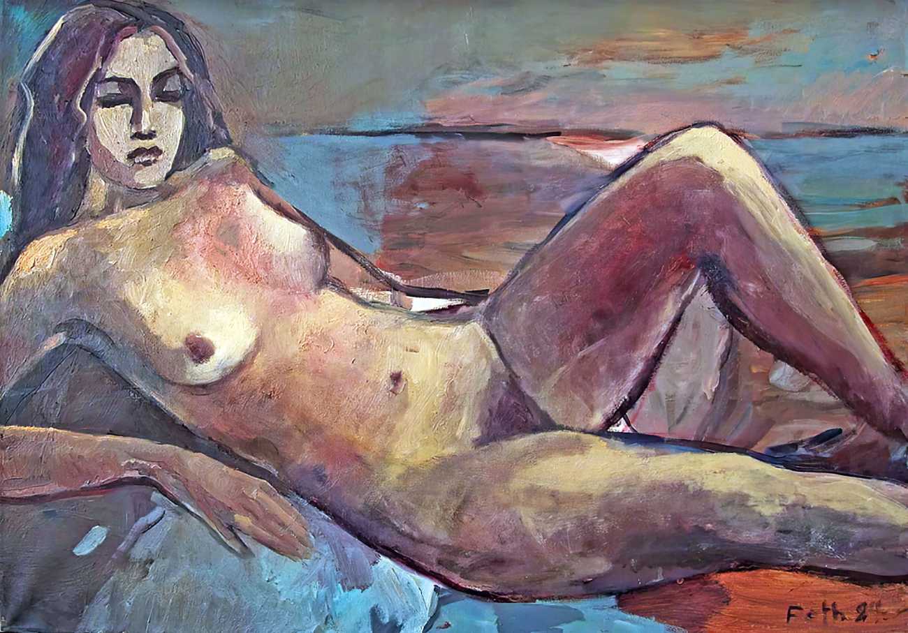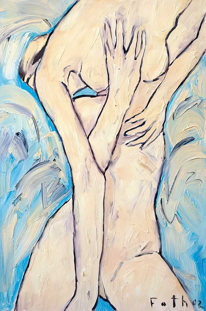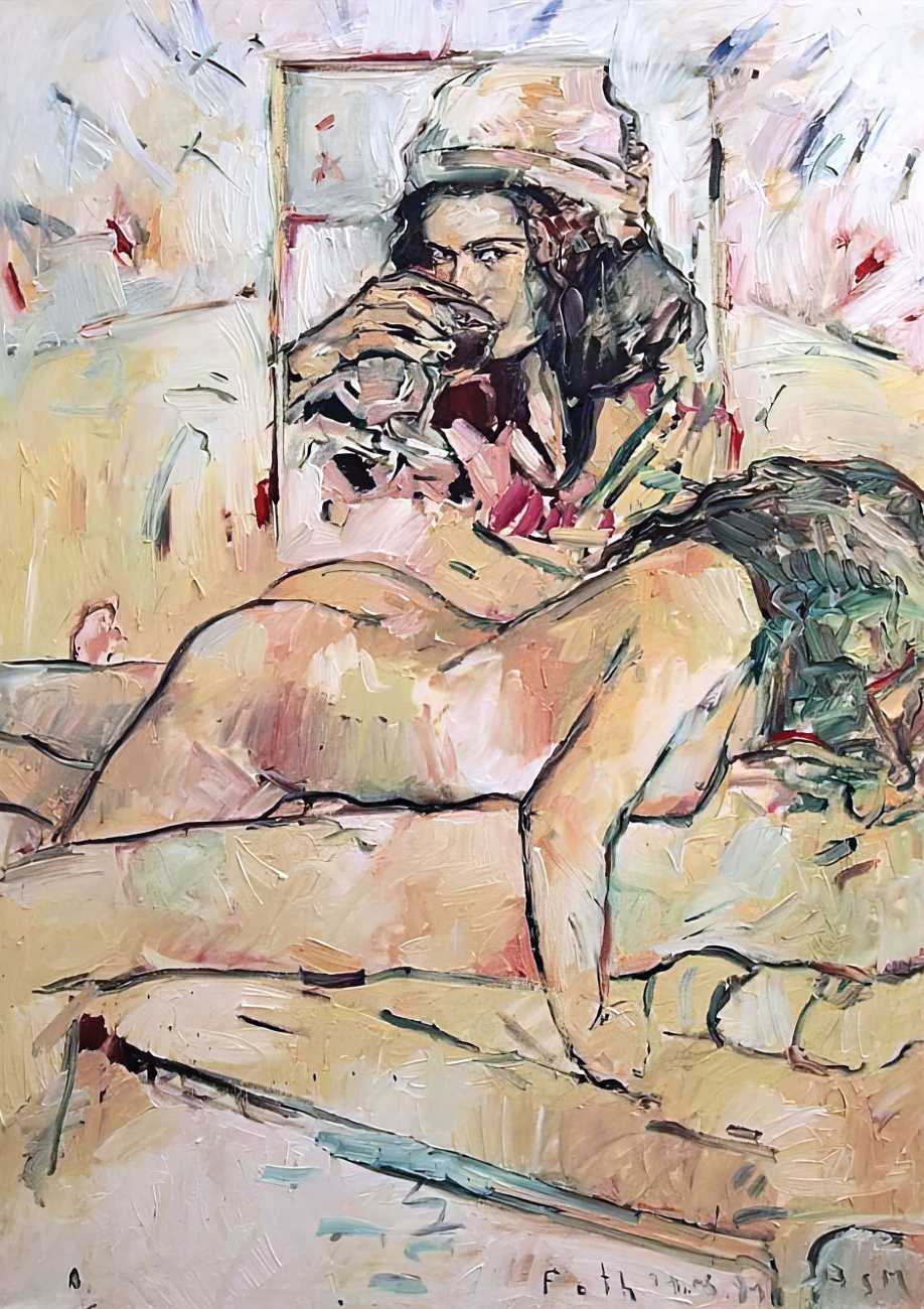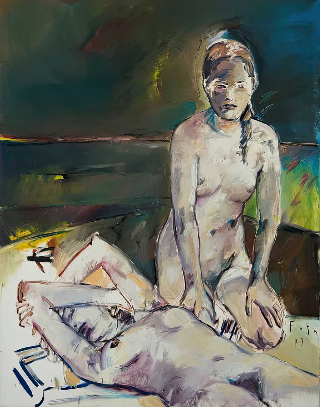 Throughout his career Detlev Foth has repeatedly returned to the naked body as a central subject, both singly in paintings and drawings of female models (sometimes including himself), and also in scenes of sexual and sensual encounter. When working on his large paintings of naked bodies he often likes to work naked himself, a real commitment to both subject and the work in progress.
