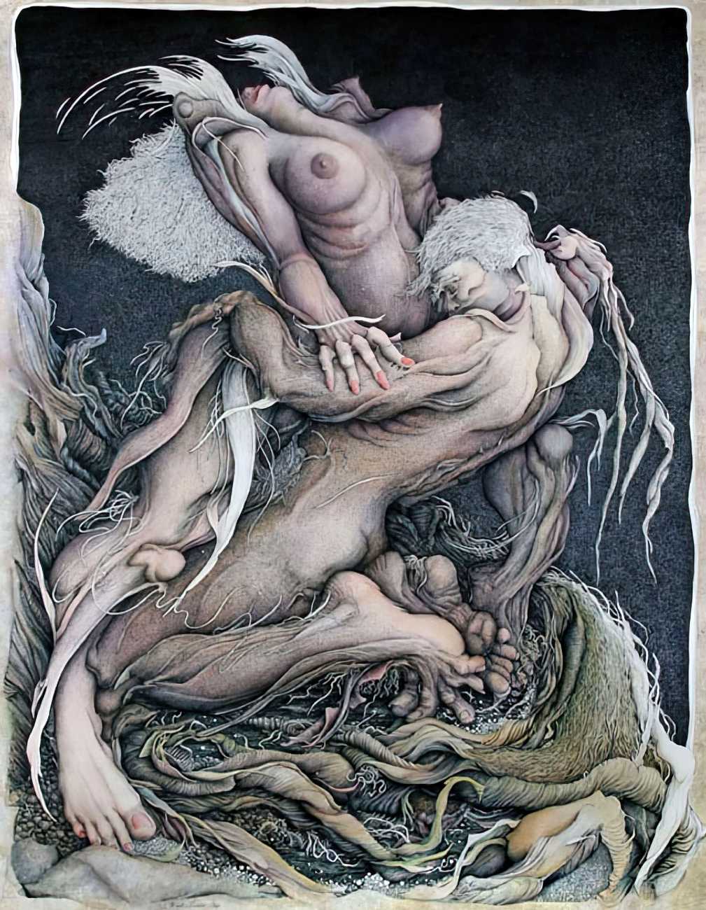 On a much smaller scale, Gay has produced art in many different media. Over the years she has produced sculptures, prints, drawings and paintings, sometimes combining two or more techniques in one piece. Several of her paintings contain sculptural elements, especially those made before 2003, while paintings made since then often feature warped and tangled landscapes. Of her sculptures, the Chrysalides, haunting hollow fibreglass figures, are the most prominent, reappearing in several forms over the years.