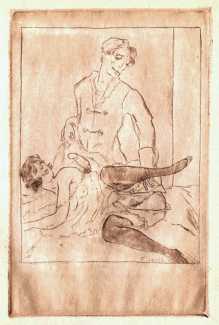 ‘E. Bénis’ is one of those many 1920s amateur erotic artists whose identity is hidden behind a pseudonym, and who have consequently virtually disappeared from history. Just four portfolios from the early 1920s are known – Aventures d’un Bohémien (Adventures of a Bohemian), Die Halbjungfrau (The Semi-Virgin), Erlebnisse eines 16jährigen Mädchens, Wanda (Experiences of a 16-year-old Girl, Wanda), and Lucette und ihre Freunde (Lucette and Her Friends) – and only a handful of the plates bear the Bénis signature. The only way we know that they are all by the same hand is that this artist can only draw two protagonists, a rather sad-looking man with a square chin and an impossibly slim woman with small pointy breasts.
