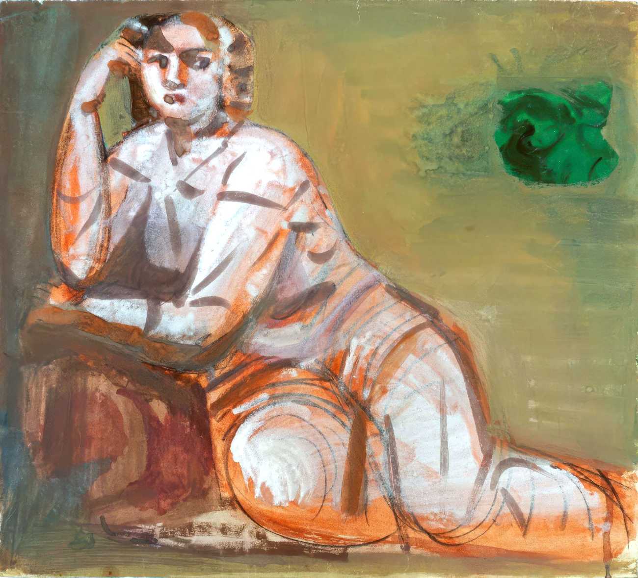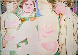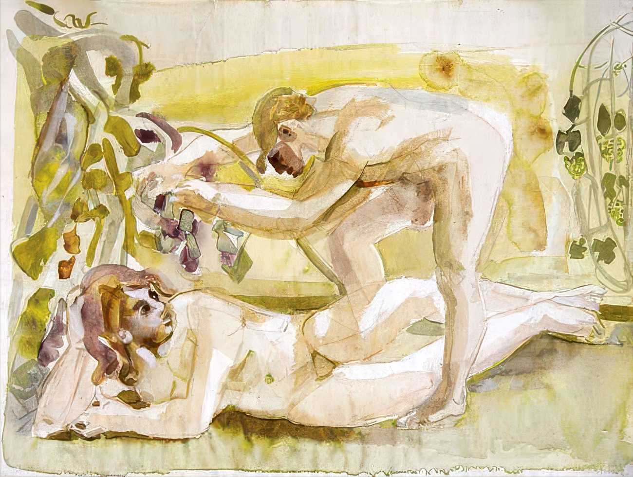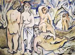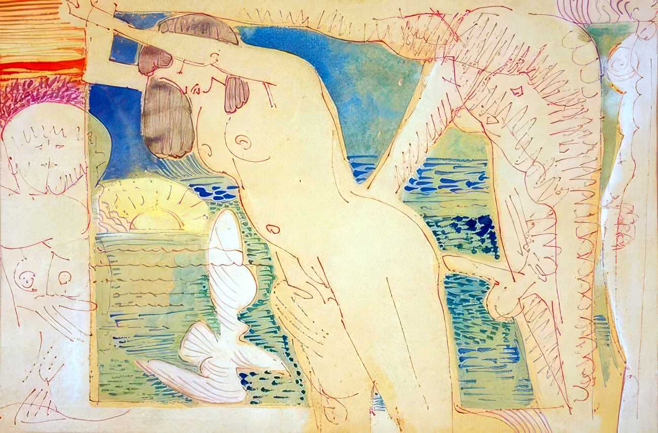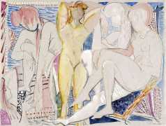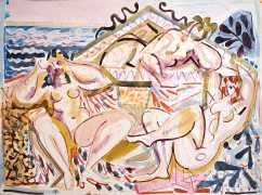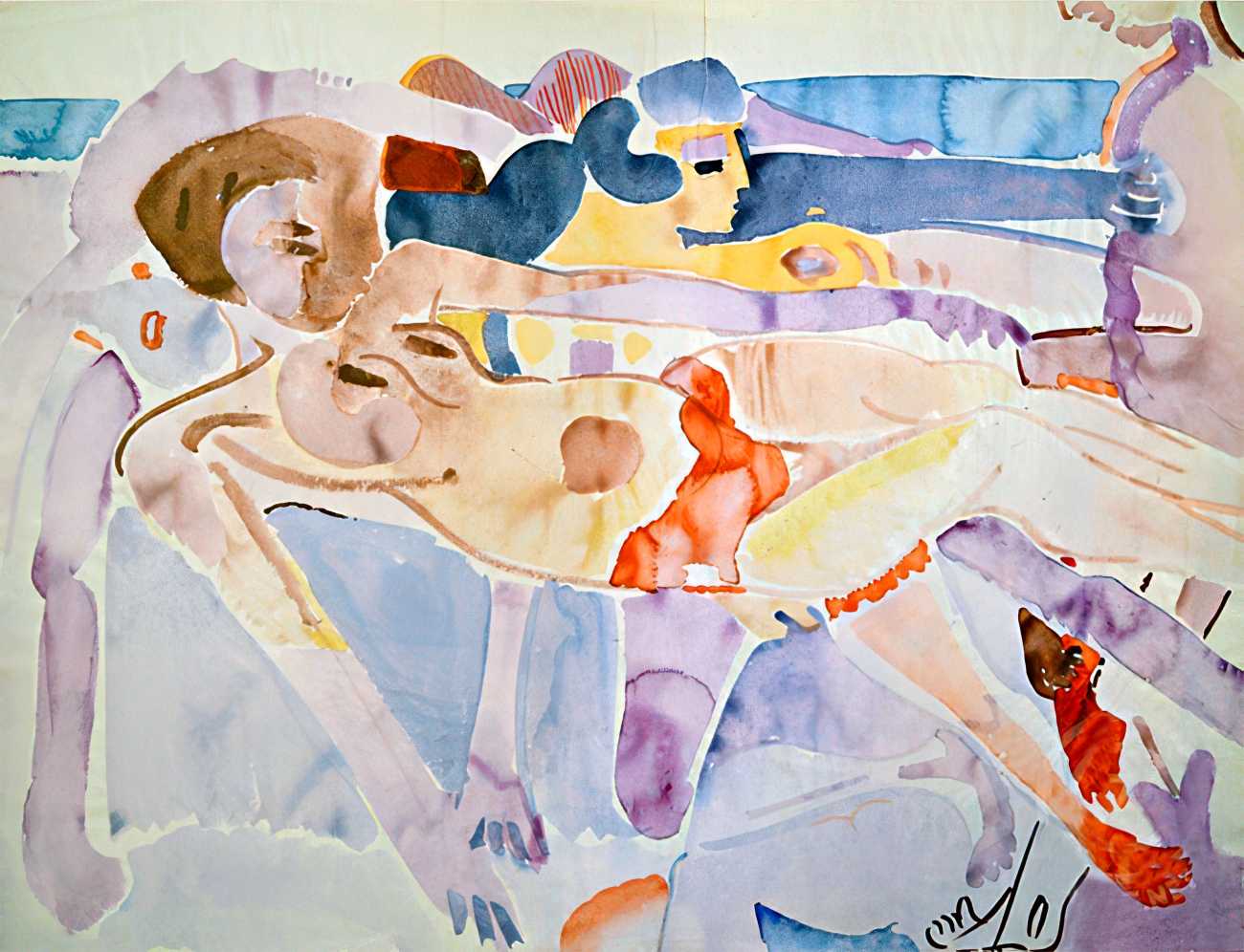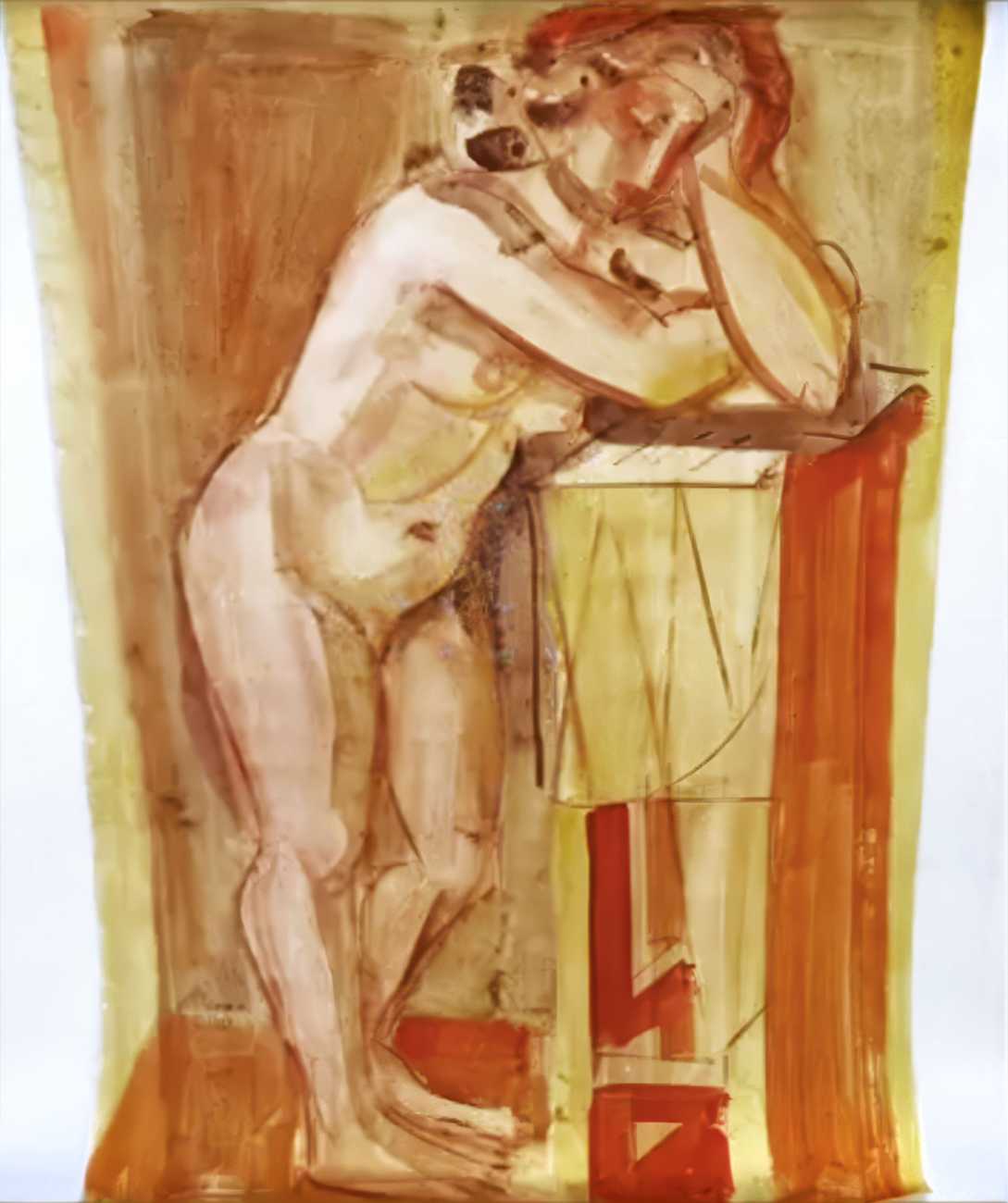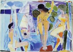 Frank held his own during the great wave of non-representational painting between 1950 and 1965 with his representational art. However, one senses his inner struggle with the temporary dominance of international non-figurative art. He utilised the insights he gained from observing the paintings of artists like Wilhelm Nay, but remained true to his vision of creating idealised images of humanity in a modern world using classical standards, thus aligning himself with Werner Gilles, Rolf Müller-Landau, and other Italian-German artists of his time. Spatiality became increasingly two-dimensional. While in the 1940s and 50s he designed his scenes like small stage sets, in which the figures, like statues, were assigned their places on a narrow action space, in the 1960s they became increasingly integrated with the painted surface.