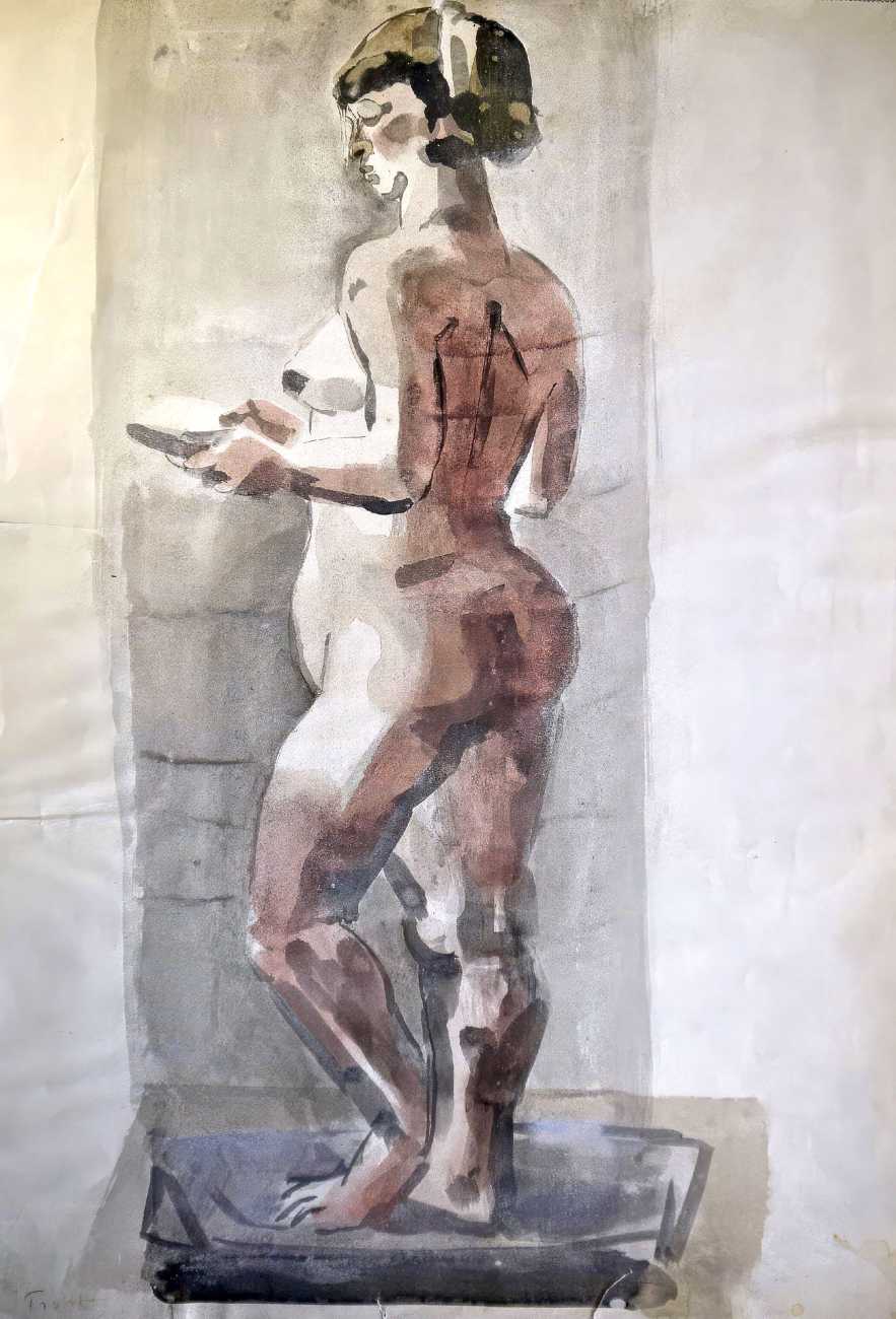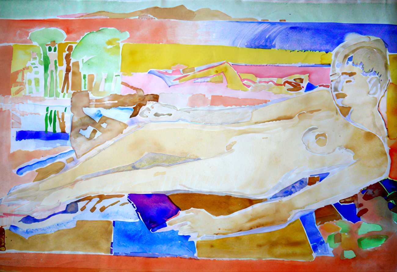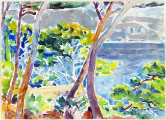 Frank’s watercolours were first seen together in a larger group at the 1965 exhibition of the Koblenz Künstlerhaus Metternich: until then even his friends had been virtually unaware of many of these paintings. The judiciously curated 1965 exhibition showcased exquisite examples of his bright-toned oil paintings. Southern sun, Italian coastlines, golden-yellow landscapes, and turquoise distances shone in unbroken colours. Through these images, visions of a purified existence, one could glimpse the deep longing of this solitary man, who, although he had some friends and caring female companions, nevertheless gave the impression of a kindly, melancholic hermit, frightened by the world’s material bustle and brutality.