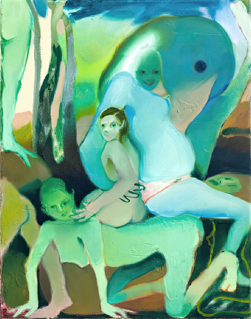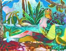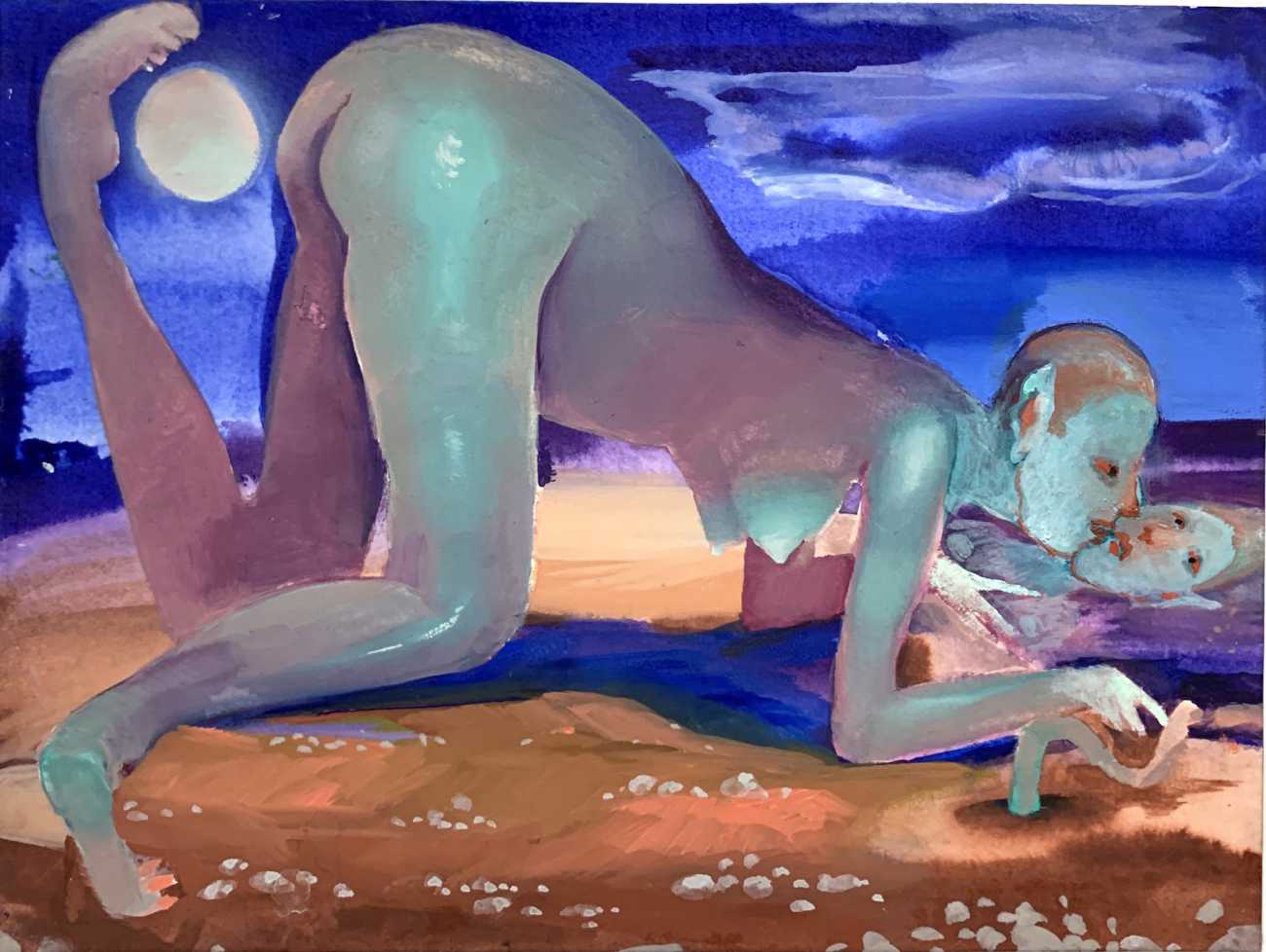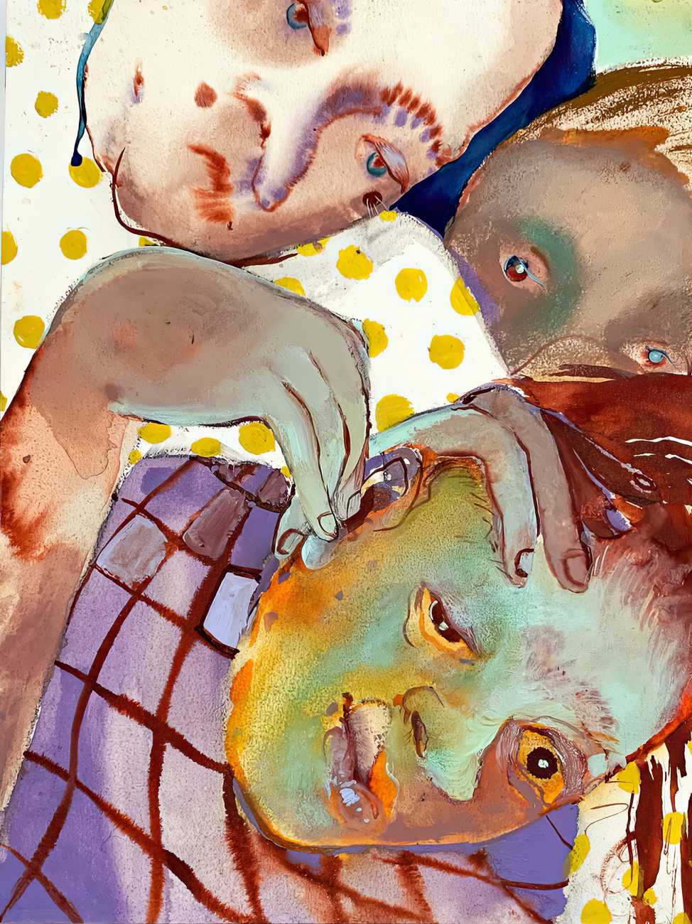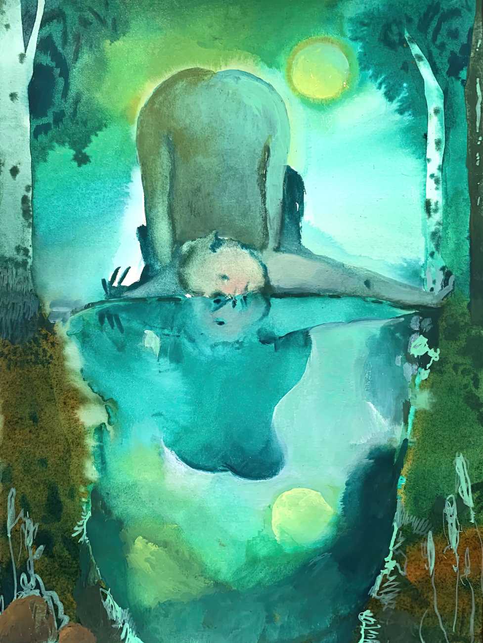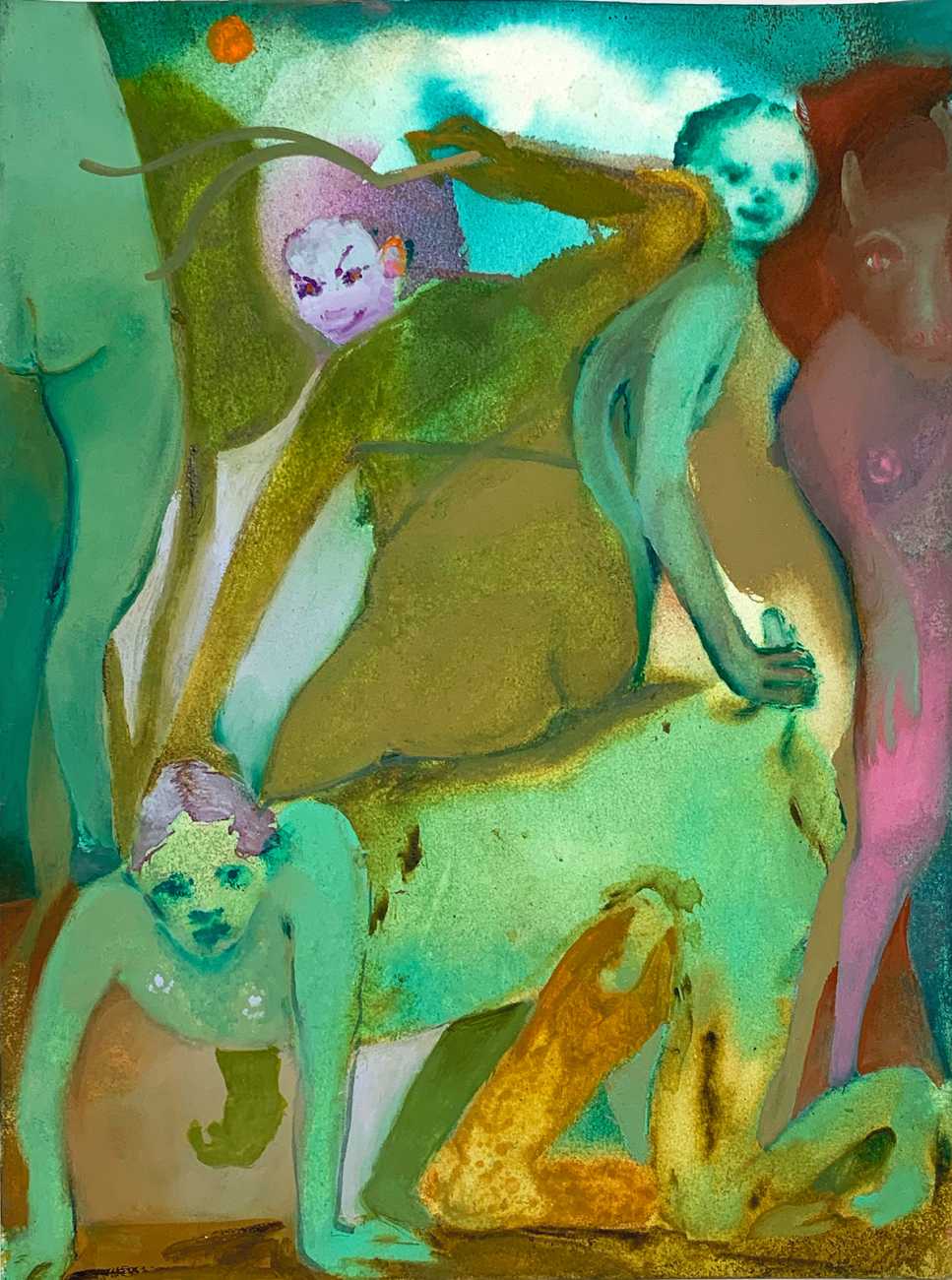 Glaessner uses water-dispersed pigment and inks in her absorbing, vibrant scenes and portraits. Her paintings, shifting between reality and dreamlike settings, explore humans in all their imperfect forms, including elements from nature, mythology, and her own personal experiences. She works with different painting processes and techniques to build on a personal narrative drawing on memory, ritual, contemporary culture, art history, cultural myths and folklore, constantly moving between figuration and abstraction but always using colour as the language.