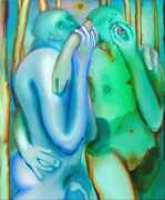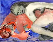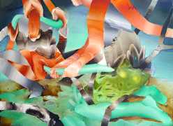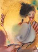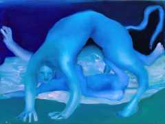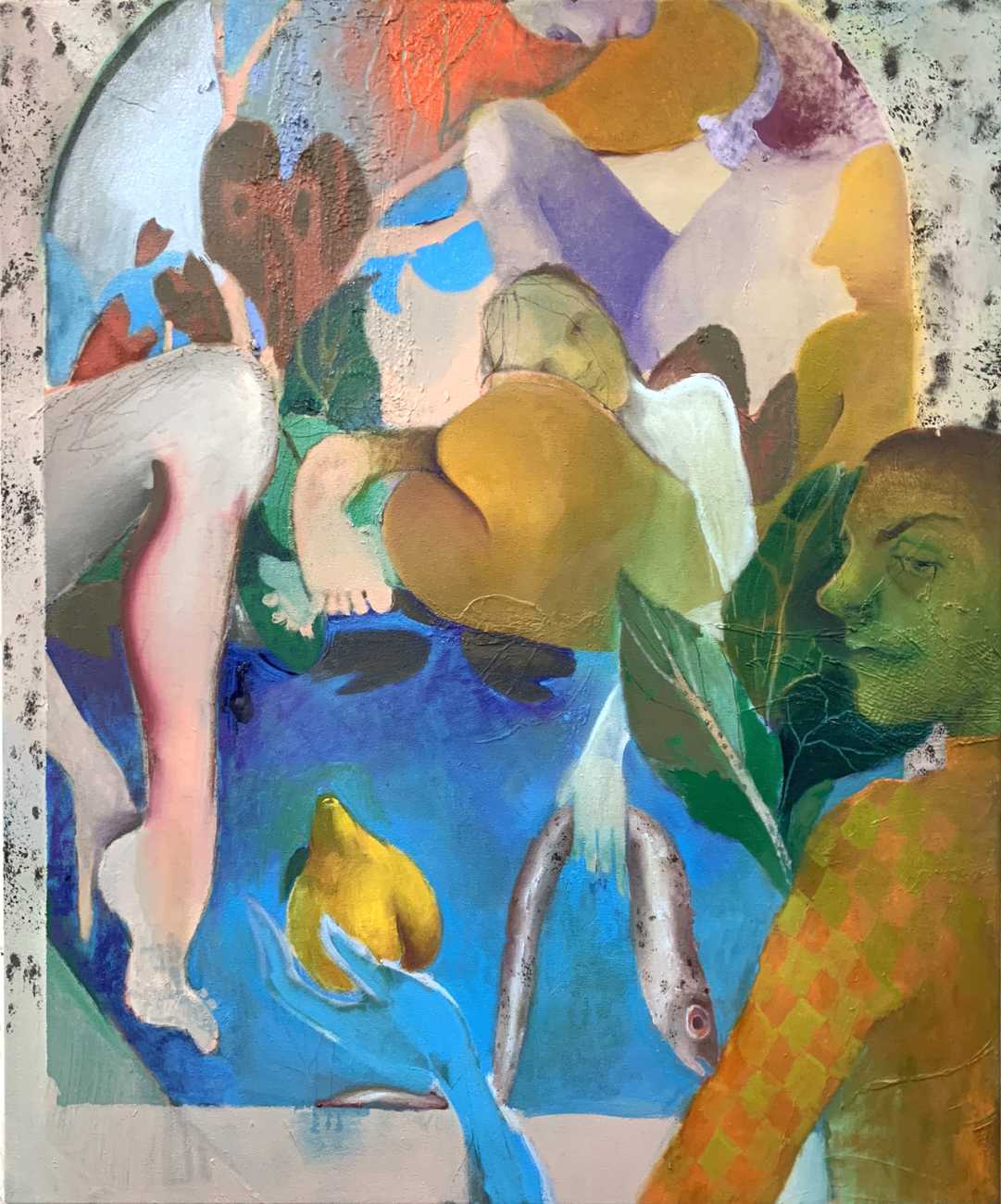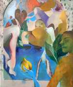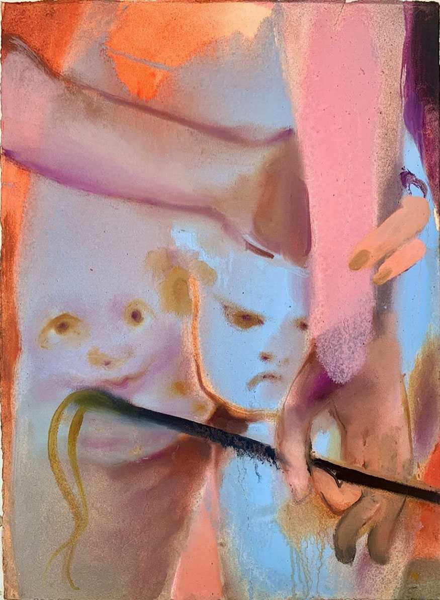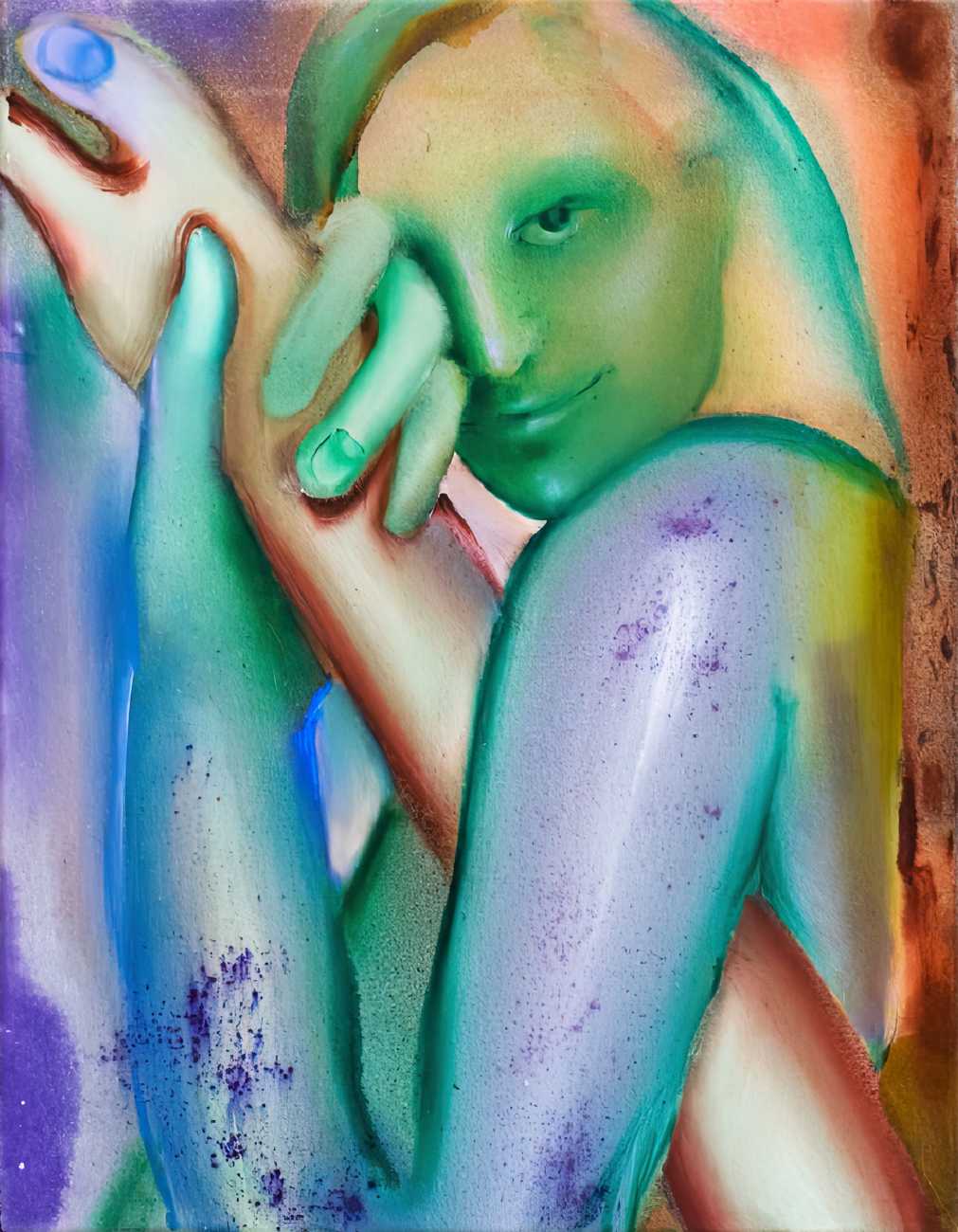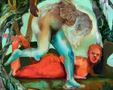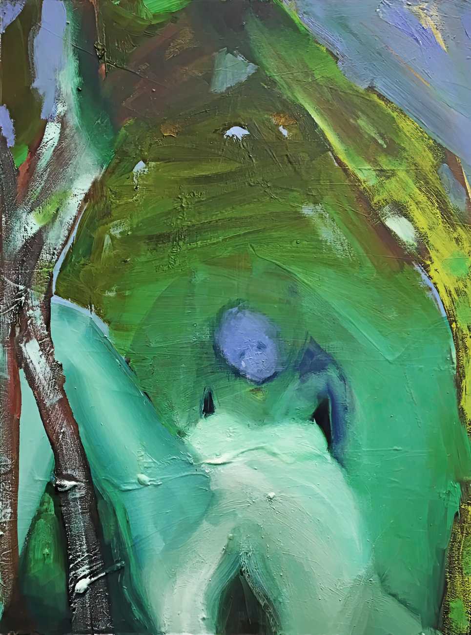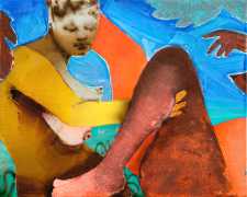 Glaessner uses water-dispersed pigment and inks in her absorbing, vibrant scenes and portraits. Her paintings, shifting between reality and dreamlike settings, explore humans in all their imperfect forms, including elements from nature, mythology, and her own personal experiences. She works with different painting processes and techniques to build on a personal narrative drawing on memory, ritual, contemporary culture, art history, cultural myths and folklore, constantly moving between figuration and abstraction but always using colour as the language.