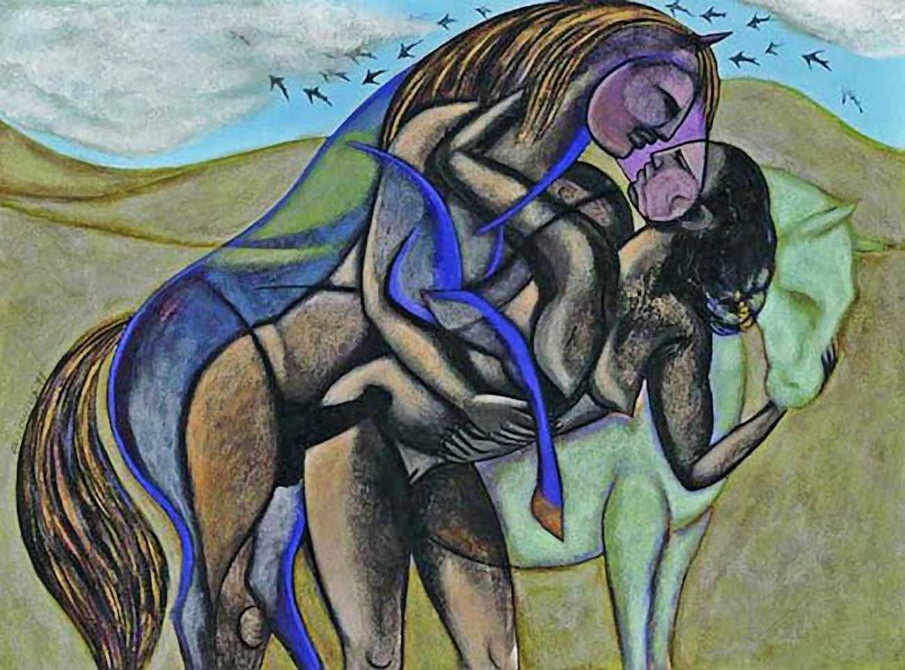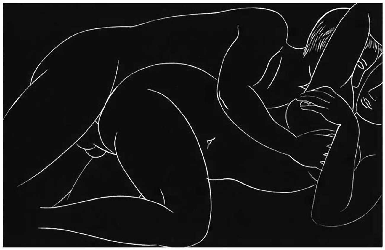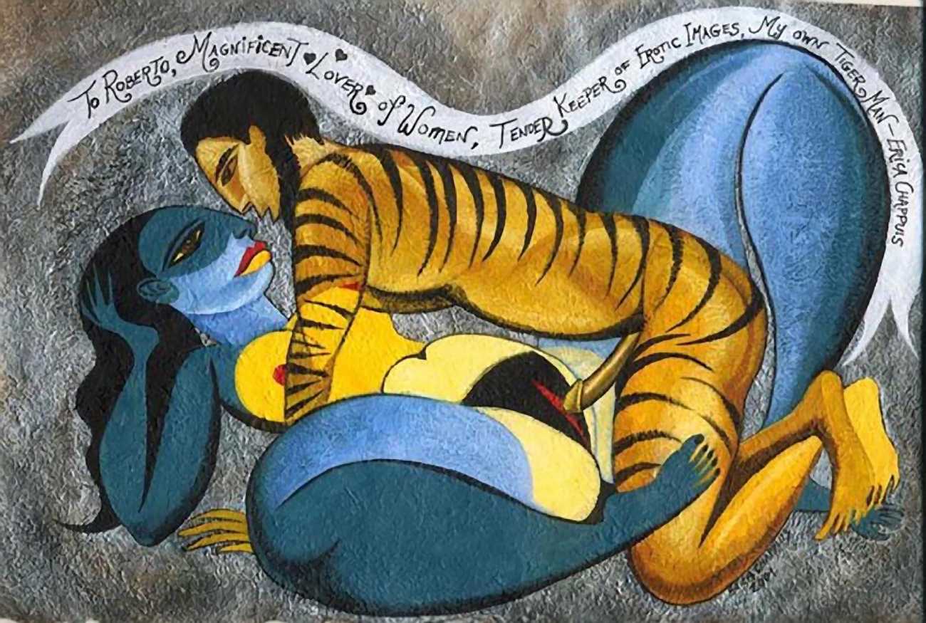 Erica set up her studio in Detroit in 1982, and has been a practicing artist ever since, specialising in figurative subjects. During the 1990s much of her work included more or less erotic themes, bold paintings exploring the relationship between the sensual connections between human bodies and nature, and black and white etchings of more explicitly sexual couplings. It is these themes we feature here, though we recommend a visit to Erica’s website, where similar powerful themes of the sea and voyaging are expanded. Her erotic work is included in the collections of the Erotic Art Museum in Barcelona and the Kinsey Institute at Indiana University.