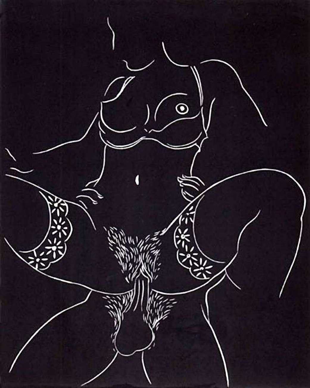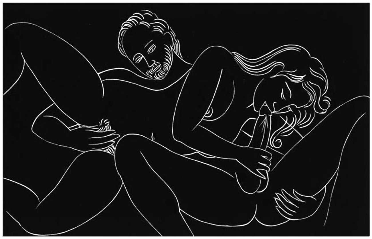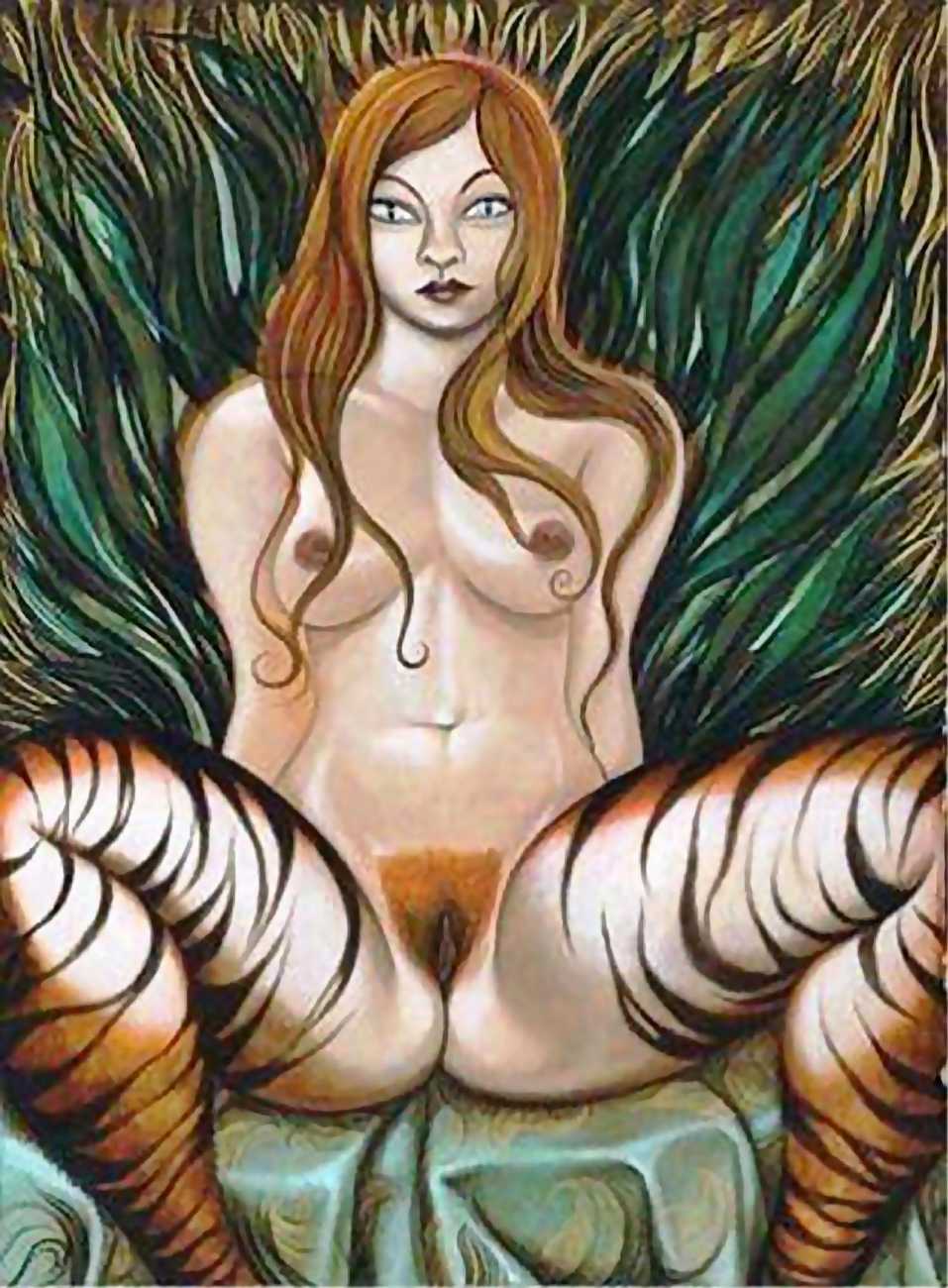 Erica set up her studio in Detroit in 1982, and has been a practicing artist ever since, specialising in figurative subjects. During the 1990s much of her work included more or less erotic themes, bold paintings exploring the relationship between the sensual connections between human bodies and nature, and black and white etchings of more explicitly sexual couplings. It is these themes we feature here, though we recommend a visit to Erica’s website, where similar powerful themes of the sea and voyaging are expanded. Her erotic work is included in the collections of the Erotic Art Museum in Barcelona and the Kinsey Institute at Indiana University.