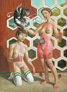 Erik Thor Sandberg creates dark dreamscapes where the protagonists live engulfed in the chaos of a decadent dance of interactions which verge on lucid madness. His painting creates magic illusions in an uncanny connection between oil paints and human flesh. The bodies portrayed are simultaneously beautiful and grotesque, and their impending actions within the narrative constitute visceral allegories which present a psychological portrait of us as a species, with all our failings, vices and virtues, confusion and hope, paranoia and striving for freedom. The themes vary, but the fundamental goal is to show different facets of humanity in an unflinching contrast between what is beautiful and good and what is bad or ugly.
