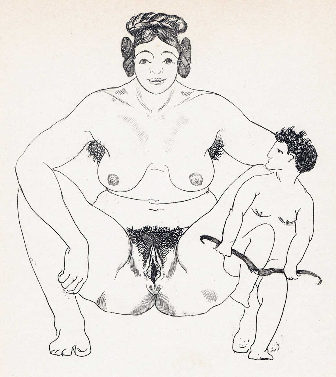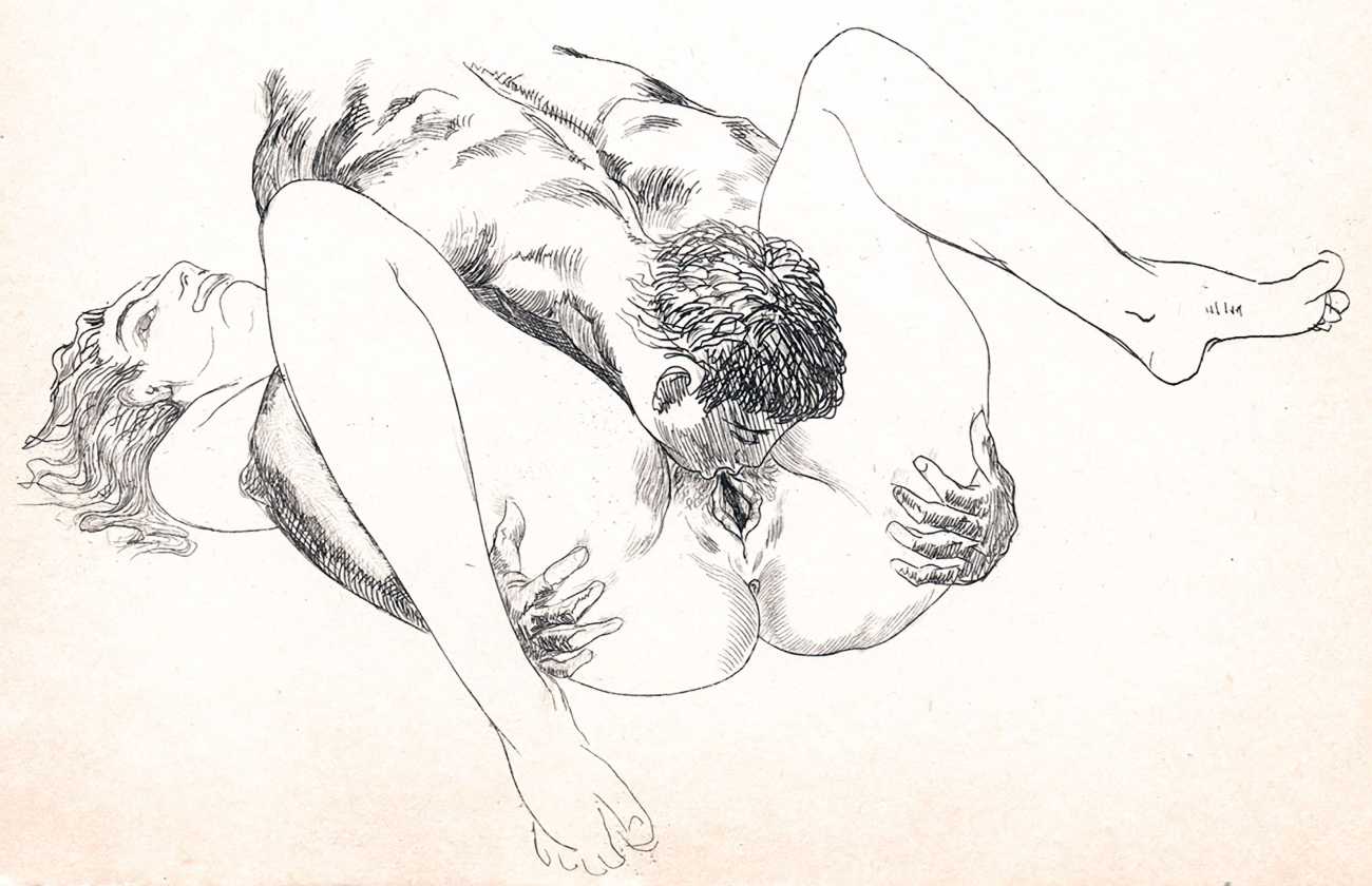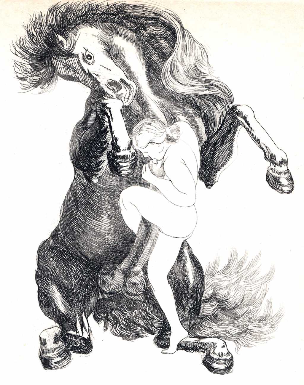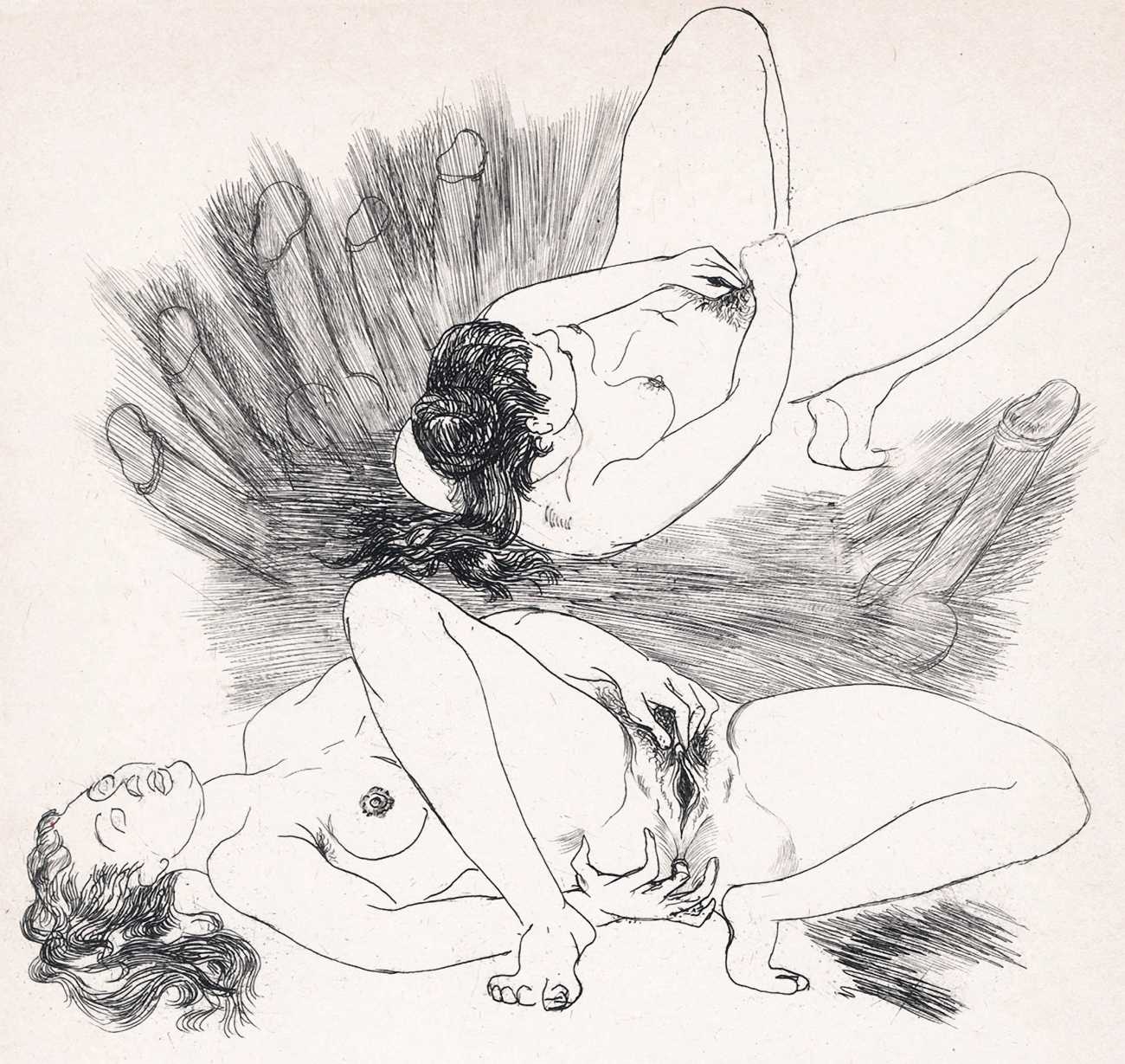 Hertenberger was in his late sixties, still single, when he was commissioned by a group of friends to illustrate by far his most explicitly sexual portfolio, Le trophée des vulves légendaires (The Prize for Legendary Vulvas), its simple style quite different from the detailed etchings he was known for. We know nothing of his personal life at the time, but he certainly knew how to draw female genitalia. His last major book commissions were in 1949 for editions of the Eumenides of Aeschylus and La Fontaine’s Fables.
