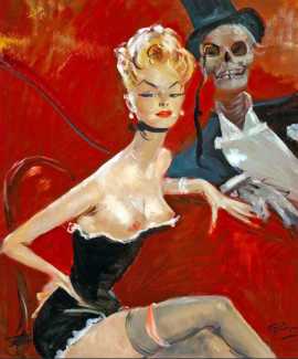 Feted by his audience in his heyday, Domergue’s style quickly went out of fashion, his enormous output of paintings of semi-nude women written off as stereotyped, rushed and repetitive. It could be said that his popularity got the better of his creativity, and that once he had found a style that sold he stopped experimenting. His favourite painting of a young woman with death looking over her shoulder was maybe a pensive hint at his own understanding of the lifespan of a popular artist.