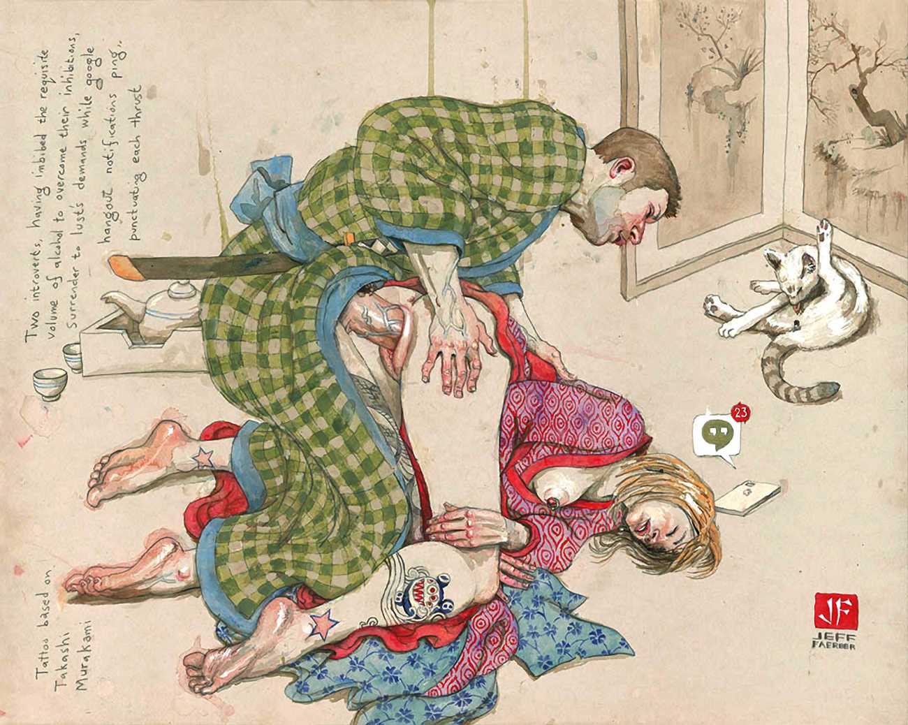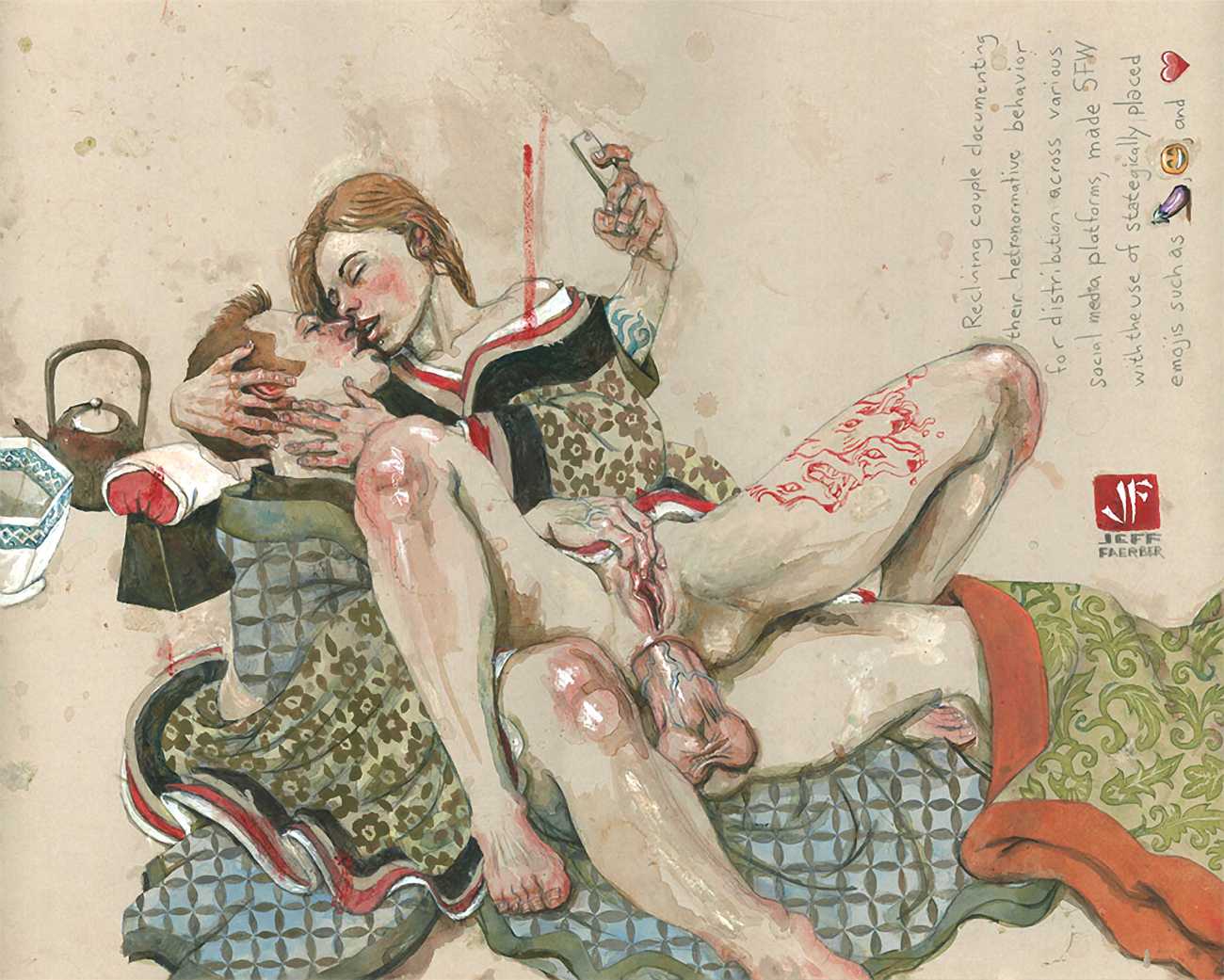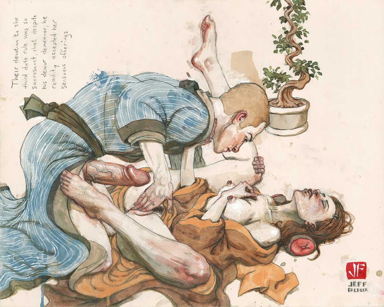 The American artist Jeff Faerber grew up in San José, California, and studied art at San José State University and the School of Visual Arts in New York. Since leaving college he has settled in Brooklyn, in a studio and apartment which he shares with his partner and cats. His paintings have appeared regularly in exhibitions in New York and further afield.
