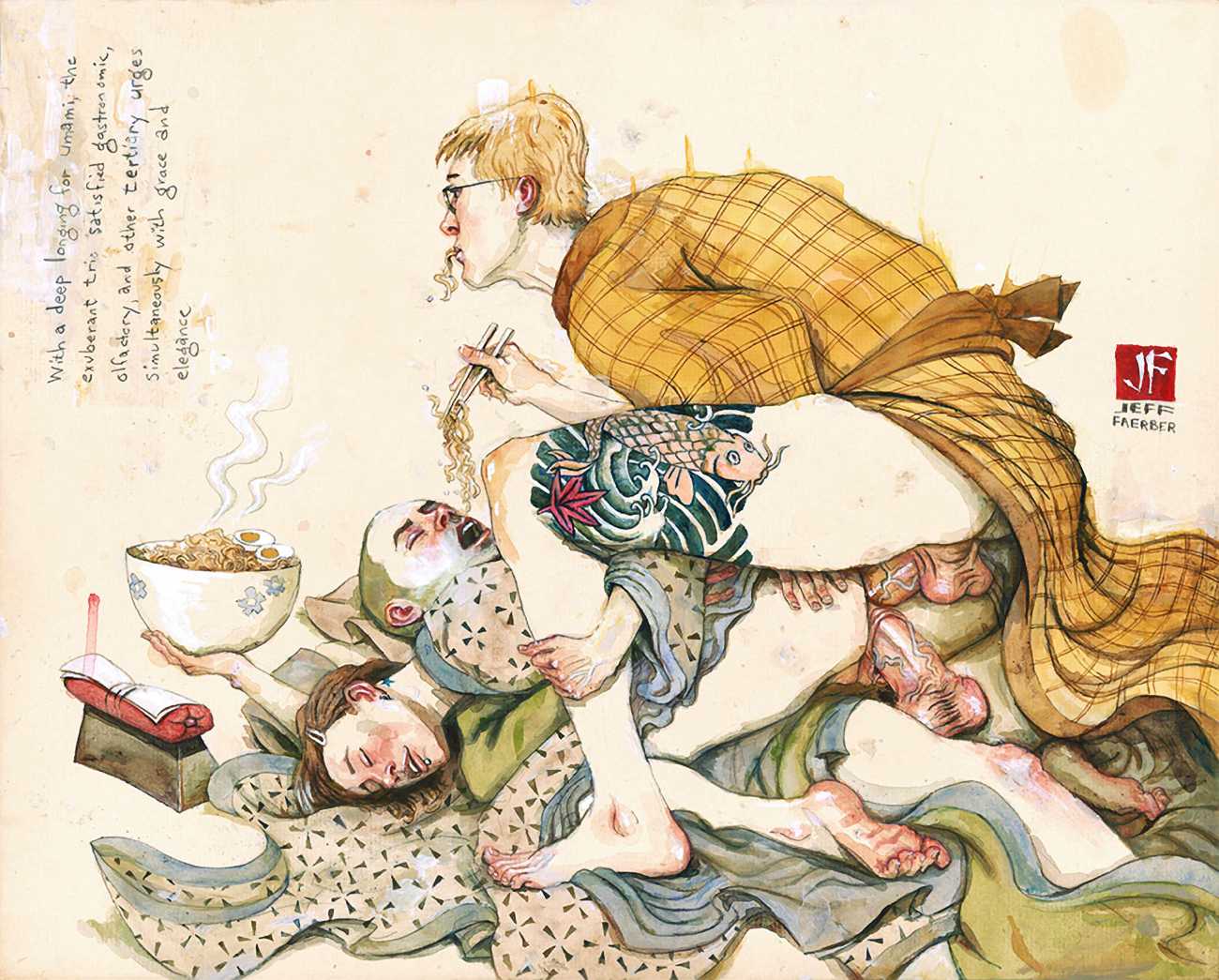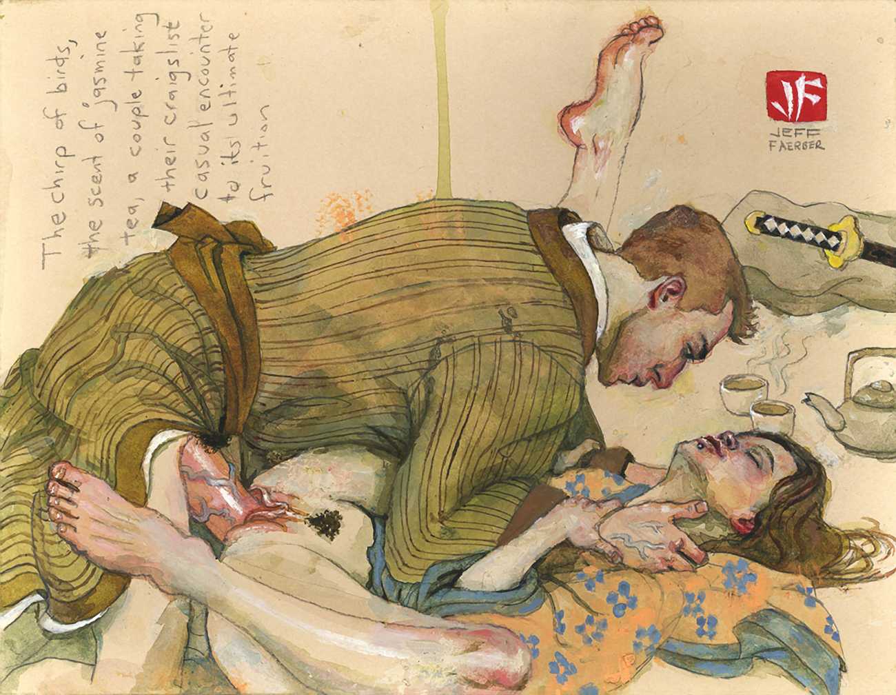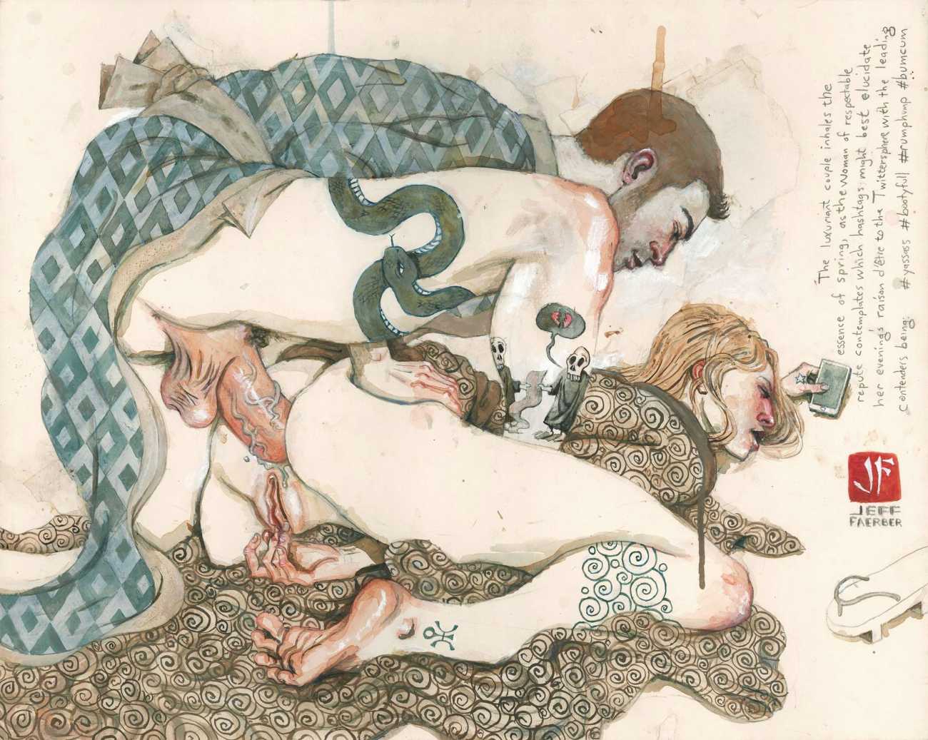 Jeff Faerber’s website, with many more examples of his work including New York cityscapes, portraits, and even the beginnings of a highly original Tarot, can be found here.