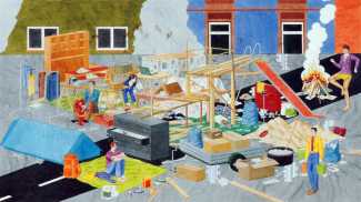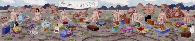 In Spehr’s colourful compositions the most diverse and chaotic group scenes are depicted, which often have neither a temporal nor a content-related context, but offer us experimental arrangements of people mixing together. What is this strange community that builds its living quarters under the earth? And what is that masked group fighting for? Are the children taking over power in this city of ruins? Spehr is an enthusiastic storyteller who tells of a world that has gone off the rails, confused and disturbed, a world in which we find important links to our own world, with all its ruptures, crises and incomprehensibility. In exaggerating different aspects of human behaviour, Spehr succeeds in sharpening and questioning our sense of our own hopes, fears and anxieties.