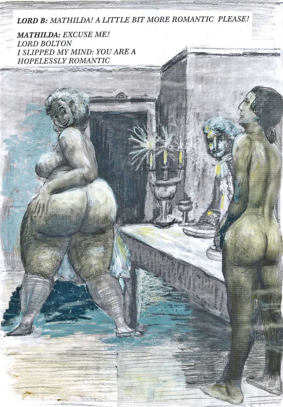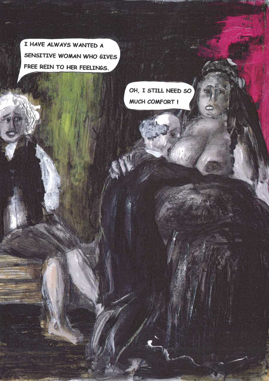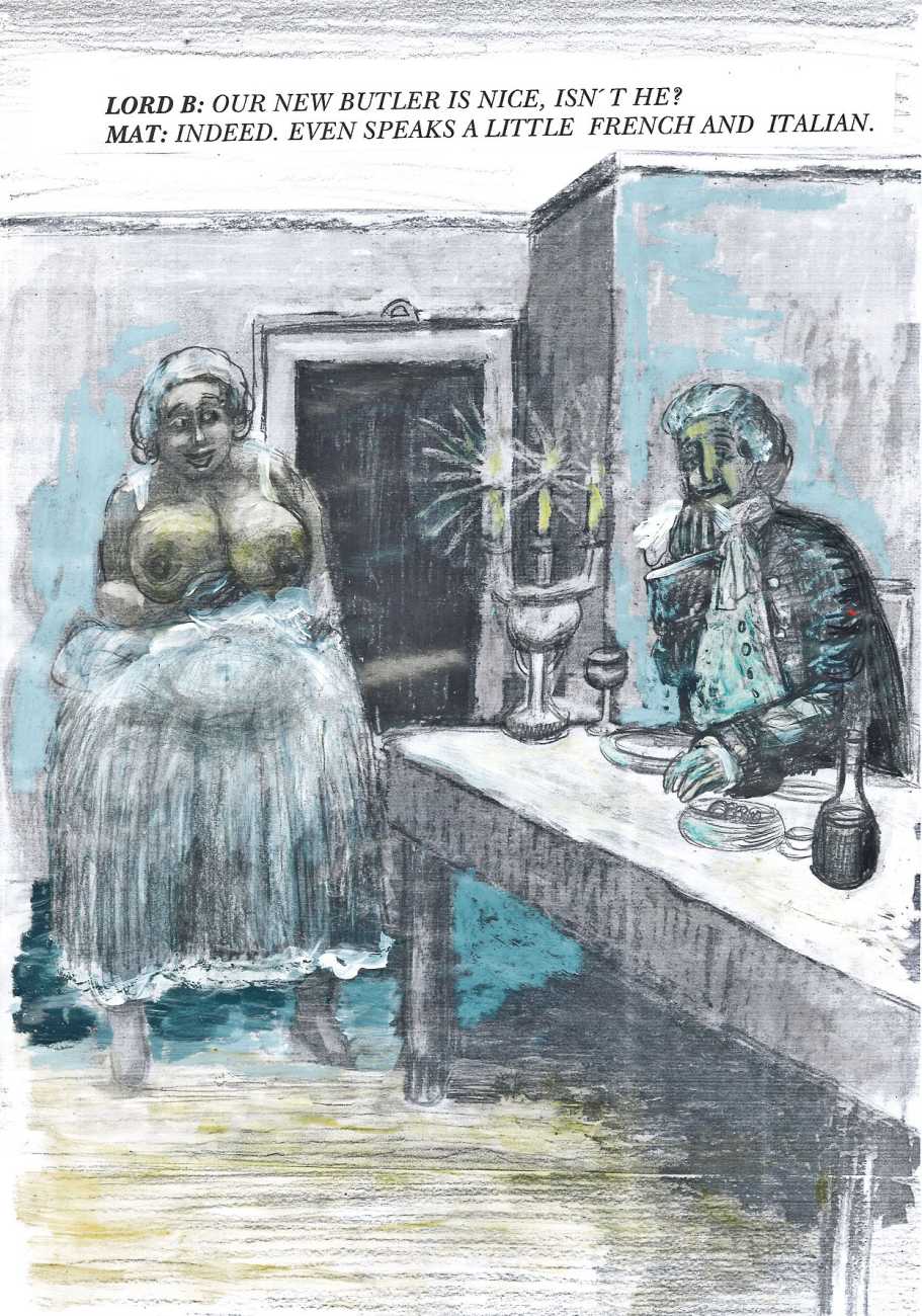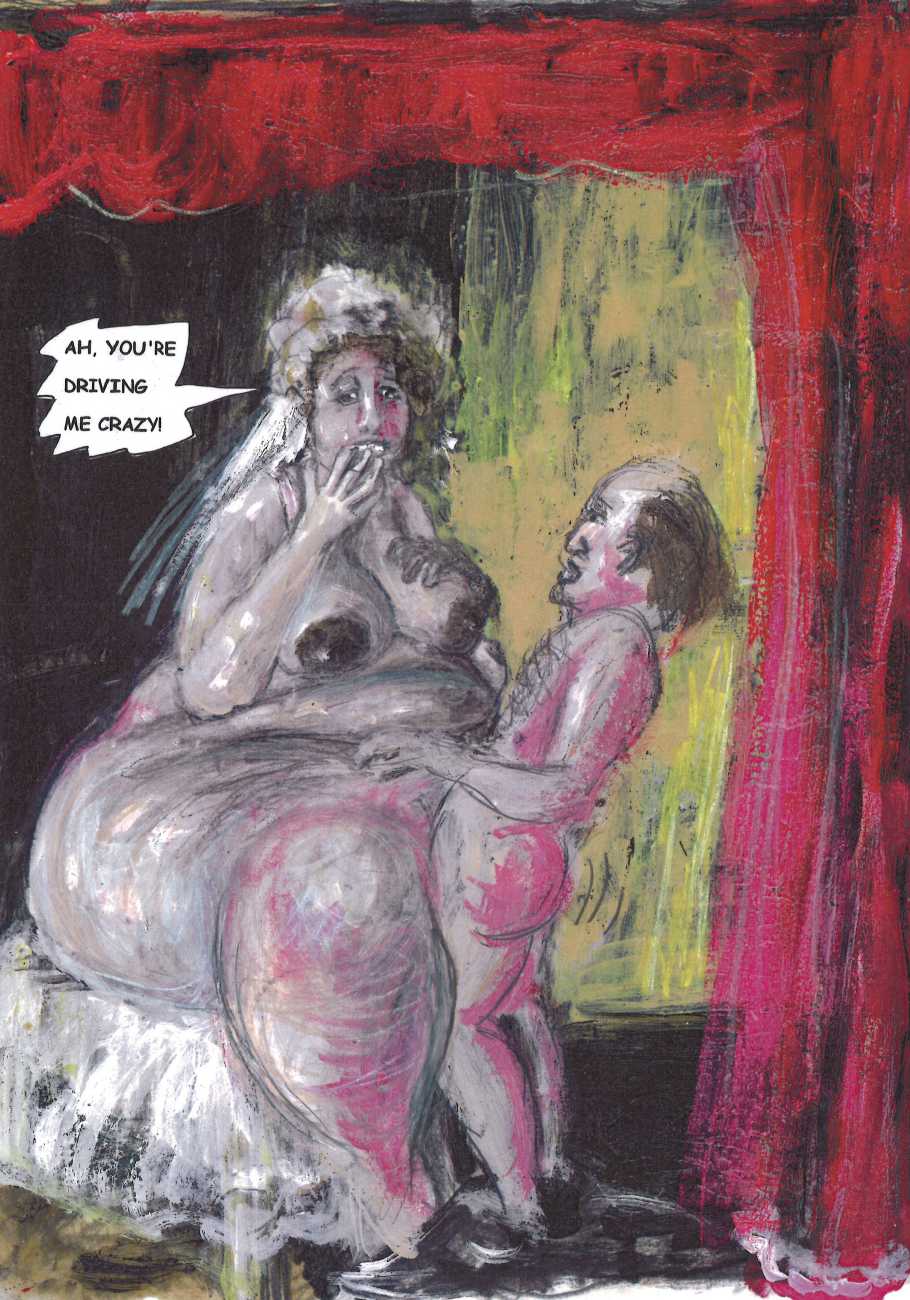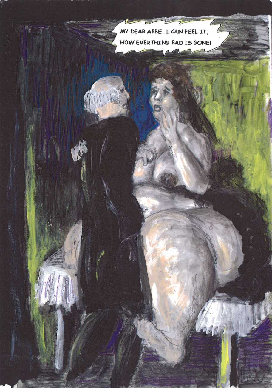 A majority of my images belong to graphic novels. Here too I am a blatant outsider, because my stories – mostly on historical subjects – follow the old tradition of picture stories. Thematically I process classic material such as Boccaccio’s Decameron, stories from the Bible, Lady Chatterley’s Lover, and the life of the philosopher Rousseau, but I have also created my own narratives such as the abbey on the banks of the Meuse or the Pygmalion project. Over time I have created well over 1,200 illustrations, and will continue to add new ones as long as I don’t find myself in a deep, sad hole again or terrible political events throw me off course.